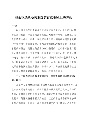 在全市统战系统主题教育读书班上的讲话同志们:以中国式现代化全面推进中华民族伟大复兴,是党的XX大擘画的宏伟蓝图。作为贯彻落实党的XX大精神行动化、具体化、实践化的重大举措,市委、市政府作出了深入实施推动高质量发展十项行动的部署安排。贯彻落实党的XX大精神是统一战线的首要政治任务,关键就是落实XXXXXX强调的五个牢牢把握要求,在全面学习、全面把握、全面落实上下功夫,统一思想、统一意志、统一行动,推动学习贯彻XXX新时代中国特色社会主义思想主题教育走深走实,持续做好深化、内化、转化工作,引导统战干部和统战成员全力服务十项行动,为全面建设社会主义现代化大都市汇聚磅礴伟力。下面,我讲几点意见。一、不断推动主题教育走深走实,坚持不懈用党的创新理论凝心铸魂开展学习贯彻XXX新时代中国特色社会主义思想主题教育,是统一全党思想意志行动、始终保持党的强大凝聚力战斗力的必然要求,是推动全党积极担当作为、不断开创事业发展新局面的必然要求,是深入推进全面从严治党、以党的自我革命引领社会革命的必然要求。全市统一战线学习贯彻党的XX大精神,必须深化主题教育成效,着力在深化、内化、转化上下功夫,以学铸魂、以学增智、以学正风、以学促干,用党的创新理论凝心铸魂、指引方向、推动发展。1.在深化上用情铸忠诚,坚定理想信念,坚持人民至上深刻把握XXX新时代中国特色社会主义思想的科学体系、核心要义实践要求,深刻领会这一重要思想的历史逻辑、理论逻辑、实践逻辑和蕴含其中的道理学理哲理。统一战线是党领导的统一战线学习贯彻党的XX大精神,必须把深入学、深刻悟、深情讲、深化用结合起来,以学铸魂,深刻领悟两个确立的决定性意义,旗帜鲜明讲政治,在政治立场、政治方向、政治原则、政治道路上始终同以XXX同志为核心的党中央保持高度一致。把坚定理想信念作为安身立命之本,筑牢对党忠诚这个根本政治规矩,筑牢人民立场这个根本政治立场,引导统战干部和统战成员不断增强四个意识、坚定四个自信,坚定拥护两个确立、坚决做到两个维护。2.在内化上用心长本领,认真落实XXXXXX关于做好新时代党的统一战线工作的重要思想。党的XX大报告用六个必须坚持对XXX新时代中国特色社会主义思想的世界观、方法论和贯穿其中的立场观点方法作了概括阐述。要坚持以学增智,用党的科学理论悟规律、明方向、学方法、增智慧,结合统战工作深刻领悟六个必须坚持的核心要义,运用其观察问题、分析问题、解决问题,不断提升政治能力、思维能力和实践能力。对于统战工作而言,重点是运用六个必须坚持深入学习贯彻好XXXXXX关于做好新时代党的统一战线工作的重要思想,深刻理解十二个必须,准确把握四对关系,做到学思用贯通、知信行统一,不断提高推动统战工作高质量发展的本领能力。3.在转化上用力见成效,把学习成效转化为统战事业高质量发展的显著成果。看主题教育成效,关键看行动、见效果,把学习效果转化为推动统战工作高质量发展的行动和效果。要坚持以学正风、以学促干,在改造主观世界的同时改造客观世界。树立正确政绩观,把握好统战工作潜绩和显绩的关系,既做看得见的显绩,更要做打基础利长远的潜绩,不务虚功,只务实功,脚踏实地、步步为营,持之以恒、久久为功。提振锐意进取、担当有为的精气神,铭记党把干部放在各个岗位上,就是要大家担当干事,以时时放心不下的责任感恪尽职守、担当作为围绕市委、市政府中心工作,引导统战成员投身十项行动,坚决做到XXX有号令、党中央有部署、市委有要求、统战见行动,以推动统战工作高质量发展的新成效检验主题教育成果,努力创造经得起历史和人民检验的实绩。二、深刻把握新时代新征程党的使命任务,充分发挥统一战线强大法宝作用XXXXXX在党的XX大上强调:人心是最大的政治,统一战线是凝聚人心、汇聚力量的强大法宝。完善大统战工作格局,坚持大团结大联合,动员全体中华儿女围绕实现中华民族伟大复兴中国梦一起来想、一起来干。这是立足党在新时代新征程上全面建成社会主义现代化强国、以中国式现代化全面推进中华民族伟大复兴的中心任务作出的战略部署。全市统一战线要紧紧围绕党的XX大确定的目标任务,围绕推动高质量发展十项行动,不断增强大局意识、全局观念、底线思维,充分发挥人才荟萃、智力密集、联系广泛、资源丰富的独特优势,以强烈的担当、必胜的信心、昂扬的斗志,奋力谱写中国式现代化强市实践的统战篇章。1.切实增强大局意识,着眼国之大者谋划推动统战工作统战工作解决的是人心和力量问题,关乎党和国家事业发展大局只有站位全局,才能把准工作方位。要深刻领会XXXXXX三个更加重要的重大战略判断,立足我国发展面临的新形势新任务,从党治国理政的战略高度,领会党中央在关心什么、强调什么,对照党的XX大提出的关于统战工