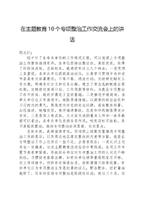 在主题教育10个专项整治工作交流会上的讲话同志们:刚才听了各牵头单位的工作情况汇报,可以说面上专项整治工作整体推进有序,各单位坚持边整边改、真抓实改,取得了阶段性成效。总结起来,我感觉有这么几个特点:一是思想上真重视。各牵头单位提高政治站位,认真学习贯彻中央和省市县委有关部署要求,不等不靠、迅速行动,及时研究制定工作方案,明确责任分工和任务分解,建立了常态化的联络会商机制,定期报送推进计划、工作周报等材料,为我县专项整治工作开好局、起好步奠定了坚实基础。二是推进中敢破难。各牵头单位在工作推进中,破除畏难情绪,以高度的政治自觉和刀刃向内的勇气,聚焦党内存在的突出问题,落实整改部署,加压推进、破难攻坚,有序推进整改,态度和作风都值得充分肯定。三是落实上有成效。从大家交流的重点工作和一连串数据可以看出,各牵头单位发扬务实作风,咬定目标不放松,真刀真枪抓整治,推动专项整治往深里做、往实里走。总体来说,成绩值得肯定,但对照上级高质量推进专项整治工作的要求,以及周边地区落实整改的力度等方面,我县在专项整治工作上还存在一些不足。主要表现在:一是认识上还存在一定偏差。这次主题教育活动启动非常迅速,各项工作布置节奏非常紧凑,导致部分单位对专项整治工作的认识还不够到位,习惯按老套路出牌。如有些单位领导重视程度还不够,在工作对接中,仍然存在推诿扯皮、材料屡催不报等现象。有些单位认为专项整治工作是纪委的活儿,配合配合、打打酱油就好了。还有的觉得专项整治是阶段性运动,熬过三个月,过了这阵风就好了。二是推进过程缺乏有效的载体。工作开展一月有余,有些单位仍然停留在疲于应付,搞文字整治、数字整改的被动阶段,具体整治工作开展缺乏精准的切入口和有效的推动载体,如有的变成文来会往,要求基层或整治对象频繁整材料整报表整数据;又如有的文件一发了之,后续工作不管不问不跟进,工作措施粗枝大叶,基层难以操作。三是整治工作重点还不够突出。此次专项整治列出的问题,有的涵盖面非常广、涉及事项很多,有些是重点领域的关键小事,因此面上专项整治工作之间还存在不平衡,有的工作找不到重点、找不到方法,工作进展不快、成效不明显。以上这些问题希望大家在后续推进中引起重视,认真改进。为切实抓好十大专项整治工作,推动问题整改走深走实,对下步工作我提三点意见,供大家参考:一、提高站位抓推进。开展专项整治是这次主题教育的一大特色亮点,也是检验主题教育成效的重要标志。在中央主题教育《指导意见》中明确提出,专项整治是开展主题教育的重要抓手,要按照中央主题教育领导小组印发的开展专项整治通知和各专项整治实施方案,把专项整治贯通于两批主题教育,持续推进,务求实效。专项整治实施方案的通知要求各地遵照执行、明确责任主体、进度时限和工作措施,逐条逐项推进落实。因此,大家要充分认识专项整治工作的重要意义,深刻认识抓好专项整治是推动党中央决策部署落实的实践要求,是解决党内突出问题的重要举措,是推动整改落实、确保主题教育取得实效的有效途径,切实增强工作责任感和紧迫感。我县是各级关注度高,因此标准要求也就更高。我们要高起点谋划实施,高质量推动整治,高标准完成整改,以专项整治的成效向上级领导和广大群众交上一份满意答卷。二、突出关键抓推进。专项整治作为整改落实工作的重中之重,开展到现在已经进入关键期,同时也进入瓶颈期,大家一定要抓牢关键点、精准发力,全力推进专项整治取得实效。一要进一步明确整治重点。各牵头单位要根据各自专项整治方案和上级整治要求,结合前期工作开展情况和存在问题,再次梳理整治的重点环节、重点内容、重点对象,紧盯目标任务,做好整治攻坚,寻求工作突破。同时要切实防止形式主义,避免虎头蛇尾、空喊口号、蜻蜓点水、纸面整改、数字整改,杜绝流于形式、走过场。二要进一步细化推进计划。各牵头单位对标对表各自专项整治任务,逐一理清整治内容和目标要求,进一步细化进度安排,按照12月底时限要求,采取项目化管理方式,明确责任主体、工作措施和进度时限,切实把任务分解到每个参与部门、每个具体岗位、每个责任人,逐条逐项推进落实。对专项整治期间能够解决的问题,要立查立改、即知即改;对一时解决不了的,要制定阶段目标,盯住不放,持续整治。对落实不力、进度滞后、效果不明显的单位,及时进行督办和催办,甚至严肃问责。三要进一步严格结果运用。发挥考核指挥棒作用,对整治得力的单位要表扬宣传,对整治不力的要通报批评,对问题严重的要给予组织处理。要坚持以案为鉴、以案促改,对典型案例及时在全县范围内给予通报曝光,抓两头带中间,以点带面推动工作。对专项整治中发现的违纪违法问题,要严肃查处。三、注重方法抓推进。抓好专项整治,不仅要有决心和定力,更要讲究方式方法,注重统筹兼顾、标本兼治,确保任务落地落实。一要注重沉到一线。摸清情况是做好一切工作的前提,要多到一