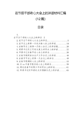在节后干部收心大会上的讲话材料汇编(12篇)目录1.在节后干部收心大会上的讲话22.在节后干部收心大会上的讲话53.在节后上班第一天机关收心会上的讲话144.在春节后上班第一天收心会议上的讲话稿.205.党委书记在正月初九复工动员会上的讲话.226.市委书记在春节收心会上的讲话267.在春节期间安全生产工作会议上的讲话408.在春节节后上班第一天会议上的讲话..489.在春节假期收心会上的讲话.5310.在xx年春节假后收心会上的讲话..5811.局长在春节收假工作动员会上的讲话.6112.市委书记在市委机关升国旗仪式上的讲话65在节后干部收心大会上的讲话尊敬的各位领导、同事们:大家上午好!首先,让我们以热烈的掌声,庆祝大家平安、健康、愉快地度过了一个温馨和谐的春节假期,同时,也对在假期中坚守岗位、确保公司运营平稳的同事们表示最诚挚的感谢和敬意。春节,作为中华民族最重要的传统节日,是家人团聚、共叙亲情的美好时光。它不仅给我们带来了短暂的休息和放松,更重要的是,它为我们提供了一个反思过去、展望未来的宝贵机会。今天,我们在这里召开节后收心会,目的是为了更好地转换我们的角色和状态,从节日的放松氛围中尽快调整过来,全身心地投入到新一年的工作中去。过去的一年,对我们每一个人,对我们的公司来说,都是极其不平凡的一年。我们面对着前所未有的挑战,经历了行业的巨大竞争。但是,正是在这些艰难中,我们看到了团队的凝聚力、个人的成长,以及公司的韧性和创新能力。这些,都是我们最宝贵的财富。面向新的一年,我们有理由对未来充满信心和期待。但同时,我们也必须清醒地认识到,新的一年,新的征程,将会有新的挑战和机遇。我们需要继续保持和发扬我们的优良传统和作风,更加积极主动地适应和引领变化,不断提升自身的竞争力和影响力。为此,我想强调几点意见,希望大家能够在新的一年中共同努力:坚持创新引领,不断突破自我。创新是企业发展的永恒主题。我们要敢于尝试、敢于失败、敢于再次站起来。每一个人都应该成为创新的践行者,无论是技术创新、管理创新,还是服务创新,都要勇于探索,敢于实践。强化团队协作,共同克服挑战。一个人的力量是有限的,一个团队的力量是无穷的。我们要进一步增强团队意识,优化团队结构,通过有效沟通和协作,形成合力,共同解决工作中遇到的问题和挑战。提升服务意识,增强客户满意度。客户是我们所有工作的出发点和落脚点。我们要从客户的需求出发,不断提高产品和服务的质量,努力提升客户满意度和忠诚度。注重个人成长,实现自我提升。公司的发展离不开每一个人的努力。我们鼓励大家设定个人发展目标,通过不断学习和实践,提升自己的专业能力和综合素质。维护良好的工作生活平衡。虽然工作很重要,但健康和家庭同样重要。我们倡导合理安排工作和生活,保持良好的工作生活平衡,让大家在实现职业发展的同时,也能享受到幸福和满足的生活。最后,我要再次感谢大家在过去一年的辛勤劳动和付出,感谢大家对公司的忠诚和贡献。新的一年,让我们携手同行,以更加饱满的热情、更加坚定的信心、更加专业的能力,共同开创公司发展的新篇章!谢谢大家!在节后干部收心大会上的讲话同志们:今天是正月初九上班第一天,大家在欢乐祥和的节日氛围中,带着家人的祝福回到了工作岗位。首先,我代表县委给大家拜个晚年,祝大家在新的一年里工作顺利、身体健康,阖家欢乐、万事如意!之选择今天召开会议,这既是收心会,也是年后工作的启动会。希望大家迅速调整工作状态,迅速恢复工作秩序,迅速形成一股紧张快干、马不停蹄、提速争先的浓厚氛围,为圆满完成全年工作目标奠定良好基础。下面,我结合当前实际,讲三点意见。一、春来赶早,吹响集结号一年之计在于春,再过十一天又到了惊蛰。俗话说,过了惊蛰节,春耕不能歇。今年已经过了快x个月,意味着一年繁重的工作任务要在xx个月内完成。时间如流水,半点不等人。全县各级各部门要抢抓时节,迅速对干部职工进行教育收心,促使他们迅速清心醒脑,找回状态,全身心投入工作,开启一年新的征程。一是用典范收心。春节期间,涌现了一批坚守岗位的典范。当家家户户合家团圆的时候,环卫工人还在寒冷的大街小巷清扫街道;医生护士还在病房里治病救人;公安交警还在风雪中维护交通;水厂电站的工人还在厂房值守供水供电;公交汽运司机们还在往返穿梭运送乘客;还有在各个单位坚守岗位值班的人员……想想他们,我们坐得住、等得起吗?他们高度的责任感和敬业精神,就是我们值得学习的身边典范。应该以他们为榜样,尽快把心收回来,以崭新的面貌面对新一年的工作。二是用责任收