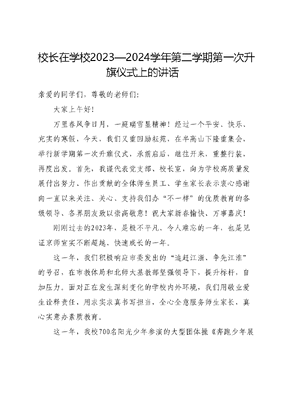 校长在学校2023—2024学年第二学期第一次升旗仪式上的讲话亲爱的同学们,尊敬的老师们:大家上午好!万里春风争日月,一庭瑞雪显精神!经过一个平安、快乐、充实的寒假,今天,我们又重回励耘苑,在半高山下隆重集会,举行新学期第一次升旗仪式,承前启后,继往开来,重整行装,再度出发。首先,我谨代表党支部、校长室,向为学校高质量发展付出努力、作出贡献的全体师生员工、学生家长表示衷心感谢向一直以来关注、关心、支持我们办不一样的优质教育的各级领导、各界朋友致以崇高敬意!祝大家新春愉快、万事嘉庆!刚刚过去的2023年,是极不平凡、令人难忘的一年,也是见证京师宣实不断超越、快速成长的一年。这一年,我们积极响应市委发出的追赶江浙、争先江淮的号召,在市教体局和北师大基教部坚强领导下,提升标杆,自加压力。面对正在发生深刻变化的学校内外环境,我们用敬业爱生诠释责任,用求实求真书写担当,全心全意服务师生家长,真心实意办素质教育。这一年,我校700名阳光少年参演的大型团体操《奔跑少年展风华》在市三运会开幕式上精彩亮相,或起或伏,或聚或散,如含苞花蕾,似争妍百花,向全市展示了京师学子健康向上的精神风貌。这一年,寒暑两期金声大舞台文艺演出,在灿烂光照里谱写梦想旋律,在铿锵回响中畅想未来样态,让京师学子在发现美,懂得爱的旅行中遇见更好的自己,预见更美的未来。这一年,学校整体设计、精心组织的校园八大节、励耘讲坛系列讲座等,让师生在活动中得到锻炼、展示和提升,增强了学校认同感和荣誉感。这一年,我们积极落实立德树人根本任务,努力构建高质量五育并举育人体系,组织学生赴北京师范大学、中国科学技术大学、合肥工业大学研学,帮助学生重塑顶层思维,提高认知能力,激发好奇心和学习主动性,助力学生追求卓越、圆梦未来这一年,我们坚信不疑、坚定不移、驰而不息推进精致管理共召开1次面向全体干部的专题动员会、1次面向全体教职工的专题培训会、8次专题现场会,从物有位出发,逐步聚焦教学,聚焦课堂,聚焦课堂上学、教、练、思等活动组织及学习的真实发生,抓基础、抓规程、抓落实,强意识、改作风、学本领,最终指向学校教育、教学、管理、服务等各项工作质量的全面提升所有汗水都会有收获,所有努力都不会被辜负!这一年,我校九年级学生参加中考,普高达线率超85%,创区历年新高;70%的高分学生主动放弃被百年名校录取的机会,自愿选择就读本校新创办的高中。首届高一年级学生参加市期末调研测试,无论是整体的总均分、单科均分,还是优秀生个体的成绩,均大幅反超一直对标的老牌省示范高中。这一年,学校被北师大确定为首批基础教育艺术学科共同体艺术特色培育基地和大中小学思想政治教育一体化建设研究基地,并高标准承办北师大基础教育学校资源建设专题研修活动。这一年,学校被教育部确定为首批全国中小学科学教育实验校,将担负起在建立科学教育保障体系、加强科学类课程建设、强化实验探究教学、拓展科学活动资源、实施学生多元评价等方面先行先试,为区域基础教育探索科学教育实施有效途径和人才培养创新模式的责任。这一年,我们用实实在在的行动和响当当、绿油油的成绩向社会兑现了办不一样的优质教育的承诺,被市领导评价为走出了一条以素质教育为特色的优质教育发展之路,被北师大领导赞誉为办出了北师大心目中基础教育的理想样态。凡是过往,皆为序章!回首过去,我们牢记使命,勇毅前行,经历了风雨洗礼,看到了美丽风景;展望未来,我们坚定信心,奋勇争先,将追求新的目标,实现新的跨越。同学们,在去年秋季学期第一次升旗仪式上,我曾送给大家三个度——向度、厚度和高度,希望大家一要善于把握人生的向度,找准方向和目标;二要乐于积淀人生的厚度,让生命更加充实,有意义,有尊严;三要勇于突破人生的高度,勇立时代潮头,矢志追求卓越。今天,在新的一年、新的学期第一次升旗仪式上,我想再送给大家三口气——志气、骨气和底气。XXXXXX在庆祝中国共产党成立100周年大会上寄语新时代的中国青年,要以实现中华民族伟大复兴为己任,增强做中国人的志气、骨气、底气,不负时代,不负韶华,不负党和人民的殷切期望。在党的XX大上,XXXXXX又进一步指出,要增强全党全国各族人民的志气、骨气、底气,不信邪、不怕鬼、不怕压,知难而进、迎难而上。志气、骨气、底气,对于新时代的中国人、中国青年,对于我们京师学子,究竟意味着什么呢?先说志气志气,是进取的决心和勇气。《论语》中有三军可夺帅也匹夫不可夺志也的句子,意思是军队统帅可改变,人的志向不能变,以此来告诫人们,要坚守自己的志向,矢志不渝。说到志气,我脑海中浮现出很多光辉灿烂的身影,其中,有陈独秀和李大钊目睹民生之多艰后,庄严宣布要建立一个为人民服务的政党;有少年便许下孩儿立志出乡关,学不成名誓不还埋骨何须