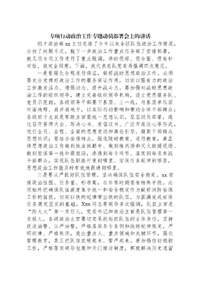 专项行动政治工作专题动员部署会上的讲话刚才政治部xx主任总结了今年以来全区队伍政治工作情况,分析了问题不足,就下一步政治工作重点任务做了安排部署,就几项专项工作进行了重点强调,讲的很好、很全面、很有针对性,我完全同意。下面,我代表总队党委再强调四点意见。一是要强化全程遂行保证,做好战时思想政治工作。必须要充分发挥好政治工作的服务保证作用,切实以强有力的政治工作激发活力、增强动力、提升战斗力。要加强对战时思想政治工作的组织领导,建立完善组织领导机构,设立党员服务队、党员示范岗,各级领导干部要下基层、上一线,与基层单位面对面地帮、肩并肩地干,以实际行动影响和带动全体干部群众;各级班子尤其是军政主官要统一思想认识,层层动员部署,通过召开誓师大会、写决心书、发倡议书、广泛开展谈心等形式,进行全员、全程、全面的思想发动和舆论引导,凝聚干部群众思想共识;要结合安保特点,强化随时教育、遂行教育,真正将思想政治工作做到执法执勤中、做到练兵场和灭火救援现场、做到安保第一线和最前沿,渗透到每个环节、落实到每名参战干部群众,实现队伍职能行使到哪里、安保任务延伸到哪里,思想政治工作就及时有效地跟进到哪里。二是要从严抓好队伍管理,坚决确保队伍安全稳定。xx安保政治性强、任务重、标准高,在非常时期要有特殊手段。必须始终把确保队伍高度集中统一和安全稳定作为做好消防安保工作的前提,切实以铁的纪律带出铁的队伍,为圆满完成安保任务奠定坚实的基础。Xxx同志等领导多次强调,队伍主官是防大火第一责任人,党委书记和政治主官是队伍管理第一责任人,各级政治主官要切实承担起抓队伍的主体责任,坚持依法治警、从严治警,严格落实条令条例和战时纪律规定,严明纪律、严格秩序,突出重点人、重点领域和关键环节,强化管理教育,真正把队伍抓硬起来、管严起来。要加强信访稳控工作,严格落实领导包案和开门接访制度,积极解决历史遗留信访积案,把矛盾化解在基层,坚决杜绝越级上访,严防发生滋事极端行为。总队将严格战时纪律,对安保期间队伍发生严重以上事故案件的,因控访措施不到位、责任不落实,导致信访人进京上访的,特别是发生触底碰线的政治性问题和影响恶劣的大丑恶事件的,将依据相关规定严肃追究相关责任人和领导的责任。三是要深化党风廉政建设,坚定不移开展正风肃纪。XXX一再强调,党的队伍中绝不能有腐败分子藏身之地。党风廉政建设是队伍建设的重中之重,如果廉政出了问题,必然会伤元气、动根基、毁形象,队伍实现全面发展就无从谈起。从全区信访举报、审计监督和我们平时掌握的情况来看,全区队伍的党风廉政形势虽然总体向好,但依然存在一些不容忽视的突出问题,必须引起队伍各级的高度警觉。要深入学习贯彻于建华局长和詹寿旺副政委在部消防局党委听取纪委工作汇报时的重要讲话精神,全区队伍各级党委要始终保持清醒认识,充分认清当前队伍党风廉政建设面临的严峻形势,切实履行好管党治党的主体责任、政治责任,从加强教育、完善机制、强化监督等方面着力,从各项纪律规矩严起,从总队、支队两级党委班子做起,从领导干部这个关键少数管起,从消防监督执法、后勤财经管理、物资招标采购、基建工程建设、干部选拔任用等重点领域环节抓起,大力开展突出问题专项治理行动,下大决心、使大力气,坚定不移地开展正风肃纪;要坚持有案必查、有腐必惩,强化刚性执纪,严肃查处问责,决不姑息手软,努力营造良好的政治生态。四是要加强党委班子建设,建强核心打造过硬队伍。党委班子建设是队伍建设的核心和关键,是引领队伍建设和全面发展的龙头。要大力加强各级党委班子建设,坚持用党的创新理论尤其是XXXXXX系列重要讲话精神武装头脑,坚定政治方向,站稳政治立场;要严格落实民主集中制原则,严格执行党委统一的集体领导下的首长分工负责制,凡涉及干部任用、大文可居文库——海量学习资料,手机电脑均可下载www.wenkeju.com额经费开支、基本项目建设、大宗物资采购等重大和热点敏感问题,必须由党委集体研究决定,着力营造分工与协作相统一的团结共事良好氛围;要选好用好领导干部,坚持公开公平公正选拔任用干部,尤其是对进入支队级单位领导班子的干部,必须严格把关;要贯彻落实《关于新形势下党内政治生活的若干准则》,进一步严肃党内政治生活,着力增强党内生活的政治性、时代性、原则性、战斗性,不断增强班子的凝聚力和战斗力。同志们,安保任务艰巨、责任重大、使命光荣。全区xx队伍各级党委、广大干部群众必须坚决贯彻落实上级党委和总队党委的决策部署要求,以昂扬的斗志、饱满的热情、必胜的信念,坚决打好这场安保攻坚战,切实以优异成绩迎接党的胜利召开!我就讲这些,谢谢大家!文可居文库——海量学习资料,手机电脑均可下载www.wenkeju.com