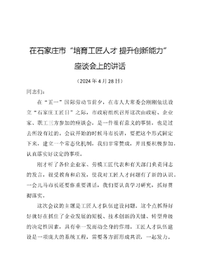 在石家庄市培育工匠人才 提升创新能力座谈会上的讲话(2024年4月28日)同志们:在五一国际劳动节前夕,在市人大常委会刚刚依法设立石家庄工匠日之际,市政府组织召开这次由政府、企业家、职工三方参加的座谈会,是一件很有意义的事情,也是过去所没有过的。会议开始的时候马市长讲,要把这个形式固定下来,建立一个常态化机制,我们非常赞成,并且要积极参加,认真落实好议定的事项。刚才听了各位企业家、劳模工匠代表和有关部门负责同志的发言,很受教育和启发,使我对工匠人才问题有了新的认识。一会儿马市长还要作重要讲话,我们要认真学习研究,抓好贯彻落实。这次会议的主题是工匠人才队伍建设问题。这个点抓得好好就好在抓住了企业发展的短板、技术创新的关键、转型升级的决定性因素,具有牵一发而动全身的作用。工匠人才队伍建设是一项庞大的系统工程,需要各方面形成共识,一起发力。作为市企联/企协就是要认真贯彻落实市委、市政府决策部署,充分发挥协调服务、桥梁纽带、催化促进作用,在工匠人才队伍建设上找准定位、努力作为。同时,希望广大企业家着眼企业长远发展和社会全面进步,切实履行好主体责任,把工匠人才队伍建设这件大事抓实办好。概括地讲,就是五个要上去:第一,认识要上去。要充分认识到工匠人才是企业高质量发展的基石,是企业核心竞争力的重要组成部分,抓工匠人才培育就是抓新质生产力,就是抓企业可持续发展。要将工匠人才作为企业的宝贵财富,提升工匠人才在企业的地位和待遇,让工匠人才成为企业的明星和榜样。第二,措施要上去。要加强对工匠人才培育的组织领导,制定培育计划和实施细则,明确培育目标、内容、方法和时间表。要实施差异化人才培养策略和个性化培养方案,使不同层级和类型的产业技术工人都能得到提升。第三,投入要上去。要把工匠人才培育作为企业一项长期投资,列入发展规划和财务预算。加大对职业教育和技能培训的投入,解决好场地、师资、企校合作以及工匠人才参加深造、竞赛和国内外交流等问题,确保工匠人才的培育、成长得到充分保障。文可居文库——海量学习资料,手机电脑均可下载www.wenkeju.com第四,机制要上去。要围绕工匠人才培养和教育、评价和认证、表彰和奖励、职业发展和社会保障等方面,研究建立长效机制,畅通劳动者由工变匠的通道,让工匠人才得到有效激励、充分发挥作用。第五,氛围要上去。要在企业营造浓厚的尊重工匠、崇尚技能的良好氛围,大力宣传优秀工匠人才的先进事迹,培育建立工匠文化,激发广大职工学习技能、追求卓越的热情。三年前的2020年12月,我市依法设立了石家庄企业家日,现在又以同样方式设立了石家庄工匠日,这如同为企业腾飞插上了一副坚实有力的翅膀,也为优化营商环境、推动高质量发展增加了一个有力抓手。设立企业家日的时候有的同志说,希望我们这座城市天天都是企业家日,企业家可以心无旁骛、大展拳脚之日,就是营商环境根本改善之时。现在我们要说,希望天天都是工匠日,工匠人才受到崇敬、工匠精神深入人心、一支宏大的与高质量发展相适应的工匠人才队伍建成之日,就是我市经济社会发展站上一个新的更高起点之时。让我们共同努力,力争这一天早日到来。文可居文库——海量学习资料,手机电脑均可下载www.wenkeju.com