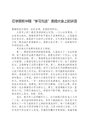 在学期前半程学习先进表扬大会上的讲话尊敬的各位领导,各位老师,亲爱的同学们:大家早上好!我是X班的班主任X。一方山水有清音,三生有幸会此处。感谢校领导给予我这个宝贵的机会,让我能站在这里发言,我感到十分的开心和荣幸。今天没有华丽的词藻,只有一颗赤诚朴素真挚的心,想跟大家分享一下一名新教师四年来的成长心得。首先请允许我带来我的五个感谢。第一,感谢国家政府的惠民政策,让我成为了一名全科教师,给了我实现自我价值的平台,就是这样的一个平台,让我的梦想开始起航。第二,感谢学校各位领导的支持与信任,关心与鼓励,让我担任班主任并承担数学教学工作,给了我锻炼机会,让我拥有了无限力量和干劲。第三,感谢身边的所有同仁,来到X小的三年时间里,给予了我无私无尽的帮助和指导,让我不断改进工作方法,提升教学水平,你们就是我的榜样。第四,感谢我们六5班所有的同学,在过去的三年里对我的支持和配合。三年里,我和六五班的同学们一起共同努力,相互学习,共同进步,一步一步的向优异成绩靠近,我看到了他们的成长和改变,我想说,孩子们你们真棒,为你们点赞,将来的你一定会感谢现在努力的自己。第五,我想感谢在过去一直努力工作,尽职尽责的自己,希望你不骄不躁,保持初心,继续在岗位上发光、发热、发亮。其次,教书育人应怀期待之心。如今的我已经在X小工作了三年,每天面对同样的学生,却有不样的经历,你永远不知道学生下一秒又能给你什么样的惊喜或惊吓,每一天都充满了未知。我从四年级开始接手这个班,从四5班到六5班,三年时间似乎并没有什么变化,但偶然间翻开手机相册,看着屏幕上与学生的合照,才惊觉大家已经有了这么大的变化,不仅仅是外表变得成熟,褪去了青涩稚嫩,他们无邪的眼神里也多了些说不清道不明的心思,他们的作文里也多了些对理想和人生的思考。学生从陌生到熟悉,从调皮到守纪,从散漫到上进,每一天都能看到他们在成长,而我也在成长。在班级管理中,与学生共同制定班规,然后放手的交给班干部,相信学生的力量,做个懒班主任,会收获一批乖乖仔。当我用爱播种,收获的也是爱的芬芳,教师与学生本就是爱与被爱的双向奔赴,每一天都有爱和成长,每一天都充满了期待。最后,青春是奋斗出来的。奋斗是青春最亮丽的底色,青春也因奋斗而精彩。作为一名一线教师,在平时的教学工作和班级管理中多虚心请教,花时间、花心思,在数学上,我严格要求每位同学都要掌握基础知识,安排小组长督促完成任务,课间我一般都在教室跟学生处在一起,既可以跟他们聊聊天,也可以杜绝课间出现打闹情况,不断的实践证明,世上无难事,只怕有心人。问渠那得清如许,为有源头活水来,只有勤学好问,努力钻研教材,才能收获成功,成绩的取得需要默默耕耘,金榜题名也必先寒窗苦读。教育是一项良心事业,要用爱心、责任、奉献来架起这座事业桥梁,我在教育这条路上刚刚起步,今后的日子定会秉持初心,积累经验,向上突破,不断完善自己的能力,励志做一个有理想信念,有道德情操,有扎实学识,有仁爱之心的四有好老师。最后祝各位老师工作顺利,身体健康,祝各位同学学习进步,祝我们X小的发展更加辉煌!谢谢大家!文可居文库——海量学习资料,手机电脑均可下载www.wenkeju.com
