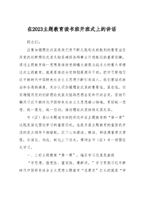 在2023主题教育读书班开班式上的讲话同志们:注重加强理论武装是我们党不断从胜利走向胜利的重要法宝用党的创新理论武装头脑是确保各项事业行稳致远的重要保障,通过主题教育统一思想是保持党的强大凝聚力战斗力的重大举措这次主题教育,就是要推动全党特别是领导干部,把学习贯彻习近平新时代中国特色社会主义思想不断引向深入。我们要站在政治和全局的高度,充分认识加强理论武装的重要性、紧迫性,切实增强用党的创新理论武装头脑的思想自觉和行动自觉,坚持不懈用习近平新时代中国特色社会主义思想凝心铸魂,更好统一思想、统一意志、统一行动,推动理论武装持续走深走实。市(区)委以专题读书班的形式开启主题教育的第一课这既是深化理论学习的重要形式,也是开展主题教育的重要抓手目的是从领导干部做起,沉下心来通读、精读、研读原著原文原理,在深化、内化、转化上下功夫,带动全市(区)来一场理论大学习。一、上好主题教育第一课,端正学习态度是前提学思想、强党性、重实践、建新功。学习贯彻习近平新时代中国特色社会主义思想主题教育总要求打头的就是学思想。理论学习作为最核心的任务,将贯穿于主题教育的全过程、各方面。学思想,关键在动真格地学。理论学习要学得进,先要解决对党的创新理论的思想认同、情感认同的问题现实中,一些党员干部对理论学习不感冒、没兴趣,坐不下来、沉不下心、学不进去,最根本的原因是对科学理论的情感上不来。对理论无感,自然在学习上打不起精神、提不起劲。习近平新时代中国特色社会主义思想是来自人民、为了人民造福人民的理论,是接地气、有温度、得民心的科学理论。这一理论可敬、可亲、可学;这一理论给人以方向、给人以力量、给人以信心。只要我们用心用情用功,自然会学得进、学得好。静得下心来、才能真钻得进去。思想理论的魅力和价值,唯有真学深学才能深刻体悟。这就要求我们不能抱着完成任务的心态,搞功利化、快餐式学习,光走形不走心,也不能只是读读标题、念念原文、抄抄笔记、拍拍照片走过场。市(区)委举办这次主题教育读书班,将全市(区)关键少数集中起来读书学习,就是要坚持以上率下,通过静下心来学习、沉下心来思考、潜下心来感悟,先学一步,深学一层,扎扎实实推动理论学习往深里走、心里走。二、上好主题教育第一课,掌握学习方法是关键理论学习如果没有章法、不得要领,那无异于缘木求鱼。习近平总书记曾指出,学习理论最有效的办法是读原著、学原文、悟原理,强读强记,常学常新,往深里走、往实里走、往心里走,把自己摆进去、把职责摆进去、把工作摆进去,做到学、思、用贯通,知、信、行统一。科学理论的精髓,都集中而准确地凝结在原著之中。攻书方能取真经。读全读准、读精读深《习近平新时代中国特色社会主义思想学习纲要(2023年版)》、《习近平新时代中国特色社会主义思想专题摘编》和《习近平著作选读》第一卷、第二卷等重要著作,坚持原原本本学、反反复复学,知其言更知其义、知其然更知其所以然,就能真正读出真理的味道,悟透活的灵魂,学到看家本领。学习有法,学无定法,贵在得法。当前,最要紧的就是要把握好习近平新时代中国特色社会主义思想的世界观、方法论,这是确立科学的领导方法、思想方法、工作方法的不二法门,也是提高政治判断力、政治领悟力、政治执行力,贯彻落实党中央重大决策部署的不二法门。只有学习好掌握好这一科学思想蕴含的领导方法、思想方法、工作方法,才能不断提高为党分忧、为民谋福的能力和水平。三、上好主题教育第一课,提高学习效能是根本攻书学剑能几何,争如沙塞骋偻㑩。党的创新理论不仅仅是理论宝库里的珍宝,更是推动事业发展的利器。提高学习效能,使之成为武装头脑、指导实践、推动工作强大思想武器,既是主题教育的要旨所在,也是理论学习的根本着眼点和落脚点。学理论,基础在学,关键在做。科学理论是认识、分析和解决问题的金钥匙。要把思想摆进去、把感情摆进去、把工作摆进去,善于以强化理论学习指导发展实践,才能推动党员、干部将焕发出来的学习、工作热情转化为攻坚克难、干事创业的强大动力。要以理论清醒保证政治坚定,以思想自觉引领行动自觉使理论学习成果真正进入思想、进入决策、进入实践,从真经里学到真招,让发展思路和举措再完善再深化,让党员干部能力素质和作风再强化再提升,真正学出高质量、学出好效果,学出干事创业的精气神。