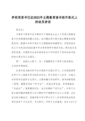 学校党委书记在2023年主题教育读书班开班式上的动员讲话同志们:开展学习贯彻习近平新时代中国特色社会主义思想主题教育是今年党的建设的重大任务,深化理论学习是开展主题教育的首要任务。根据中央和市委关于主题教育的部署要求,学校党委决定从今天起至4月29日集中举办党员领导干部读书班。现在我代表学校党委,对做好这次读书班的有关工作和党员干部参加读书班的有关要求讲三点意见。第一、坚持以上率下,进一步增强党员干部学习的自觉性、主动性和积极性。以读书班为载体和平台开展集中式强化学习,以学校党委理论学习中心组集中学习的形式举办,学习采取个人自学、分组讨论和集体交流等方式进行,必要时辅以实地研学。读书班既是统一思想、凝聚共识的学习会,也是互学互鉴、共同提高的交流会,更是激发动力、奋力赶超的动员会,有利于大家全面学懂弄通做实习近平新时代中国特色社会主义思想。这次读书班为期12天,坚持把集中学习研讨与个人自学紧密结合起来每天安排了半天自学、半天研讨,开列了必学篇目,划分了3个讨论分组,明确了研讨重点,就是为了更好地学习,强化学习效果要坚持以上率下。参加这次读书班的人员范围,扩大到全体处级干部,非党员领导干部参加学习讨论和交流研讨,不作党性分析这是从中央到市委的明确要求。处级及以上领导干部是这次主题教育的重点。大家都是学校事业发展的骨干分子和中坚力量,要站在政治和全局的高度,充分认识加强理论武装的重要性、紧迫性,深化学习领悟,提高政治素养,把握标准要求,切实增强用党的创新理论武装头脑的思想自觉和行动自觉。要坚持先学一步深学一层,示范带动全校广大党员干部层层跟进、层层深入、层层加压,推动学校广大党员干部真学真懂真信真用,努力在以学铸魂、以学增智、以学正风、以学促干方面取得实实在在的成效第二、坚持提纲挈领,全面学习领会习近平新时代中国特色社会主义思想的科学体系、精髓要义和实践要求。这次读书班,按照从事什么重点学什么缺什么重点补什么的原则,把全面学习和重点学习结合起来,列出了两个确立的决定性意义、习近平新时代中国特色社会主义思想的世界观和方法论、全面从严治党推进自我革命、中国式现代化理论推动高质量发展和关于XX所作重要讲话和重要指示批示精神、关于教育和文艺工作的重要论述等8个方面的重点内容,提出了学习的指导原则和目标要求,并根据学校工作实际和学校领导班子成员分工,设置了相应研讨专题。要坚持读原著、学原文、悟原理切实搞好个人自学,注重融入日常、抓在经常,保质保量完成规定学习内容。要着力在全面学习、全面把握、全面落实上下功夫把自学收获和成果充分反映到集中研讨上,带着感情、装着问题联系实际参加分组讨论和集中研讨发言。集中研讨时,要自觉把思想摆进去、把工作摆进去、把职责摆进去,深入思考、对照检视,不断改造主观世界、客观世界,避免空对空,要注重交流运用党的创新理论解决各单位各领域实际问题的具体案例和体会,提出改进工作的思路措施,确保学出实实在在成效。第三、坚持端正学风,严肃学习纪律,统筹处理好工学矛盾举办党员领导干部读书班,是主题教育理论学习的规定动作和重中之重。成功开展好这次读书活动,是确保主题教育取得实实在在成效的重要一环,将为下一步调查研究、查找问题和整改提高奠定坚实的思想基础。读书班时间紧、任务重、要求高全体党员干部要把开展好、参加好这次读书班作为一项重大政治任务。要珍惜集中学习机会,严格遵守学习纪律,坚持以学铸魂以学增智、以学正风、以学促干,静下心来学习、沉下心来思考潜下心来感悟。读书班举办期间乃至整个主题教育过程中,学校领导班子成员和处级领导干部要以身作则,发扬优良学风,非必要不请假。要坚持目标和问题导向,坚决克服学风不纯不正,学习不走心不入脑问题;坚决克服学习不严不实,学习联系实际不紧密、学用脱节,搞形式、走过场问题;坚决克服学习不全不深必学内容有漏项、重点内容不深入问题。要坚持学用结合,统筹抓好主题教育和中心工作,同步推进调查研究、检视问题、整改落实,将集中学习成果转化成坚定拥护两个确立的坚定自觉转化成为师生办实事的实际成效,以更高标准、更严要求、更实措施,不断把学习引向深入,以学校高质量内涵式发展的新成效回报和检验主题教育成果。