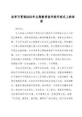 在学习贯彻2023年主题教育读书班开班式上的讲话同志们:在全党深入开展学习贯彻习近平新时代中国特色社会主义思想主题教育,是贯彻党的XX大精神的重要举措,是事关全局的大事。习近平总书记在主题教育工作会议上的重要讲话,深刻阐述了开展主题教育的重大意义和目标要求,对主题教育各项重点工作作出全面部署,为全党开展主题教育提供了科学指引和根本遵循。在这一关键时刻开展主题教育,是一次深刻的思想政治洗礼系统的能力本领锤炼、严肃的纪律作风教育,是我们笃定目标、砥砺前行的一次加油鼓劲,十分及时、十分重要。举办这次读书班,主要任务是全面、系统、深入学习习近平新时代中国特色社会主义思想,通过系统研读,完整准确掌握习近平新时代中国特色社会主义思想的主要内容,全面把握这一重要思想的世界观、方法论和贯穿其中的立场观点方法,深刻理解这一重要思想的道理学理哲理,推动党员、干部真学真懂真信真用,推动学习往深里走、往实里走、往心里走,提高思想觉悟,切实做到筑牢信仰之基、补足精神之钙、把稳思想之舵,按照学思想、强党性、重实践、建新功的总要求,把习近平新时代中国特色社会主义思想转化为坚定理想、锤炼党性和指导实践推动工作的强大力量。下面,结合今天的学习研讨内容,我谈几点意见。一、坚定不移把学习习近平新时代中国特色社会主义思想作为终身课题党的理论创新每前进一步,理论武装就要跟进一步。党员干部要把学习新时代党的创新理论作为必修课、常修课,常学常新常悟常进。一要坚持提高站位自觉学。站在坚定马克思主义崇高信仰的高度,把学习习近平新时代中国特色社会主义思想作为一种精神追求、一种生活态度、一种工作习惯,带着信仰、带着使命、带着责任学,在学思践悟中站稳政治立场、坚定政治方向,进一步提高政治判断力、政治领悟力、政治执行力,深刻领悟两个确立的决定性意义,筑牢坚决做到两个维护的思想根基,掌握解决问题、推动工作的真本领。二要坚持原原本本系统学。坚持干什么学什么,系统学习习近平总书记关于经济、政治、文化、社会、生态文明等各方面要求,把《习近平新时代中国特色社会主义思想学习纲要(2023年版)》《习近平新时代中国特色社会主义思想专题摘编》《习近平著作选读》《习近平谈治国理政》《习近平著作选读》等作为案头卷,在字里行间领悟原汁原味的理论内涵、思想精髓,不断增进政治认同、思想认同、理论认同、情感认同,做到学思用贯通、知信行统一。三要坚持及时跟进常态学。保持与时俱进、温故知新的学习状态,坚持和落实好第一议题等制度,对习近平总书记最新重要讲话、重要指示批示精神,第一时间学习领会,做到学习跟进、认识跟进、行动跟进。树牢终身学习理念,发扬挤和钻的精神,在日积月累中多思考、多领悟,经常对照工作需要、现实问题来深化理解认识,推动学习往深里走、往实里走、往心里走。四要坚持研机析理用心学。明道理,解决知其然的问题,坚持从习近平总书记重要论述、重要指示要求中提升站位明辨方向。知学理,解决知其所以然的问题,善于通过联系的观点、系统的思维研究分析问题。悟哲理,解决真懂真信的问题,分析把握新时代党的创新理论所蕴含的历史渊源、理论支撑、内在规律,增强贯彻落实的坚定性、自觉性。二、切实增强开展主题教育的思想自觉、政治自觉、行动自觉,努力在以学铸魂、以学增智、以学正风、以学促干方面取得实实在在的成效一是自觉做到以学铸魂,锤炼绝对忠诚的政治品格。要坚持读原著学原文悟原理,坚持多思多想、学深悟透,全面学习领会习近平新时代中国特色社会主义思想,做到整体把握、融会贯通以持续不断、入脑入心的理论淬炼和政治锤炼,忠诚捍卫两个确立,增强四个意识、坚定四个自信、做到两个维护,筑牢对党绝对忠诚的思想根基。要真正从思想深处正本清源、固本培元,爱党、信党、护党、为党,自觉做习近平新时代中国特色社会主义思想的坚定信仰者、积极传播者、忠实实践者始终在思想上政治上行动上同以习近平同志为核心的党中央保持高度一致。要胸怀国之大者、牢记市之大计,站在全市发展全局和战略高度,聚焦水务之能,坚定不移贯彻落实好党中央决策部署和市委市政府工作要求,在我市加快XX、当好XX的实践中展现新作为。二是自觉做到以学增智,不断汲取解难题的力量智慧。要全面学习领会习近平新时代中国特色社会主义思想的科学体系、精髓要义、实践要求,准确把握这一思想的世界观、方法论,坚持好运用好贯穿其中的立场观点方法,真正把马克思主义看家本领学到手。尤其是当前,XX面临着发展不足、发展不优的双重压力面临着加快发展、转型发展的双重任务,经济总量偏小、XX主业偏重、生产成本偏高、人均效益偏低、科创能力偏弱等问题长期客观存在,尚未得到有效解决,推动高质量发展仍然任重道远。要加强习近平新时代中国特色社会主义思想理论武装,不断汲取党