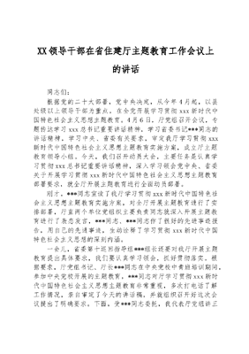 XX领导干部在省住建厅主题教育工作会议上的讲话同志们:根据党的二十大部署,党中央决定,从今年4月起,以县处级以上领导干部为重点,在全党开展学习贯彻xxx新时代中国特色社会主义思想主题教育。4月6日,厅党组召开会议,专题传达学习xxx总书记重要讲话精神,学习省委书记同志的讲话精神,学习中央、省委有关要求,审定我厅学习贯彻xxx新时代中国特色社会主义思想主题教育实施方案,成立厅主题教育领导小组。今天,我们召开动员大会,主要任务是认真学习贯彻xxx总书记重要讲话精神,深入学习领会党中央、省委关于开展学习贯彻xxx新时代中国特色社会主义思想主题教育部署要求,就全厅开展主题教育进行全面动员部署。刚才,同志宣读了我厅学习贯彻xxx新时代中国特色社会主义思想主题教育实施方案,对全厅开展主题教育进行了安排部署,厅直两个单位党组织主要负责同志就深入开展主题教育进行了表态发言,同志、同志作了很好的先进事迹报告,用自己的先进事迹,生动诠释了学习贯彻xxx新时代中国特色社会主义思想的深刻内涵。一会儿,省委第十巡回指导组组长还要对我厅开展主题教育提出具体要求,我们要认真学习领会,抓好贯彻落实。根据要求,厅党组书记、厅长同志在中央党校中青班培训期间,参加中央党校开展的主题教育,同志对厅学习贯彻xxx新时代中国特色社会主义思想主题教育非常重视,多次打电话了解工作情况,亲自审定了今天的讲话稿,并就组织召开好这次会议提出了明确要求。下面,受同志委托,我代表厅党组讲三点意见。一、深刻领会开展主题教育的重大意义,切实增强政治责任感和历史使命感党的二十大报告指出,从现在起,中国共产党的中心任务就是团结带领全国各族人民全面建成社会主义现代化强国、实现第二个百年奋斗目标,以中国式现代化全面推进中华民族伟大复兴。这个使命任务是激励中国共产党人不断前进的根本动力。今年是贯彻落实党的二十大精神开局之年,是实施十四五规划承上启下的关键之年,在这个重要时间节点开展主题教育,是贯彻落实党的二十大精神的重大举措,对于统一全党思想、解决党内存在的突出问题、始终保持党同人民群众血肉联系、推动党和国家事业发展,具有重要意义。厅直机关各级党组织和全体党员干部,要充分认识开展这次主题教育的重大政治意义、历史意义、时代意义、实践意义,深刻领会xxx总书记重要讲话精神,以强烈的政治责任感和历史使命感推动我厅学习贯彻xxx新时代中国特色社会主义思想主题教育高质量开展、取得预期效果。(一)要通过深入开展主题教育,不断提高政治判断力、政治领悟力、政治执行力,切实增强四个意识,坚定四个自信,做到两个维护。xxx总书记指出,开展这次主题教育,是用新时代中国特色社会主义思想武装全党的迫切需要。学习贯彻xxx总书记新时代中国特色社会主义思想和党的二十大精神是首要政治任务,是全体党员干部深刻领悟两个确立的决定性意义,切实增强四个意识,坚定四个自信,做到两个维护的重要保证。党的二十大以来,通过开展专题学习、举办专题辅导、开展集中轮训、调研督导问效等多种方式,持续推动全厅上下在学懂弄通做实上下功夫,全厅党员干部学习贯彻xxx新时代中国特色社会主义思想的主动性、自觉性有了很大增强。但从中央巡视回头看、党建调研督导、平时检查考核发现,有的单位学习贯彻xxx新时代中国特色社会主义思想不够扎实,存在学习形式化、表面化、碎片化的问题,没有真正做到往深里走、往心里走、往实里走;有的党员干部对党的理论和路线方针政策学习理解不够,学用脱节的情况还不同程度存在;在推动学以致用、知行合一方面还有欠缺,在学习成果转化、推动工作落实、破解发展难题上还有很大差距。我们开展这次主题教育,就是要坚持学思用贯通、知信行统一,在原有学习的基础上,推动广大党员干部全面系统学、深入思考学、联系实际学,进一步加深对xxx新时代中国特色社会主义思想和党中央重大方针政策的理解,提高运用党的创新理论指导实践、推动工作的能力,把xxx新时代中国特色社会主义思想转化为推动住房和城乡建设各项工作的实际行动,真正把践行两个维护贯穿于全部工作始终。(二)要通过深入开展主题教育,以政治建设统领党的建设,不断推进党的建设高质量。xxx总书记指出,开展这次主题教育,是深入推进新时代党的建设新的伟大工程的重大部署,就是要推进党的自我革命、时刻保持解决大党独有难题的清醒和坚定,始终与人民同心,保持党的先进性和纯洁性,使全党更加紧密地团结在以xxx同志为核心的党中央周围,为奋进新征程、建功新时代提供坚强有力的政治引领和政治保障。厅党组始终以党章为根本遵循,把党的政治建设摆在首位,坚持党的基本理论、基本路线、基本方略不动摇,不断加强和改进党对住房和城乡建设工作的领导,统筹推进党的各项建设,通过抓班子