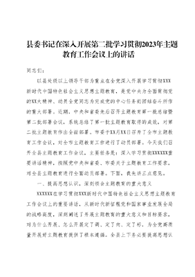 县委书记在深入开展第二批学习贯彻2023年主题教育工作会议上的讲话同志们:以县处级以上领导干部为重点在全党深入开展学习贯彻XXX新时代中国特色社会主义思想主题教育,是党中央为全面贯彻党的XX大精神、动员全党同志为完成党的中心任务而团结奋斗所作的重大部署。近期,中央和省委先后召开主题教育第一批总结暨第二批部署会议,系统总结了第一批主题教育取得的成效,对第二批主题教育作出全面部署。市委于XX月XX日召开了全市主题教育工作会议,对全市主题教育工作进行了动员部署。今天我们召开全县主题教育工作会议,主要任务是:深入学习贯彻XXXXXX重要讲话精神,按照党中央和省委、市委关于主题教育工作要求,对全县主题教育进行全面动员部署。下面,我先讲三点意见。一、提高思想认识,深刻领会主题教育的重大意义XXXXXX在学习贯彻XXX新时代中国特色社会主义思想主题教育工作会议上的重要讲话,从新时代新征程党和国家事业发展全局的战略高度,深刻阐述了开展主题教育的重大意义和目标要求,对为什么开展、怎么开展定了调、定了向、定了标,为全党高质量开展好主题教育提供了根本遵循。全县上下务必要提高思想认识,准确把握开展主题教育的政治意义、理论意义、实践意义,以高度的政治自觉、思想自觉、行动自觉,推动主题教育扎实开展、取得实效。(一)开展主题教育是坚定拥护两个确立、坚决做到两个维护的根本要求。党的十八大以来,党和国家事业之所以取得历史性成就、发生历史性变革,最根本的原因在于有XXXXXX作为党中央的核心、全党的核心掌舵领航,在于有XXX新时代中国特色社会主义思想的科学指引。两个维护和两个确立既是重大政治论断,更是重要政治标准。是不是旗帜鲜明讲政治、做没做到对党绝对忠诚,关键看有没有衷心拥护两个确立、忠实践行两个维护,有没有坚持不懈用XXX新时代中国特色社会主义思想凝心铸魂、筑牢根本。当前,有的党员干部对党的创新理论学习走形式装样子、不深入不系统、一知半解浅尝辄止;有的政治意识不强,对国之大者心中无数,贯彻落实上级决策部署不到位等。这次主题教育,就是要通过理论大学习思想大武装、政治大洗礼,筑牢思想之基、补足精神之钙,持续推动学习XXX新时代中国特色社会主义思想走深走实,确保始终在思想上政治上行动上同以XXX同志为核心的党中央保持高度一致。(二)开展主题教育是推动全县积极担当作为、奋力实现高质量发展的强大动力。发展是党执政兴国的第一要务。以强化理论学习指导发展实践、深化调查研究解决发展难题,推动高质量发展取得新成效,是检验主题教育成果的重要方式。近年来特别是区第六次党代会以来,全县上下团结一致、勠力同心,广大党员干部全力以赴拼经济、搞建设、抓发展,取得了明显成效。当前,我们正处在加快XXXXX、建设XXXX的关键期,改革发展任务十分繁重,要把县第XX次党代会确定的目标任务变成现实,迫切需要全县党员干部更加担当作为。全县广大干部队伍整体是好的,但仍有一些干部干事创业精气神不足,缺乏斗争精神,遇事畏首畏尾;有的只想躺平、不愿担当,只想当官、不愿负责等,必须加以解决。这次主题教育,就是要教育引导广大党员、干部学思想、见行动,从XXX新时代中国特色社会主义思想中汲取奋进力量,不断提振担当作为的精气神,激发干事创业的进取心,在产业发展、项目攻坚、投资促进、改革创新、风险防范的主战场真抓实干,切实把主题教育的实效转化为全县经济社会高质量发展的新成果。(三)开展主题教育是树牢为民宗旨、站稳人民立场的生动实践。人民立场是我们党的根本立场。XXXXXX是从人民群众中走出来的人民领袖,始终把人民放在心中最高位置,从民之所忧我必念之;民之所盼,我必行之到得罪千百人,不负14亿展现了XXX我将无我、不负人民的崇高境界。我们牢记XXX的教导,用真招实招解决了老百姓的急难愁盼,实现了干群关系极大转变。但在个别地方、个别领域,还存在账面整改、把已解决问题当新问题来办等形式主义官僚主义现象。这次主题教育,就是要继续教育引导党员干部自觉践行党的根本宗旨,真心实意把群众的好事办实、实事办好,把惠民生、暖民心、顺民意的工作做到群众心坎上,不断提升人民群众获得感、幸福感、安全感。第四,开展主题教育是深入推进全面从严治党、巩固发展清爽政治生态的迫切需要。全面从严治党永远在路上,党的自我革命永远在路上。党的十八大以来,面对党面临的重大风险考验和党内存在的突出问题,我们党以前所未有的勇气和定力,推进全面从严治党,取得了历史性、开创性成就。近年来,县委全面从严管党治党,通过实施XXXXX四大工程,营造了清清爽爽的政治生态。但是一些地方管党治党宽松软、主体责任虚化弱化等问题仍然存在,群众身边的微腐败禁而不绝,需要引起我们的高度警惕。这次主题教育,就是要引导全县各级党组织和广大