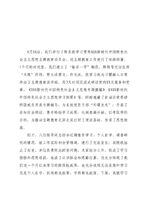 X月XX日,我们举行了局系统学习贯彻XXX新时代中国特色社会主义思想主题教育动员会,对主题教育工作进行了安排部署。1个月的时间里,我们建立了每日一学制度,局领导充分发挥头雁作用,带头读原文、作交流,使学习成为习惯融入日常举办了主题教育读书班,用3天时间沉浸式研读党的XX大报告和党章,《XXX新时代中国特色社会主义思想专题摘编》《XXX新时代中国特色社会主义思想学习纲要》等,同时邀请了自治区党委讲师团成员开展专题辅导,为系统党员干部补课充电;开展了应知应会测试,集中检验学习成果,达到查漏补缺、以考促学的目的,为推动主题教育走深走实打好了理论基础、夯实了思想根基。刚才,几位领导同志结合近期集中学习、个人自学、调查研究的情况,就工作实际和分管领域,进行了交流发言;我随机抽点了处室、单位负责同志回答问题,大家结合工作,既谈了学习感悟和思想收获,也谈了认识体会和思路打算,这充分体现了我们这一个月以来学习的阶段性成果,也充分说明无论是集中学习还是个人自学,抓得都比较紧,学得都比较深。下面,我就学习XXX新时代中国特色社会主义思想谈几点体会,与同志们共勉。一、坚持用XXX新时代中国特色社会主义思想统一认识,在感悟思想伟力中汲取前进动力XXX新时代中国特色主义思想是马克思主义中国化的最新成果,是中国特色社会主义理论体系的重要组成部分,是党和人民实践经验和集体智慧的结晶,是国家政治生活和社会生活的根本指针。我们坚持第一议题制度,第一时间学习XXXXXX系列重要讲话,其中有些篇目都已经学习过多次,但每学一次都有新的收获、都深受启发,从中汲取了整装再出发的强大精神动力。越学越认识到,新时代十年之所以取得如此巨大的成就,根本在于XXXXXX的掌舵领航,根本在于XXX新时代中国特色社会主义思想的科学指引。近年来,XXXXXX高度重视XX工作,关心XX事业发展,多次对国土空间规划、生态保护修复、耕地保护等工作作出重要指示批示,为XX整体性、系统性、重构性改革和高质量发展指明了方向、提供了遵循。我们深入贯彻落实XXXXXX视察XX重要讲话指示批示精神,主动担当作为、务实苦干创新,为全区经济社会高质量发展作出了积极贡献,推动XX事业实现了更大发展就是生动实践和有力印证。新征程上,我们必须坚持以XXX新时代中国特色社会主义思想为指导,坚定四个自信,更有定力、更有自信、更有智慧地推动XX事业沿着正确的方向前进。越学越认识到,坚持人民至上是我们工作的出发点和落脚点XXXXXX是从人民中成长起来、深受人民爱戴的人民领袖,始终以国家需要为使命、以人民利益为准绳,为我们树立了模范榜样。XX工作具有鲜明的人民属性和民生属性,比如:强化资源要素保障,稳住经济大盘;坚持规划引领,促进乡村振兴;都是事关民生的大事。再比如:抓好地质灾害防治,全面落实隐患排查,筑牢地灾防线,这更是坚持人民至上、生命至上的具体体现。作为XX人,我们必须牢记XXX教导,把人民群众满意不满意作为评判主题教育成效的根本标准,让现代化建设成果更多更公平惠及人民群众。越学越认识到,只有坚持读原著、学原文、悟原理,加深对XXX新时代中国特色社会主义思想蕴含其中的科学内涵、观点方法实践要求的理解把握,才能不断提高政治站位和理论素养,更好地用于实践、指导实践,更好地履职尽责、推动改革发展,更好地服务全区经济社会发展。我们要紧紧抓住这次主题教育的契机经常对标对表,及时校准偏差,把贯彻落实党中央精神体现到守好三条控制线,立足四个定位,实施五个战略,建设五个XX,推进XX治理体系和治理能力现代化的实践中去,努力推动主题教育取得实实在在的成效。二、坚持用XXX新时代中国特色社会主义思想武装头脑,在学思践悟中锤炼本领XXX新时代中国特色社会主义思想在指导新时代伟大实践中,展现出强大的真理力量和实践伟力,是我们认识世界和改造世界的强大思想武器,必须在学懂弄通做实上下功夫。坚持不懈在深学上下功夫,以学懂促深化。XXX新时代中国特色社会主义思想涵盖内容广,是一部学不完、学不够的百科全书,仅靠读几遍原文、听几次辅导是远远不够的。这段时间,我们取得了一定的学习成效,但距离凝心铸魂筑牢根本的目标要求还有差距,一些同志由于出差、培训等,影响了集中学习时间、落下了读书学习进度;各党支部之间、党员干部之间都参差不齐,有的抓得较严、盯得较紧,有的认识不足、进度较慢。局主题教育督导组在前段时间的检查中发现,有的支部没有列学习计划,有的同志对一些基本概念搞不清楚、答不上来,这是不应该的,更是不符合规定要求的,一定要引起高度重视。我们要大力弘扬理论联系实际的马克思主义学风,把本处室、单位实际工作带入到学习中来,查一查我们是不是学到位做到位,想一想我们还差什么怎么办,真正做到学以致用,知行合一。坚持不懈在