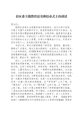 在区委主题教育读书班结业式上的讲话同志们:按照区委举办主题教育读书班的要求,我们分两个阶段,开展了为期7天的集中学习,既是贯彻落实市委工作要求,也是区委开展主题教育的重要安排。主要目的,就是通过在座各位的示范带动,引领全区广大党员干部深入学习贯彻XXX新时代中国特色社会主义思想,在学习中凝聚奋斗之力,在思考中坚定为民之心,在交流中提升落实能力。开班以来,同志们紧紧围绕学思想、强党性、重实践、建新功总要求,通过开展专题辅导、交流研讨、观看专题片、个人自学的形式,对XXX新时代中国特色社会主义思想有了更深的理解和把握,不断增进了对党的创新理论的政治认同、思想认同、理论认同、情感认同。刚才,三名学员代表谈了对理论学习的认识体会,讲了贯彻落实的思路举措,听后很受启发。总的来讲,这次主题教育读书班,达到了学有所思、学有所悟、学有所得、学有所获的目的。主要体现在三个方面:一是理论武装持续强化。这次读书班,大家坚持读原著、学原文、悟原理,集中精力聆听辅导,深入开展研讨交流,不断强化理论武装、提升政治素养,这既是一次触及灵魂的思想淬炼,也是一次生动深刻的政治历练,更是一次凝心聚力的实践锻炼,在学思想上充了电,在强党性上补了钙,在重实践上加了油,在建新功上赋了能,为深入开展主题教育奠定了思想基础和理论基础。二是政治意识持续增强。学习期间,大家始终保持饱满的政治热情和良好的精神状态,能够静下心来学习、沉下心来思考、潜下心来感悟,深学细研党的XX大报告、党章、《XXX著作选读》《XXX新时代中国特色社会主义思想专题摘编》等规定书目,全面学习领会XXX新时代中国特色社会主义思想的科学体系、核心要义、实践要求,进一步增强了政治判断力、政治领悟力、政治执行力。三是学习成效持续提升。这次读书班,大家坚持一手抓理论学习、一手抓重点工作,积极克服时间紧、任务重的工学矛盾,开展专题辅导学习4次、研讨交流4次,围绕以商贸物流为重点如何开展工作XXXXXX在正定工作期间推出人才九条的实践与启示等主题,谈体会、谈认识,摆问题、找差距,提建议、明措施,在学习交流中坚定了理想信念、凝聚了思想共识,在集思广益中增强了信心决心、找准了着力方向,激发出为党尽责、为民分忧、担当作为的精气神。同时,我们在学习的过程中,也发现一些问题。一方面,有些同志对这次培训重视程度不够,存在迟到早退甚至缺席的现象。另一方面,在交流研讨环节,有些同志学习效果不理想,对XXX新时代中国特色社会主义思想学深悟透不够、思考不深入、发言质量不高,理论联系实际不紧密。希望大家引起高度重视并加以改正。下面,围绕推动主题教育走深走实,提三点要求。一、以深学促深化,认真总结学习成果,坚持勤充电常补钙。开展这次主题教育,就是要将党的创新理论武装贯穿始终,推动理论学习常态化、长效化,教育引导广大党员干部坚持不懈用XXX新时代中国特色社会主义思想凝心铸魂,筑牢信仰之基、补足精神之钙、把稳思想之舵。各处级领导要先学一步、深学一层,以身作则、以讲促学,以关键少数示范带动全区广大党员干部层层跟进。要强化分类指导,依托三会一课、主题党日等活动,采取灵活多样务实管用的措施开展学习,注重抓好分管部门青年党员、离退休干部(职工)党员和流动党员的学习,推动主题教育全覆盖。要坚持学以致用、知行合一,把学习贯彻党的创新理论与XXXXXX对河北工作、对张家口工作的重要指示批示精神结合起来,学深悟透、融会贯通,把XXX的关怀厚爱转化为干事创业的激情动力,推动思想大解放、能力大提升、作风大转变、工作大落实,确保党中央决策部署和省、市委要求落地落实。二、以细悟促内化,充分领会核心要义,持续推动主题教育走深走实。要深刻领悟XXX新时代中国特色社会主义思想蕴含的真理味道、思想力量,全面把握XXX新时代中国特色社会主义思想的科学体系、精髓要义和实践要求,切实做到知其言更知其义、知其然更知其所以然。深刻把握这一伟大思想的世界观、方法论和贯穿其中的立场观点方法,增强推动高质量发展本领、服务群众本领、防范化解风险本领,以实际行动坚定拥护两个确立、坚决做到两个维护。要持续深化学XXX讲话、谋张家口发展活动和解放思想大讨论,以三找为重要抓手,在思想上对标、政治上对表、行动上看齐,聚焦国家重大战略部署,分领域、分行业、分类型进行梳理研究,从中找方法、找路径、找答案,进一步增强学习的针对性、实效性,用党的创新理论指导实践、推动工作。要大兴调查研究之风,把理论学习与调查研究紧密结合,围绕难点堵点问题和群众急难愁盼问题,深入街道社区、乡村农户、田间地头、项目现场、企业车间搞清楚问题是什么、症结在哪里,真正把情况摸清、把问题找准、把对策提实,真正让人民群众看到变化、得到实惠。三、以笃行促转化,以深入开展主