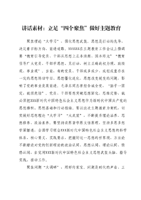 讲话素材:立足四个聚焦做好主题教育聚焦理论大学习,强化思想武装。思想是行动的先导,决定着目标方向、前进道路。XXXXXX在主题教育工作会议上强调要教育引导党员、干部从思想上正本清源、固本培元教育引导广大党员、干部学思想、见行动,树立正确的权力观、政绩观、事业观。当前,有的党员、干部或多或少、或轻或重存在一定的思想陈旧守旧、思想僵化退化、思想改变蜕变的问题,影响了党的事业发展前进。毛泽东同志曾经告诫全党,脑子一固定,就很危险。党员、干部要想突破思想固化、思维定势,就必须把XXX新时代中国特色社会主义思想作为新时代中国共产党的思想旗帜、思想基础和行动指南。要以这次主题教育为契机,切实做好思想理论大学习大武装,不断提升理论涵养、思想修养、政治素养。要坚持读原著学原文悟原理,坚持多思多想学深悟透,全面学习领会XXX新时代中国特色社会主义思想的科学体系、核心要义、实践要求,把握好这一思想的世界观、方法论不断增进对党的创新理论的政治认同、思想认同、理论认同、情感认同,自觉用XXX新时代中国特色社会主义思想武装头脑、指导实践、推动工作。聚焦问题大调研,用好传家宝。问题是时代的声音、工作的导向。XXXXXX强调,这次主题教育,要教育引导各级党组织和广大党员、干部突出问题导向把问题整改贯穿主题教育始终,让人民群众切实感受到解决问题的实际成效。坚持问题导向是XXX新时代中国特色社会主义思想的世界观和方法论的重要内容,是党重要的思想方法和工作方法,也是这次主题教育的一个鲜明特点。如何明确问题、解决好问题?调查研究是关键。要按照党中央关于在全党大兴调查研究的工作方案,结合各自实际制定调研方案、明确调研重点、注重调研方式、确保调研效果,大兴调查研究之风。调研的目的是解决问题、服务群众、推动发展。要注重调研成果转化运用,切忌一调了之一研完事力戒形式主义、官僚主义、拿来主义,真正把调研作为指导工作的有力武器、解决难题的有效法宝、推动发展的宝贵财富,切实把调研成果转化为解决问题、改进工作的实际举措。聚焦质量大提高,推动高质量发展取得新成效。党的XX大报告指出,高质量发展是全面建设社会主义现代化国家的首要任务。XXXXXX指出,要紧紧围绕高质量发展这个全面建设社会主义现代化国家的首要任务以推动高质量发展的新成效检验主题教育成果。高质量发展既要有质,也要有量。推动高质量发展必须更好统筹质的有效提升和量的合理增长,只有质和量并驾齐驱,才能更好地提质增量,才是真正意义上的高质量。我们要聚焦质量大提高,实现发展大跨越,就要做好滚动发展,像滚雪球那样越滚越大越滚越强。推动高质量发展,需要以强化理论学习指导发展实践,以深化调查研究推动解决发展难题,紧盯影响和制约本地区本部门本单位高质量发展的问题,深挖根源、有的放矢、靶向治疗。让发展快速转动起来、滚动起来,还应着力消除影响干部担当作为的各种消极因素,为担当者担当、为负责者负责、为干事者撑腰,提振党员、干部奋进新征程、建功新时代,推动高质量发展的精气神。聚焦为民大服务,让党员、干部冲在前。全心全意为人民服务是我们党的根本宗旨。XXXXXX指出:要教育引导广大党员、干部牢固树立以人民为中心的发展思想,坚持一切为了人民一切依靠人民,自觉问计于民、问需于民,始终同人民同呼吸、共命运、心连心,通过做大蛋糕不断增进民生福祉,着力解决人民群众急难愁盼问题,把惠民生、暖民心、顺民意的工作做到群众心坎上,增强人民群众获得感、幸福感、安全感。践行党的根本宗旨,要坚持人民至上,把人民对美好生活的向往作为我们的奋斗目标,任何时候都必须把人民利益放在第一位,把实现好、维护好、发展好最广大人民的根本利益作为一切工作的出发点和落脚点。各地区各部门各单位要围绕做大蛋糕,聚力做好服务,通过开展主题党日我为群众办实事党员社区双报到党旗在一线高高飘扬党员先锋岗等主题实践活动,切实让广大党员活起来、动起来,将作用发挥出来,把惠民生的事办实、暖民心的事办细、顺民意的事办好,不断解决群众急难愁盼,让广大群众切身感受到主题教育带来的新变化、新成效。