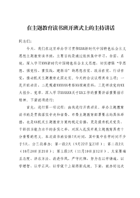 在主题教育读书班开班式上的主持讲话同志们:今天,我们在这里举办学习贯彻XXX新时代中国特色社会主义思想主题教育读书班,主要目的是通过组织集中学习,全面、系统、深入学习XXX新时代中国特色社会主义思想,切实增强学思想、强党性、重实践、建新功的思想自觉、政治自觉、行动自觉,推动机关主题教育走深走实。今天的会议议程共有三项:一是开班动员,二是观看XXXXXX考察XX视频资料,三是研读党的XX大报告、党章,深入学习XXXXXX关于XX工作的重要讲话重要指示精神。下面逐项进行:首先,进行第一项议程:由我进行开班动员。举办主题教育读书班是贯彻落实中央和省委、市委主题教育部署要求的具体举措,也是XX机关主题教育方案的既定安排,更是提升机关党员、干部担当能力水平的务实之举,对深入扎实开展主题教育具有十分重要的意义。本次读书班安排7天时间,其中集中自学时间不少于5天,分三段举办:第一段2天(9月22日至23日);第二段2天(10月20日至21日);第三段3天(11月10日至12日)。大家要端正态度、讲求方法、改进作风、严守纪律,努力在以学铸魂、以学增智、以学正风、以学促干上取得新成效。下面,就办好这次主题教育读书班,我讲三点意见。一要提高政治站位,充分认识举办主题教育读书班的重要意义。举办学习贯彻XXX新时代中国特色社会主义思想主题教育专题读书班,是主题教育的重要环节,以读书班的形式让领导干部沉下身来、静下心来,专心致志学原著、联系实际谈体会,以优良的学风深化对党的创新理论的理解和把握,提高运用科学理论解决实际问题的能力,不仅是关键少数强化理论武装、夯实思想根基的需要,更能引领广大党员干部更加深刻地认识以党的创新理论武装头脑的必要性,进而增强理论学习的积极性、主动性对于坚持不懈用XXX新时代中国特色社会主义思想武装全党、教育人民、指导实践具有重要意义。大家要切实发挥读书班的引领作用,强化学习自觉,进一步强化理论武装,进一步统一思想,认真学习领会XXXXXX在中央主题教育工作会议上的重要讲话精神,学好用好主题教育学习资料,不断从XXX新时代中国特色社会主义思想中汲取智慧和力量,持续用马克思主义中国化时代化最新成果武装头脑、指导实践、推动工作。二要真学细学,在学深悟透上下功夫。作为当代中国马克思主义、二十一世纪马克思主义,XXX新时代中国特色社会主义思想是系统全面、逻辑严密、内涵丰富、内在统一、不断发展的科学理论体系。大家要以XXXXXX在中央主题教育工作会议上的重要讲话精神为根本遵循,紧紧围绕主题教育的目标任务,把党章、XX大报告、《XXX著作选读》、《XXX新时代中国特色社会主义思想专题摘编》作为案头卷,逐篇逐句学,在字里行间领悟原汁原味的理论内涵,对重要篇目、关键章节更要反复研读、透彻理解,做到心无旁骛研读书目、沉心静气开展自学、深入有效研讨交流,确保学有所获、学有所悟、学用相长,全面学习领会XXX新时代中国特色社会主义思想的科学体系、精髓要义、实践要求做到整体把握、融会贯通。三是深思善思,在真懂真信上见真章。不深思而得者,其得易失。XXX新时代中国特色社会主义思想是马克思主义的升华其精神实质不言而喻。大家在学习过程中要边学边悟,要以如切如磋、如琢如磨的学思悟态度,凡事多想一想是什么,多问几个为什么,深入理解XXX新时代中国特色社会主义思想的博大精髓、实质内涵,在深学细照笃行中提高理论素养、坚定理想信念升华觉悟境界、增强能力本领,夯实坚定拥护两个确立、坚决做到两个维护的思想根基。大家要坚持问题导向,在学习中聚焦问题学、在研讨中奔着问题去,充分利用分组研讨和集中研讨多交流、多沟通,畅谈学习收获和感想,在思想碰撞中加深理解、提高认识、相互启发、共同提高,推动学习成果转化为开展工作的新思路、解决问题的新办法。四是学以致用,在实干笃行上求实效。XXXXXX深刻指出,学习的目的全在于运用。我们学习理论,不是为了装点门面,而是为了理论武装,为了运用这一理论去解决问题、推动工作。离开理论联系实际,就半点马克思主义也没有。我们要大力弘扬理论联系实际的马克思主义学风,把开展主题教育读书班同贯彻落实中央及省委、市委的部署要求结合起来,同推进年度工作结合起来,同深化机关建设结合起来,带着问题学、联系实际学,干什么学什么,缺什么补什么,重点学习XXXXXX关于XX工作的重要讲话重要指示精神,学习XXXXXX关于XX工作的重要思想,做到两手抓、两促进,将焕发出来的学习、工作热情转化为攻坚克难干事创业的强大动力。下面,进行第二项议程:观看XXXXXX考察XX视频资料。请工作人员播放视频。……(观看完毕)最后一项议程:请各位党员、干部认真研读党的XX大报告、党章,深入学习XXXXXX关于XX工作的重要讲话重要指示精神。