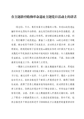 在主题教育瞻仰革命遗址主题党日活动上的讲话同志们,今天,我们怀着无比崇敬的心情,来到xx战役遗址缅怀革命先烈的丰功伟绩,表达我们的深切悼念和崇高敬意,汲取坚定理想信念、改进工作作风、密切联系群众的强大力量。刚才,我们瞻仰了战役遗址,重温了入党誓词,xx同志讲授了专题党课,部分党员干部作了交流发言,活动形式丰富多样,意义鲜明深刻。特别是聆听了区委党校xx副校长作的《中国共产党当之无愧是中华民族抗日战争的中流砥柱》专题讲座,令人感慨颇深受益匪浅,让我们再次以热烈的掌声表示感谢。下面,结合主题教育及局重点工作,我再讲三点意见。一要持之以恒抓好学习。第二批主题教育开展以来,局党组及时印发了主题教育《实施方案》,各党支部结合实际制定了学习计划,通过必学+选学、个人自学+集体学习、理论+业务相结合等方式,组织全体党员干部深入开展理论学习,取得了阶段性成效,获得了区委主题教育指导组的肯定。但对照区委主题教育工作要求,仍然还存理论学习不够全面深入、学用结合不够紧密等问题。当前,在第二批主题教育深入开展的关键时刻,全局上下要进一步提高思想认识,认真总结前期经验、弥补不足,组织全体党员干部及时跟进学习XXXXXX关于主题教育的重要讲话和重要指示批示精神,系统学习党的XX大报告、党章、《XXX新时代中国特色社会主义思想专题摘编》3个必读书目,着重学习局主题教育办公室编制的《XXX关于xx工作重要论述选编》,原原本本学联系实际学、带着问题学,推动理论学习入心入脑、见行见效,确保在以学铸魂、以学增智、以学正风、以学促干上取得实效。二要从严从实抓好问题整改。坚持边学习、边对照、边检视边整改,把问题整改贯穿主题教育始终和全过程。各党支部要围绕执行上级组织决定、严格组织生活、加强党员教育管理监督、联系服务群众、抓好自身建设等方面,通过自己找、上级点、群众提、互相帮、集体议等方式,认认真真查,仔仔细细找,深入查摆不足和存在问题。问题检视要同实际工作紧密结合起来,坚决防止走过场、大而化之、隔靴搔痒,防止避重就轻、避实就虚坚持把当下改和立长久结合起来,对于排查出的问题,要由外到内、由表及里,找准症结,深挖根源,分门别类建立问题台账。能立即整改的,绝不拖延,立行立改;对涉及面广,需要一定时间整改的,认真制定方案、明确责任、限时整改;对情况复杂、推进困难,需要上级协调解决的,主动汇报,争取支持加快整改。特别是对反复出现的问题,要注重从制度上找原因,做好完善机制、建章立制的工作,坚决防止问题再次反弹、回潮三要学以致用抓好成果转化。这次主题教育总要求是学思想、强党性、重实践、建新功。学思想是打头的,是贯穿始终的主线,以建新功为落脚点,就是要求把学思想的成果转化为建新功的实效。10月21日至22日中共中央政治局常委、中央书记处书记蔡奇在陕西宁陕县调研时强调:第二批主题教育在群众身边开展,越到基层越要突出一个实字。主题教育归根结底就是要落到以学促干上。要全力冲刺年度目标任务,今天是12月1号,2023年仅剩1个月的时间,各股室、各单位要对照年度考核指标体系、年初公开承诺,认真开展回头看,挖掘亮点、补足短板,确保2023年考核能够取得优异成绩要扎实做好当前各项重点工作,年末岁尾,工作头绪多、任务重越是这个时候越不能松懈,要紧紧围绕全区重点项目要素保障、民生服务和自然资源保护职责,采取强有力的举措,加大督导指导力度,加快推进全区耕地流出整改、占补平衡项目实施、重点项目征地拆迁、地灾项目治理、打击私挖盗采等工作,确保XXX新时代中国特色社会主义思想在自然资源系统落地见效。要积极践行四下基层工作方法,严格落实科级领导包联镇办制度,深入开展调查研究,认真查找、分析全区自然资源工作的突出问题、短板及其根源,充分了解群众所思所盼。精准把握保护什么、怎么保护?保障什么,怎么保障?服务什么、怎么服务?要认真践行XXXXXX关于党风廉政建设和反腐败斗争重要论述,切实转变工作作风,牢固树立正确的世界观、人生观、价值观、权力观、地位观和利益观,时刻保持警钟长鸣,时刻保持头脑清醒,不断提高自身的思想觉悟和道德水准,筑牢廉洁自律的思想防线。青山埋忠骨,深情慰忠魂。让我们更加紧密地团结在以XXX同志为核心的党中央周围,高举中国特色社会主义伟大旗帜,深入开展主题教育活动,以革命先烈为榜样,秉持初心、牢记使命砥砺前行、卓厉奋发,为奋力谱写xx新时代高质量发展新篇章作出新的更大贡献,告慰革命先烈在天之灵!