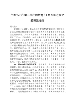 市委书记在第二批主题教育11月份推进会上的讲话提纲同志们:根据党中央部署,第二批学习贯彻XXX新时代中国特色社会主义思想主题教育在省以下各级机关及其直属单位和其他基层党组织开展,从今年9月开始,明年1月基本结束。当前已经过了五分之三的时间,各项工作也取得了阶段性成效。今天我们召开第4次主题教育阶段推进会,主要任务是以XXX新时代中国特色社会主义思想为指导,深入学习贯彻XXXXXX关于开展主题教育的系列重要讲话和重要指示精神,总结讲评工作,部署安排任务,进一步推进主题教育扎实有效开展。刚才,指导组组长代表省委第十三巡回指导组作了讲话,对我市主题教育开展情况既肯定了成绩,也指出了问题,更提出了明确的指导意见,对我们既是鼓舞更是鞭策,全市各级各部门要全面抓好贯彻落实,推动主题教育不断往心里走、往深里走、往实里走。下面,我再讲四点意见。一、要充分认清前期状况。总的来看,各单位能够精心谋划部署、细化具体措施、创新教育载体,通过学原文、读原著、悟原理搞好深入系统全面学习,通过集体查、个人纠、群众评等方式搞好检视整治,通过上级查、本级督、下级提等方式搞好督导推进,大家在理论学习上有了新感悟、在问题整改上有了新高度、在推动工作上有了新成效,取得扎扎实实成效,但在肯定进展成效的同时,也要清楚看到还不同程度存在一些短板弱项。一是学习教育存在不够平衡的现象,有的集体学习好于个人自学,指定书目学习进度缓慢,个人学习成效不够明显,特别是基层末端的学习抓得还不够紧,一些单位没有开展专题研讨。二是问题整改存在不够深入的现象,制定的措施不具体,推进整改不力,特别是有的没有支撑材料,就整改抓整改,与实际结合不紧密,没有举一反三。三是方式方法存在不够灵活的现象,有的领导干部调研次数偏少、部分工作项目清单不够精准,把办实事泛化、简单化,将日常工作与解决群众急难愁盼问题混为一谈,请进来、走出去的方式也不够灵活,部分单位还没有邀请驻地党校的专家教授开展宣讲活动;四是宣传氛围存在不够浓厚的现象,电视、报刊和网络的宣传力度还不够,重点路段、公共场所、部分单位看不到宣传内容,部分单位上报信息质量不高,与学习教育关联不紧密,特别是部分单位对市县信息约稿反应不及时,上报素材迟缓,在出经验、出典型、出创新上存在较大距离。二、要持续抓实理论学习。要紧紧围绕学思想、强党性、重实践、建新功的总要求,牢牢把握深入学习贯彻XXX新时代中国特色社会主义思想这一主题主线和根本任务,做到以学铸魂,紧跟核心强忠诚;以学增智,理论武装强本领;以学正风,廉洁奉公强宗旨;以学促干,推动发展强担当。要牢牢把握用XXX新时代中国特色社会主义思想武装头脑,毫不松懈地反复深入学习党的XX大报告、党章、《XXX著作选读》《XXX新时代中国特色社会主义思想专题摘编》,跟进学习XXXXXX系列最新重要讲话,力求学懂弄通、学深悟透,确保将XXX新时代中国特色社会主义思想和指示精神流淌在血液中、铭记在脑海里。要结合集中自学、彼此交流、警示教育等多种方式,不断加深认识和把握历史规律、历史趋势的能力,在思想和认识上明确我们党从哪里来、到哪里去,继往开来,砥砺前行,奋斗新时代。三、要持续抓严问题整改。学习贯彻XXX新时代中国特色社会主义思想主题教育,自上而下分两批开展,第一批主题教育有些问题本级不能解决,需要下级解决。要坚持边学习、边对照、边检视、边整改,把问题整改整治贯穿始终,解决真问题、真解决问题。必须坚持问题导向,对于检视出来的问题短板,必须立足自身主动改,承接落实涉及自己的任务,上下互动、抓好整改,更要注重联动合力,联合会诊把脉的同题共答,要上下贯通、合力攻坚。要坚持边查边改,建好问题清单,逐条逐项抓好问题整改,动态更新、及时增减问题清单,对需要开展专项整治的问题,要认真制定方案,严密组织实施,努力变问题清单为满意清单。把建章立制与解决问题统一起来,既拿出当下改的举措,又善于运用制度思维和制度方式补短板、堵漏洞、固根本,形成长久立制度机制,防止问题反弹。四、要持续抓细提质增效。主题教育开展得如何,最终看效果。要坚持在实做上求成效,坚持知行合一,聚焦精准发力,动真碰硬解难题求实效。要深入把当前调查研究形成的成果进行再细化,深入查找自身在工作作风和生活作风上的不足,聚焦已经凸显的各种问题,列出问题清单,从严从实、标本兼治,加大成果转化力度,带动突出问题的有效解决。要坚持把改善人民群众生活时刻放在心上、抓在手上、扛在肩上,做到谋划实、推进实、作风实,真抓实干,拼出一流干劲,干出一流业绩,提升民生温度,让党放心,让人民满意。全体党员干部特别是领导干部要深入把当前调查研究形成的成果进行再细化,深入查找自身在工作作风和生活作风上的不足,聚焦已经凸显的各种问题,列出问题清单,从严从实、标本兼治,加大成
