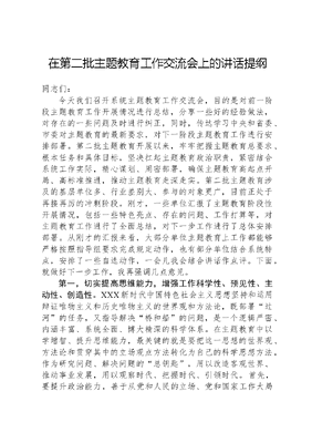 在第二批主题教育工作交流会上的讲话提纲同志们:今天我们召开系统主题教育工作交流会,目的是对前一阶段主题教育工作开展情况进行总结,分享一些好的经验做法,对存在的一些问题及时进行纠正,同时,传达学习中央和省委、市委对主题教育的最新要求,对下一阶段主题教育工作进行安排部署。第二批主题教育开展以来,牢牢把握主题教育总要求、根本任务和具体目标,坚决扛起主题教育政治职责,紧密结合系统工作实际,精心谋划、周密部署,确保主题教育高起点开局、高标准推进,推动主题教育走深走实。第二批主题教育涉及的基层单位多、行业差别大、参与的对象更广,目前正处于再接再厉的冲刺阶段。刚才,一些单位汇报了主题教育阶段性开展情况,包括一些特色亮点、存在的问题、工作打算等,对主题教育工作进行了全面总结,对下一步工作进行了总体安排部署。从刚才的汇报来看,大部分单位主题教育上工作都能够严格按照指导组要求完成规定动作,也有部分单位结合系统特点,安排了一些自选动作,一会儿我会结合讲话作点评。下面,就做好下一步工作,我再强调几点意见。第一,切实提高思维能力,增强工作科学性、预见性、主动性、创造性。XXX新时代中国特色社会主义思想坚持和运用辩证唯物主义和历史唯物主义的世界观和方法论,既部署过河的任务,又指导解决桥和船的问题,是一个逻辑严密、内涵丰富、系统全面、博大精深的科学体系。在主题教育中以学增智、提升思维能力,最关键的就是要把这一思想的世界观、方法论和贯穿其中的立场观点方法转化为自己的科学思想方法,作为研究问题、解决问题的总钥匙,用以改造客观世界、推动事业发展,用以观察时代、把握时代、引领时代。首先,要提升政治能力,善于从党和人民的立场、党和国家工作大局出发想问题、作决策、办事情。善于从繁杂问题中把握事物的规律性,从苗头问题中发现事物的趋势性,从偶然问题中认识事物的必然性。在实践中发挥好这一强大思想武器的望远镜和显微镜作用,做到见微知著,从错综复杂的矛盾关系中把握政治逻辑。善于驾驭复杂局面、凝聚社会力量、防范政治风险,切实担负好党和人民赋予的政治责任,真正成为政治上的明白人。其次,提升思维能力,把XXX新时代中国特色社会主义思想的世界观、方法论和贯穿其中的立场观点方法作为研究问题、解决问题的总钥匙,内化为看待事物、理解问题的科学思想方法。XXXXXX强调,要切实提高战略思维、辩证思维、系统思维、创新思维、历史思维、法治思维、底线思维能力。把握好全局和局部、当前和长远、宏观和微观、主要矛盾和次要矛盾、特殊和一般的关系,在面对各种矛盾问题和重大风险挑战时始终做到方向明确、头脑清醒、应对有方、行动有力。在实际工作中,要真学真信真用、学懂弄通做实XXX新时代中国特色社会主义思想,既要强化理论学习,又要深入调查研究,真正做到善于把握事物本质、把握发展规律、把握工作关键、把握政策尺度,增强工作科学性、预见性、主动性、创造性。最后,提升实践能力,做好结合、转化、提升的文章,把学习党的创新理论与学习贯彻党的XX大精神紧密结合起来,与贯彻落实XXXXXX关于教育的重要论述和重要讲话精神紧密结合起来,抓重点、补短板、强弱项的具体实际行动,这样才能将党的创新理论落到实处,真正发挥作用。第二,切实站稳人民立场,不断实现发展为了人民、发展依靠人民、发展成果由人民共享。办实事、解民忧,践行宗旨为民造福,是本次主题教育的重要内容,也是要达到的具体目标之一。在XXX新时代中国特色社会主义思想中,人民二字具有基础性、根本性,人民至上是理论基点、价值支点、实践原点,也是我们党治国理政的出发点、落脚点。只有站稳人民立场,坚持全心全意为人民服务的根本宗旨,始终把人民利益放在最高位置,始终同人民站在一起、想在一起、干在一起,才能赢得民心、赢得时代、赢得未来,在强国建设、民族复兴的新征程上创造新的历史伟业。如何办实事、解民忧,摸清实际情况,是解决实际问题的前提和基础。实际问题如何破,书本上没有现成答案,文件里没有万能模板,需要走出办公室,走到群众身边,掌握第一手资料。要深入基层一线,与人民同进同出同劳动,系统解决有的党员、干部理论学习兴趣不浓,学不进去,学习走形式装样子问题。既要在读原著、学原文、悟原理中答疑解惑、豁然开朗,更要脚沾泥土去联系实际、联系工作、联系生活,把为民宗旨内化于心、外化于行,筑牢用心谋事、专心干事、尽心成事之基,让人民立场在主题教育中坚如磐石。要深入基层开展调查研究,着力解决有的学习不系统不深入,一知半解、浅尝辄止,知其然不知其所以然问题。要多与人民下田劳作、多看人民柴米油盐、多找人民听取呼声,在与群众促膝谈心中,认真记录人民所思所想所盼,确保学习效果看得见摸得着。要如实填好责任清单、问题清单、整改清单,在人民的操心事烦心事揪心事中找差距,