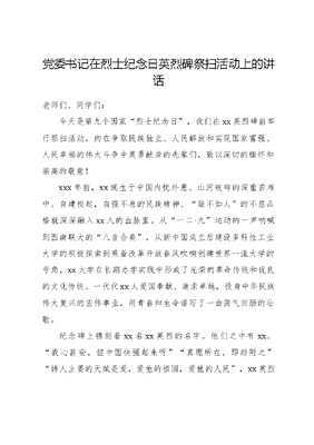 党委书记在烈士纪念日英烈碑祭扫活动上的讲话老师们、同学们:今天是第九个国家烈士纪念日,我们在xx英烈碑前举行祭扫活动,向在争取民族独立、人民解放和实现国家富强、人民幸福的伟大斗争中英勇献身的先辈们,致以深切的缅怀和崇高的敬意!xxx年前,xx诞生于中国内忧外患、山河破碎的深重苦难中。自建校起,自强不息的民族精神、耻不如人的不屈品格就深深融入xx人的血脉里。从一二·九运动的一声呐喊到西南联大的八音合奏,从新中国成立后建设多科性工业大学的积极探索到乘着改革开放春风吹响创建世界一流大学的号角,xx大学在长期办学实践中形成了光荣的革命传统和优良的文化传统。一代代xx人爱国奉献、追求卓越,投身中华民族伟大复兴的宏伟事业,用青春和生命谱写了一曲荡气回肠的壮歌。纪念碑上镌刻着xx名xx英烈的名字。他们之中有xx。我心甚安,但中国快强起来呀真理所在,即趋附之诗人主要的天赋是爱,爱他的祖国,爱他的人民,xx英烈们震撼心灵、穿越时空的话语,给了我们不惧任何风雨的勇气和永远自强奋进的力量。煌煌英烈照穹苍,清节高名锦绣肠。在中国共产党一百多年的非凡奋斗历程中,涌现了一大批视死如归的革命烈士、一大批顽强奋斗的英雄人物、一大批忘我奉献的先进模范,构筑起以伟大建党精神为源头的中国共产党人的精神谱系。我们要继续弘扬光荣传统、赓续红色血脉,永远把伟大建党精神继承下去、发扬光大,以更加昂扬奋进的精神状态为夺取中国特色社会主义新胜利而奋斗。当前,我们正在召开学校第十五次党代会,系统回顾学校过去五年来的发展成绩,全面总结新时代以来办学治校的宝贵经验,凝心聚力、奋发有为,把立德树人作为根本任务,把服务国家作为最高追求,把学科建设作为发展根基,把深化改革作为强大动力,把加强党的建设作为坚强保证,努力开拓学校高质量发展新局面、书写中国特色世界一流大学建设新篇章。老师们,同学们,理想之光不灭,信念之光不灭,英烈的爱国主义精神不会过时。让我们在烈士缔造的丰碑前再次出发,肩负起民族复兴的时代重任,更加紧密地团结在以XXX同志为核心的党中央周围,以实际行动迎接党的XXX胜利召开,在全面建设社会主义现代化国家、全面推进中华民族伟大复兴的历史进程中踔厉奋发、勇毅前行!