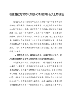 在主题教育常态化制度化动员部署会议上的讲话这次会议是经xx局党委审议决定召开的一次十分重要的会议会议的主要任务是:按照全党部署要求,认真贯彻落实部政治部和xx局党委的统一安排,教育引导广大干部群众切实熔铸忠诚魂激励斗志,强固四个意识、坚定四个自信,忠诚履行职责使命,圆满完成各项任务。xx局在4月末已经下发了教育实施方案,按照要求今年支队级(含)以下单位不再制订方案,希望各单位按照xx局方案要求,结合实际制定具体措施,认真抓好贯彻落实。下面,受周富章政委和李建春xx局长委托,我代表xx局党委讲三点意见。一、凝聚思想共识,增强政治自觉,认清开展维护核心、听从指挥主题教育活动学习教育常态化制度化的重大意义一是要充分认识到,开展维护核心、听从指挥主题教育活动和推进主题教育学习教育常态化制度化,是贯彻落实系列重要讲话精神、坚决维护习XXX核心地位的政治要求。确立习XXX的核心地位,反映了全党的共同意志,反映了全国各族人民的共同心愿。当前我们正处在世界格局深刻调整、国际竞争日趋激烈的时代条件下,处在国内改革全面深化、发展全面推进的重要时期比任何时候都更需要一个坚强的领导核心,更需要坚定维护核心自觉看齐追随。开展维护核心、听从指挥主题教育活动和推进主题教育学习教育常态化制度化,就是要教育引导广大干部群众增强政治意识、大局意识、核心意识、看齐意识,坚决听从党中央、中央军委和XXX指挥,为实现事业创新发展贡献智慧力量二是要充分认识到,开展维护核心、听从指挥主题教育活动和推进主题教育学习教育常态化制度化,是持续推动全面从严治党、严肃党内政治生活的重要抓手。去年以来,全省xx队伍扎实开展了主题教育学习教育并取得了显著成效。实践证明主题教育学习教育只有常态化制度化,方能促深入、求长效必须坚持不懈地抓下去。开展维护核心、听从指挥主题教育活动和推进主题教育学习教育常态化制度化,就是要教育引导广大干部群众时刻用系列讲话检视看齐、始终与党章党规精准对焦忠实践行四讲四有标准,不断增强自我净化、自我完善、自我革新、自我提高能力,确保党的组织充分履行职能、发挥核心作用,为推动工作和队伍建设全面发展提供坚强组织保证。三是要充分认识到,开展维护核心、听从指挥主题教育活动和推进主题教育学习教育常态化制度化,是圆满完成各项任务、坚决确保两个稳定的现实需要。xx队伍担负着维护社会大局稳定、促进社会公平正义、保障人民安居乐业的重大职责使命。多年来,全省广大干部群众忠诚履职、奋发进取,工作和队伍建设取得了显著成绩。但也要清醒地认识到,面对形势发展变化,面对群众现实期盼,还有很大的差距和不足。特别今年又是党的十九大召开的关键一年,各项安保任务十分繁重。开展维护核心、听从指挥主题教育活动和推进主题教育学习教育常态化制度化,就是要教育引导广大干部群众继续凝聚力量、锐意进取,全力维护火灾形势和队伍内部高度安全稳定。二、明确任务目标,把握重点关键,扎实推进维护核心、听从指挥主题教育活动和主题教育学习教育常态化制度化深入开展开展维护核心、听从指挥主题教育活动和推进主题教育学习教育常态化制度化,是今年全省xx队伍的重大政治任务。队伍各级要高度重视,明确目标、把握重点,聚焦问题、查摆短板确保教育各项活动扎实深入开展。一是要牢牢把握主题,找准教育方向。要紧紧围绕党的十九大,把握主题主线,明确目标方向,扎实推进主题教育活动。要以坚定维护核心为旗帜。自觉把坚定维护核心作为最重要的政治要求,坚持用XXXXXX系列重要讲话精神武装头脑、加强修养、指导工作,把维护核心、听从指挥落实到队伍建设的各个领域和环节,真正做到思想上坚定追随、政治上绝对忠诚、情感上真挚热爱、行动上紧紧跟上。要以践行严实要求为保证。始终坚持以严实要求铸魂、律己、干事,落实《关于新形势下党内政治生活的若干准则》、《中国共产党党内监督条例》,始终坚持从严治党从严治警,把纪律挺在前面,严在经常,管在平时,切实以铁的纪律打造过硬的队伍,营造风清气正的政治生态。二是要紧紧抓住重点,突出关键环节。要立足队伍实际,抓住教育的核心和重点,确保教育对症下药、有的放矢。要创新载体求实效。紧贴干部群众现实问题和活思想精准发力,以十项教育、十个强化、十大举措三个十工程为载体,探索互联网+教育模式,发挥xx局网络政工平台效能,使教育更富时代性更具针对性、更有实效性,确保教育生动活泼、富有成效。要抓好宣贯聚共识。十九大召开前,要围绕十八大以来党的理论创新形成的丰硕成果,广泛开展巨大成就是什么取得成就靠什么履行使命怎么办等主题大讨论;十九大召开后,要组织学习精神实质,力求学深悟透、入脑入心。要巩固成果促长效。要把教育活动中好思路、好措施、好办法,总结提炼经验,形成制度机制。要加强基层党建工