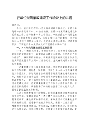 在单位党风廉政建设工作会议上的讲话同志们:今天,我们专门召开××党风廉政建设工作会议,主要任务是进一步传达学习××、××全会精神,总结××年党风廉政建设和反腐败工作,安排部署××年工作任务。市纪委派驻××纪检监察组×组长亲自参加会议指导,体现了对××工作的重视、支持以和对××党员干部的关心爱护。我们要认真领会精神,积极贯彻落实。下面我代表××党组向大家汇报两个方面的工作。一、××年党风廉政建设工作回顾××年,××党组在市委、市政府领导下,在市纪委派驻纪检监察组的监督指导下,以党的政治建设为统领,自觉践行两个维护,旗帜鲜明讲政治,认真落实党风廉政建设主体责任,把从严治党要求落实到××工作全过程,党风廉政建设工作得到扎实推进。一是廉政建设责任体系基本形成。坚持党风廉政建设与业务工作同部署、同检查、同考核。印发了《××年××党风廉政建设工作要点》,修订完善了各级领导干部党风廉政建设责任清单,党组书记与班子成员、分管领导与分管科室负责人签订了廉政责任书,一般干部对组织做出了廉政承诺。实施了对各部门年度绩效考核,把党风廉政建设工作作为主要考核内容。在基层组织换届中,调整配备了新的纪检监察工作机构及人员,强化了执纪监督工作机制。二是日常教育管理不断加强。以党风廉政建设宣教月活动和党纪党规、监察法学习十进十建活动为抓手,常态化开展法规教育、廉政教育和警示教育。采取党组书记讲廉政党课、开展廉政谈话、观看警示教育片等形式,进行以案五说,增强党员干部廉政意识、责任意识,强化敬畏之心。按月组织进行工作点评,强化日常监督。坚持管业务也管干部原则,督促各级领导干部切实履行一岗双责。落实运用四种形态,坚持抓早抓小,防微杜渐,党组书记对重要岗位工作人员进行了集体廉政谈话,领导班子成员先后对重要岗位人员××人次进行个别约谈提醒。三是执纪监督有效开展。建立健全重大决策前学习党纪党规制度,完善机关党委专职副书记、纪委书记列席党组会参与决策监督机制。坚持执行民主集中制、干部选拔任用制、三重一大决策制度、主要领导六个不直接分管和末尾表态制,规范权力运行。在与××合作中开展廉政承诺和执纪监督,构建清亲政商关系。在节假日之际,利用短信、微信群向全体干部发布廉政警示提醒,强化遵纪守法行为自觉。组织对××财务管理进行专项稽核,运用电子检查工具及××监管平台,开展了对全市××政策执行情况的检查和整改督办。对干部人事、公务用车、政府采购等重点领域以及党员干部参与脱贫攻坚、下沉社区服务等方面也开展了监督检查。认真督促整改审计反映问题,坚持举一反三,健全长效机制。对涉嫌违纪违法行为坚持零容忍,积极配合派驻纪检组开展案件查处。四是作风整治成效明显。从强化工作纪律、推动履职尽责入手,深入开展××质量提升年活动。党组书记公开进行作风建设承诺,强化作风建设政治责任。认真贯彻落实中央八项规定精神,持续整治四风。通过完善制度,倡导节约,加强监管,堵塞漏洞,全年三公经费较上年下降××%。进一步深化放管服改革,围绕群众合理诉求,积极推进职能调整、流程优化、手段创新,实现了××业务一站式办理,××业务一次办好。全年,群众诉求办结率和及时办结率均达到××%。成绩固然可喜,但存在的问题也不容忽视。主要是:全面从严治党的政治责任有待压紧压实;少数干部还不同程度存在纪律松懈,担当意识、服务意识不强,作风不实的问题;形式主义、官僚主义问题在某些干部身上还时有发生;廉政风险防控机制有待进一步加强;干部教育管理手段、方式还需要进一步完善和创新。对这些问题,我们要高度重视,认真加以克服。二、××年党风廉政建设要求及工作意见××年,是实施十四五规划目标的关键之年,××会和××会都提出,全面从严治党首先要从政治上看,不断提高政治判断力、政治领悟力、政治执行力。要坚定政治立场、政治定力,坚持把政治纪律政治规矩放在第一位;坚持严的主基调不动摇;坚持一体推进不敢腐、不能腐、不想腐。按照上级要求,结合××实际,我们提出了今年××工作定位和指导方针,即强化政治引领,深化作风建设,实现转型赶超,推动高质量发展。认真落实完成好今年的工作任务,需要凝聚广大干部职工的智慧和力量,营造勤政廉政、风清气正的政治生态,激励干部职工奋发有为,履职担当。今天召开的××年××第一个职工大会,是党风廉政建设工作会议,就是向广大干部职工传递一个信号,表明一种态度。即:从严管党治党不会停步,作风建设永远在路上;××党组坚定贯彻落实上级指示精神、狠抓落实的态度和决心不动摇。年初,××党组专题召开会议进行研究部署,制订印发了《××年党风廉政建设工作实施意见》,组织签订了党风廉政建设工作责任书,我们要按照相关工作部署认真抓好落实。为了做好今年党风廉政建设工作,我讲三点意见。(一)强化责任意识,压实廉政责任,构建人人有