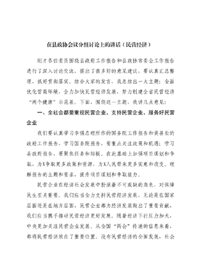 在县政协会议分组讨论上的讲话(民营经济)刚才各位委员围绕县政府工作报告和县政协常委会工作报告进行了深入讨论交流,提出了很多好的意见建议,要认真汇总整理,抓好贯彻落实。结合大家的发言,我总结出一大主题:全面优化营商环境,全力加快民营经济发展,努力创建全省民营经济两个健康示范县。下面,围绕这一主题,我讲几点意见:一、全社会都要重视民营企业、支持民营企业、服务好民营企业我们要认真学习李强总理所作的国务院工作报告和黄县长的政府工作报告,学习国务院报告,要重点关注政策和机遇;学习县政府报告,要聚焦任务和短板。在此基础上加强项目谋划和争取,为X争取更多政策和资源,为X人民带来更多实惠和改变。理解报告的主题和要求,提升项目谋划和争取能力。民营企业在经济社会发展中扮演着不可或缺的角色,对保障民生至关重要。我们应当全力支持民营经济发展,无论是在国家层面还是在地方层面,民营企业都为经济发展做出了重要贡献,我们应当携手推动民营经济更好发展。随着经济下行压力加大,中央更加关注民营企业发展。从全国两会传递的信息来看,都将民营经济放在了重要位置。没有民营经济的全面发展,社会缺乏活力,群众也难以充分就业。因此,民营经济的发展至关重要,全国人代会还提出了修订《民营经济促进法》的计划,将促进和服务民营经济发展提升至法律层面,这充分显示了中央对民营经济的高度重视。民营经济活跃是X最大的特色和亮点,群众富裕正源于民营经济的充分发展。目前,我县市场注册主体已突破10万户,占X市的10%以上,展现出较大规模。但是,存在规上企业、大型企业及优质企业较少的问题,个体工商户较多。我们必须加强对民营经济的培育,提高企业质量,壮大实力,培养更多的企业家。企业家创办的企业应具备一定规模、能力、层次和贡献,才能称得上真正的企业家。民营经济的巨大体量,是我们X县的独有特色,也是争创全省民营经济两个健康示范县的底气所在。我们必须努力争创成功,否则就是失职失责。县委、县政府已经作出要创建全省民营经济两个健康示范县这一重大决策,需要大家全力以赴,倾力推进。我们各级党委政府应高度重视、全力支持、优质服务民营企业。全社会也应该高度关注、支持和服务民营企业,无论其规模大小,都应成为我们的服务对象。个别部门和乡镇可能还未完全贯彻执行,导致民营企业尚未感受到应有的服务。我们已经做出规划,县科工局成立企业服务中心和万人助万企活动办公室文可居文库——海量学习资料,手机电脑均可下载www.wenkeju.com规上企业由县处级领导分包,规下企业由各乡镇、部门负责包联确保每家企业都有专人服务。二、坚持招商引资和育强本土企业两手发力,双轮驱动,全力推动民营经济又好又快发展我们要高度重视招商引资工作,同时,更加注重本土企业的健康发展。相较于招商引资,本土企业的成长更为切合实际,不仅是生产力,也是直接带来税收、就业和贡献的重要力量。招商引资难以在短期内见效,需要有前人栽树后人乘凉的耐心和责任心。因此,为现有企业提供良好的服务至关重要,及时有效的服务能带来直接的效益。县委、县政府已充分认识到这一点,因此要坚持招商引资和育强本土企业两手发力、双轮驱动,推动民营经济又好又快发展。各级党委政府、企业家、人大代表、政协委员应共同参与招商引资工作,特别是政协委员中的企业家和民营经济代表,都具有人脉资源、产业互联优势。这不仅是县委、县政府的任务要求也是企业发展壮大的必然需求。企业要想做大,必须进行合作。一个小企业如果不拓展合作,将一直处于小规模经营状态。企业要实现做大做强的目标,必须积极招商引资,开放合作,利用优质资源、技术和产品进行招商引资,吸引合作伙伴。每家企业都应认真分析自身优势技术和产品,开展外部合作,拓展产业链,文可居文库——海量学习资料,手机电脑均可下载www.wenkeju.com重点引进优质资源,招揽新的合作伙伴。未来的发展方向是构建完整的产业链,如上口公司采购优质养殖企业产品,一产与养稥殖业进行合作,二产深化加工生产高利润的休闲食品;想念食品公司也要改革创新,生产养生面、生鲜面条等产品。企业需要不断思考,不断拓展产业链,不能满足于现状。市委朱书记一直在倡导拉长、拉粗、拉宽产业链的发展思路。以上是对各位政协委员和企业家的共同期许,希望大家能够积极参与招商引资工作,推动企业做大做强,实现更好的发展。开展万人助万企活动,重点应放在智能化改造、技术改造、绿色改造和创新平台建设上,党员干部要以三改一平台为企业服务,企业要围绕三改一平台谋发展。当企业通过技改、智能化引进和强化绿色发展意识,结合专家团队和高校院士提供优质方案,企业将不断发展壮大,提升技术水平,反之企业将难以实现长足发展。举例来说,我县的黄酒企业设施陈旧,缺乏工业化和智能化生产;电商企业在瓶颈期应推