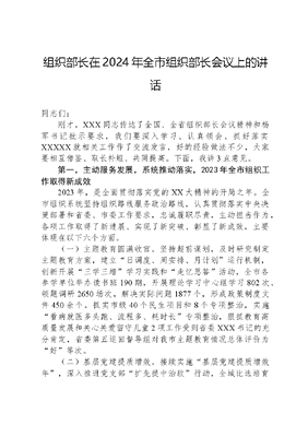 组织部长在2024年全市组织部长会议上的讲话同志们:刚才,XXX同志传达了全国、全省组织部长会议精神和杨军书记批示要求,我们要深入学习、认真领会、抓好落实XXXXX就相关工作作了交流发言,好的经验做法不少,大家要相互借鉴、取长补短、共同提高。下面,我讲3点意见。第一,主动服务发展,系统推动落实,2023年全市组织工作取得新成效2023年,是全面贯彻落实党的XX大精神的开局之年。全市组织系统坚持组织路线服务政治路线,认真贯彻落实中央决策部署和省委、市委工作要求,忠诚履职尽责,主动担当作为,各项工作取得了新进展、实现了新突破、彰显了新成效,主要体现在以下六个方面。(一)主题教育圆满收官。坚持超前谋划,及时研究制定主题教育方案,建立日调度、周安排、月计划运行机制,创新开展三学三增学习实践和走忆思答活动,全市各参学单位举办读书班190期,开展理论学习中心组学习802次、领题调研2650场次,解决实际问题1877个,形成政策制度文件450余个。抓实市级40个民生项目和8个专项整治,实施看病就医多头跑、流程多、耗时长专项整治,狠抓教育高质量发展和关心关爱留守儿童2项工作受到省委XXX书记的充分肯定,省委第五巡回督导组对我市主题教育情况总体评价为好等次。(二)基层党建提质增效。接续实施基层党建提质增效年,深入推进党支部扩先提中治软行动,全域比选培育创建基层党组织示范点118个。以风险隐患大走访、大排查、大清理行动为载体推进基层治理,全市刑事发案率、信访总量、命案数实现三下降。组织开展XXXX主题实践活动,有效激发了干部干事创业热情。认真落实省委XXX书记要求,高位推动党建引领乡村电商高质量发展,全市网络交易额、网络零售额分别同比增长15%和13.62%。投入4880万元实施村级集体经济项目56个,集体经济村均达27万元以上,100万元以上的达50个。(三)干部工作导向鲜明。坚持谁干事就支持谁、谁干成事就重用谁,着眼全市高质量跨越式发展全局,统筹用好各类干部资源,干部结构进一步优化。完成2轮一线蹲点调研,动态更新六个一批优秀干部库,对12名不适宜担任现职的市管干部予以调整。持续夯实年轻干部基础,选派141名干部到市内外挂职锻炼,全链条加强213名选调生管理,遴选13名年轻科级干部上下交流任职。全力做好巡视反馈涉组涉干问题整改,各级干部的纪律规矩意识和担当作为意识进一步提升。(四)人才引育成效明显。深入实施兴保英才计划,引进7名高层次专业人才,59人纳入7个本土人才培养专项。持续深化与73家大院大所大校大企合作,累计建成院士专家工作站68个。有3个全省首批人才工作示范项目落地XXX,开展第二届兴保人才奖评选和兴保惠才卡发放工作,新筹集人才公寓500余套。(五)公务员工作规范有序。稳步推进参照管理单位改革工作,顺利实施行政执法类公务员管理制度,全面规范县级以上机关事业单位借调工作,新录用公务员和选调生176名,2022年新录用公务员初任培训工作圆满完成。带薪年休假制度落实落地,坚持职级晋升向一线倾斜,选派30余名市管职级干部参与重大项目、驻企服务等中心工作,进一步激活了干部队伍活力。(六)自身建设有力有效。创新开展岗位大练兵、作风大转变、能力大提高、质效大提升、争创第一流活动,持续文可居文库——海量学习资料,手机电脑均可下载www.wenkeju.com深化组工干部能力素质提升行动,建立年安排、季调度、月报告、周跟踪工作机制,模范机关创建取得新成效,全市组工干部的政治素养、能力水平、作风效能得到了进一步锤炼和提高。同时,机构编制、老干部工作、党刊学用、信息宣传等取得了新成效。这些成绩的取得,根本在于有XXX新时代中国特色社会主义思想的科学指引,关键在于省委组织部的精心指导和市委的领导,重点在于全市各级组织部门和广大组工干部的辛勤努力。通过一年来的工作实践,我们对抓好组织工作有了更深的认识和体会。在肯定成绩的同时,我们也要清醒地认识到,在工作中我们仍然存在着一些不容忽视的突出问题。一是党建引领发展成效不明显。少数党组织书记围绕中心抓党建,抓好党建促发展的意识还不强,统筹各方力量资源向中心大局聚焦聚力不够,带头带领、服务保障高质量跨越式发展的办法和思路不多。二是党员干部教育培训不精准。理论培训、课题培训多,实战化、实践化、实操化培训少,培训的实用性与针对性不够强。干部教育培训的底线意识、红线意识、风险意识树得不牢XXX人民法院干警在XXX市委党校培训期间违规外出饮酒聚餐问题被省纪委监委通报,造成恶劣影响。三是激励干部担当作为不充分。职务与职级并行制度激励作用没有得到充分发挥,部分单位党员干部担当不够、松劲懈怠、安于现状、明哲保身等问题仍不同程度存在,带头攻坚克难、