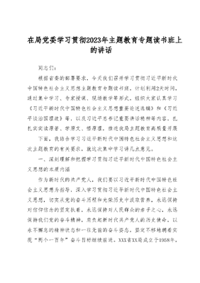 在局党委学习贯彻2023年主题教育专题读书班上的讲话同志们:根据省委的部署要求,今天我们召开学习贯彻习近平新时代中国特色社会主义思想主题教育专题读书班,计划利用2天时间,通过集中学习、专家授课、现场教学等形式,组织大家认真学习《习近平新时代中国特色社会主义思想重要论述选编》和《习近平谈治国理政》等,以及习近平总书记重要讲话精神等内容,扎扎实实读原著、学原文、悟原理,推进我局主题教育高质量开展下面,我结合学习习近平新时代中国特色社会主义思想和这次主题教育的有关要求,就这次集中学习讲几点意见。一、深刻理解和把握学习贯彻习近平新时代中国特色社会主义思想的本质内涵作为新时代的共产党人,我们要以习近平新时代中国特色社会主义思想为指导,深入学习贯彻习近平新时代中国特色社会主义思想,切实从党的奋斗历程和光荣历史中汲取营养,永远保持对信仰信念的坚定执着,永远保持对人民群众的赤子之心,永远保持我们党的奋斗精神,肩负起新时代共产党人的历史使命,以永不懈怠的精神状态和一往无前的奋斗姿态,坚定不移地朝着实现两个一百年奋斗目标继续前进。XXX省XX局成立于1958年,XXXXX人在省内开展XX工作的时间要更早一些。根据1952年全国XX工作计划会议的部署,原XX部、原重工业部、原燃料工业部的XX队伍陆续入赣。原XX部和重工业部联合组成XX勘探大队在XX找钨;原中南XX局组成XX铁矿勘探队在XX、XX地区找铁;原燃料工业部组成中南煤田XX勘探队在萍乡勘探煤矿。从此,XXXXX人就开始履行了为国家找矿的历史使命。新时代背景下,我们要深入学习习近平总书记视察时的重要讲话精神,学习习近平总书记关于绿色发展、生态文明建设的重要论述,学习习近平总书记关于XX行业的重要批示精神,从学习党的最新理论中明晰发展方向,从XX事业改革发展历史进程中追溯初心、坚守初心,积蓄推进转型发展的新能量。二、深刻认识开展学习研讨的重要意义(一)深刻认识高质量开展学习研讨是体现思想建党、理论强党基本原则的政治要求。思想建党、理论强党是我们党的优良传统和政治优势。理论创新每前进一步,理论武装就要跟进一步。我们党历来重视抓全党特别是领导干部的理论学习。按照中央部署,这次主题教育的根本任务,就是深入学习贯彻习近平新时代中国特色社会主义思想、锤炼忠诚干净担当的政治品格、团结带领全国各族人民为实现伟大梦想共同奋斗,并将理论学习有收获放在五个具体目标的首位位置。要实现这一根本任务和目标要求,就必须坚持思想建党、理论强党,开展高质量学习研讨,教育引导广大党员干部在原有学习的基础上取得新进步,加深对习近平新时代中国特色社会主义思想和党中央大政方针的理解,学深悟透、融会贯通,增强贯彻落实的自觉性和坚定性,提高运用党的创新理论指导实践、推动工作的能力,不断增强四个意识、坚定四个自信、做到两个维护,进一步筑牢信仰之基、补足精神之钙、把稳思想之舵,更加坚定自觉地为新时代党的历史使命努力奋斗。(二)深刻认识高质量开展学习研讨是搞好我局学习贯彻习近平新时代中国特色社会主义思想主题教育的重要基础。在党中央学习贯彻习近平新时代中国特色社会主义思想主题教育工作会议上,习近平总书记明确提出这次主题教育的总要求学思想、强党性、重实践、建新功。这一总要求,根据的是新时代党的建设任务、针对的是党内存在的突出问题、结合的是这次主题教育的特点,具有很强的现实针对性和战略指导性。要高质量开展好学习研讨,就必须牢牢把学思想、强党性重实践、建新功的总要求,把深入学习贯彻习近平新时代中国特色社会主义思想始终摆在首位,贯穿主题教育始终。要始终牢记我们XX人基因血脉中蕴藏的为国家找矿、为社会服务的学习贯彻习近平新时代中国特色社会主义思想,始终牢记我们身上肩负的推动全局XX经济转型发展、跨越发展的历史责任,进一步牢固树立新时代XX工作观,增强服务我省生态文明发展、中部地区崛起的自觉性和主动性。要重点对照习近平新时代中国特色社会主义思想,对照党章党规要求,对照中央、省委决策部署,对照省委巡视、政府审计的有关要求,对照新时代XX工作的新标准新要求,对照全局重点工作任务安排,找一找在树牢四个意识、坚定四个自信、做到两个维护方面的差距,找一找在知敬畏、存戒惧、守底线方面的差距,找一找在争项目、促发展、抓转型方面的差距,找一找在服务职工群众、落实民生行动方面的差距,一条一条列出来,由表及里进行深刻剖析反思,拿出破解难题的实招、硬招,动真碰硬抓整改,力戒形式主义、官僚主义,确保主题教育取得实实在在的成效。(三)深刻认识高质量开展学习研讨是推进XX事业转型发展的迫切需要。当前,我们面临的机遇和挑战前所未有。既面临着事业单位改革的困境,也肩负着服务社会、转型发展的重任。过去几十年中沉淀的许多深层次矛盾尚未彻底解决,在改