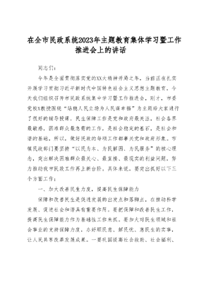 在全市民政系统2023年主题教育集体学习暨工作推进会上的讲话同志们:今年是全面贯彻落实党的XX大精神开局之年,当前正在扎实开展学习贯彻习近平新时代中国特色社会主义思想主题教育,今天我们组织召开市民政系统集中学习暨工作推进会,刚才,市委党校X教授围绕站稳人民立场为人民谋幸福为主题给大家进行了很好的辅导授课,民生保障工作是党和政府最关注,社会各界最敏感,困难群众最急需的工作,是社会稳定的基石,是社会和谐的基础,所以,做好民政的每项工作都事关党和政府形象。市镇民政部门要坚持以民为本、为民解困、为民服务的核心理念,突出解决困难群众最关心、最直接、最现实的利益问题,努力推动我市民政工作再上新台阶。具体来说,要突出抓好以下三个方面工作:一、加大改善民生力度,提高民生保障能力保障和改善民生是促进发展的出发点和落脚点,在推动科学发展、促进社会和谐具有重要作用。要把保障和改善民生工作,提高民生保障能力作为基础性工作来抓。要加大对民生领域和社会事业的支持保障力度,办好顺民意、解民忧、惠民生的实事,让人民共享改革发展成果。一要巩固提高社会救助、社会福利、双拥优抚安置三大保障体系的保障能力和水平。要继续做好最低生活保障工作,将农村和社区年人均收入低于1500元的困难家庭纳入低保范围。努力抓好低保救助与五保供养、灾民救助、流浪乞讨人员救助以及医疗、住房、教育等专项救助的相互配套,不断完善社会保障体系,努力使困难群体、优抚群体和孤老、孤残孤儿等特殊群体基本生活得到基本保障,积极开展双拥活动,增进军民团结,密切军民关系。进一步完善优抚对象一站式服务模式,继续做好优抚对象相关服务工作。二要加强自然灾害应急救援能力建设。全面启动和推进城乡综合减灾工作,今年修订完善救灾救助应急预案,推动全市救灾减灾工作的发展;要健全灾害救助制度,善安排受灾群众生活,完善灾害应急救助体系;强化抗灾、救灾、减灾综合协调机制,变被动救灾为主动防灾减灾;要针对可能发生的灾害,未雨绸缪加大救灾工作力度,做好救灾物资储备工作。要为灾民提供基本生活保障,要积极争取资金帮助灾民重建家园。三要认真抓好信访工作,尤其是要高度重视复员退伍军人上访问题,做好复员退伍军人的思想疏导工作,把问题解决在基层,切实维护社会稳定。二、加强基层政权和社区建设,提高社会管理能力社区是社会建设的重要载体,社会组织是社会建设的重要力量,社会工作是和谐社会建设的工程师。一是继续推进六好平安和谐社区建设,大力推进农村社区示范点工作。去年我市X社区、X社区被评为省六好平安和谐社区。这是一个良好的开端,我们要更加扎实推进村(居)务公开和民主管理规范化,探索发挥基层群众性自治组织在建设社会主义民主基础作用的新手段,建立行政管理和自治管理相配合的良性互动社区管理新体制为全面开展我市农村社区建设奠定坚实的工作基础。二是注重加强社会组织能力建设。要指导民间组织加强自身建设,引导民间组织依法开展活动,更好地发挥服务社会的功能。三是推动慈善事业快速发展。慈善事业的发展水平是社会文明进步的重要标志发展慈善事业是构建和谐社会的必然要求,是社会保障体系的重要补充。要努力营造人人行善的良好社会氛围。此外,要大力推动婚姻登记规范化建设,提高婚姻登记服务水平。要继续深化殡葬改革,规范殡仪馆和经营性公墓的经营管理,加大乱葬乱埋问题的查处力度,巩固火化率,确保火化率不掉下来,新坟不冒出来。要继续加强老龄工作,努力营造全市敬老、爱老、助老的社会氛围。深入开展老年人文体活动,丰富老年人文化生活,推动老龄工作和老龄事业的全面发展。要加强行政区划和地名工作,提高地名信息服务水平,创建平安边界同时,要进一步推进我市民政信息化建设,提高民政工作的现代化管理水平和服务水平。三、完善工作机制,提高民政事业发展的活力要转变观念,敢于创新发展,从法制高度解决民政工作的保障机制问题,要加强执法工作,在提高执法能力、加强执法管理强化执法监督上下功夫,提高民政执法规范化水平和执法公信力要凝聚力量,共谋发展。民政工作点多、线长、面广,涉及到社会的方方面面,服务对象也涉及到社会各阶层。要广泛动员社会各方面力量重视、关心、支持、参与民政工作,引导和鼓励社会力量为困难群众献爱心、解难题。要加强上下衔接、横向沟通以及部门协作,加强与上级部门联系,及时了解有关政策信息,争取更大支持。要与相关市直部门密切配合、通力协作,主动衔接互通信息,共同做好对上争取支持、对下指导帮助的工作。要加强民政队伍建设。做好各项民政工作,队伍建设是关键是保障。要切实加强自身建设,培养和造就一支政治坚定、业务熟练、作风优良的高素质民政工作队伍。要切实改进和加强作风建设,坚持求真务实,深入实际、深入基层、深入群众,把与群众切身利益紧密相连的工作做深、做细、做实。同志们,民政工作任重道远。希望