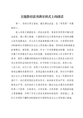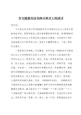 主题教育读书班开班式上的讲话第一,坚持以学为基础,强化理论武装,在学思想中激励信心。深入开展主题教育是一种政治自觉,唯有在学思想中强化理论武装、凝心聚力铸魂,才能保持对远大理想和奋斗目标的清醒认知和执着追求,在大是大非面前把握正确方向。大家要坚持用xXXX新时代中国特色社会主义思想凝心铸魂,将XXX在各领域提出的新理念、新思想、新战略,作为一个有机整体来把握,把其放在整个科学体系中来认识和把握,放到党和国家工作全局中学习思考。要深入理解xXXX新时代中国特色社会主义思想是为新时代伟大变革所证明的科学理论,科学回答了中国之问、世界之问、人民之问、时代之问,实现了马克思主义中国化时代化新的飞跃放射出耀眼的真理光芒,展现出强大的真理力量。新时代中国特色社会主义思想是推进自我革命的科学指引,在这一思想的科学指引下,我们党理想信念更加坚定、组织体系更加严密、纪律规矩更加严明,成功找到了自我革命这一跳出治乱兴衰历史周期率的第二个答案,自我净化、自我完善、自我革新、自我提高的能力显著增强,开辟了百年大党自我革命的新境界。新征程上,我们只有坚持不懈用xXXX新时代中国特色社会主义思想凝心铸魂,才能准确把握中国式现代化的根本性质、牢牢锚定中国式现代化的奋斗目标、充分激发推进中国式现代化的强劲动力、广泛凝聚推进中国式现代化的磅礴力量,在中国式现代化道路上实现中华民族伟大复兴;才能保证我们党在世界形势深刻变化的历史进程中始终走在时代前列,在应对国内外各种风险和考验的历史进程中始终成为全国人民的主心骨,在坚持和发展中国特色社会主义的历史进程中始终成为坚强领导核心。第二,坚持以用为目的,牢记职责使命,在强党性中保持初心。强化党性教育是提高党员干部素质、加强党的长期执政能力建设和先进性纯洁性建设,保持战斗力生命力的根本要求和重要途径。一要增强党性教育。自觉用xXXX新时代中国特色社会主义思想武装头脑,坚定理想信念和马克思主义执政党意识,增强组织性纪律性,培育党的优良传统和作风。要锤炼对党绝对忠诚的政治品质,始终以党的旗帜为旗帜、以党的方向为方向、以党的意志为意志,深刻领悟两个确立的决定性意义,增强四个意识、坚定四个自信、做到两个维护,自觉在思想上政治上行动上同以xxx同志为核心的党中央保持高度一致。二要坚定理想信念。理想信念是共产党人的精神支柱和政治灵魂,是共产党人精神上的钙,始终坚定理想信念,要求我们把学懂弄通做实xXXX新时代中国特色社会主义思想作为首要政治任务,在深化学习中坚定理想信念、提升党性修养。三要保持清正廉洁。清正廉洁是共产党人的政治本色,永葆清正廉洁政治本色是加强党性修养的重要内容。要通过主题教育,引导党员干部正确处理公和私、义和利、是和非等关系,一心为公、坦荡做人、谨慎用权,知敬畏、存戒惧、守底线,坚决守住做人、处事、用权、交友的底线,不断去杂质、除病毒、防污染。第三,坚持以行为抓手,精进业务能力,在重实践中坚定决心。深入开展主题教育读书班,不仅要学,还要会用。要注重坚持统筹兼顾,把理论学习与调查研究、推动发展、检视整改、建章立制等贯通起来,同大兴调查研究结合起来,加强党的创新理论武装,解决群众急难愁盼问题,着力推动高质量发展,确保主题教育取得实效。一要端正调查研究的态度。充分尊重基层广大人民群众的主体地位和首创精神,特别是在基层治理领域,既把群众作为调研的主要对象,也要把群众作为自己的老师,深入基层一线,虚心听取他们的意见和建议,发现和总结基层的实践经验,从基层的富矿中汲取丰富的营养,从群众的创造性实践中找到解决问题的思路和办法。二要掌握正确的调研方法,通过知识与能力的储备,通过实践的锻炼和积累,为做好调研工作强力赋能。今年xxx总理在两会闭幕后的记者见面会提到:坐在办公室碰到的都是问题,下去调研看到的全是办法,高手在民间。要真正通过调研听到真话、看到实情,把调研工作做到实处。要强化问题导向,在真研究问题,研究真问题上下功夫用气力,找到准星、对准靶心,把影响改革发展稳定的重难点问题、制约发展的瓶颈问题、群众反映强烈的现实问题等找准找实,并拿出真招实策。三要实现调研成果的转化。做好调研成果转化运用是整个调研工作的初衷与根本,对调查发现的问题即知即改、立行立改,以钉钉子精神打通堵点、破解痛点、攻克难点,做到件件有着落、事事有回音,决不能将调研成果束之高阁。要保持发现问题—解决解决—发掘新问题的良性循环,推动成功做法经验化、分散探索系统化、有效措施制度化,让调研成果影响范围更加深广,为推动xxx县各项事业高质量发展注入源头活水。第四,坚持以绩为根本,笃行担当意志,在建新功中修炼恒心。深入开展主题教育,抓的是持久,见的是长效。县处级以上领导干部要以身作则,发挥好关键