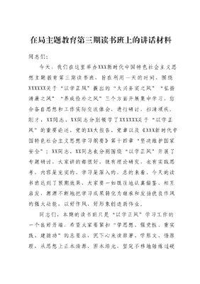 在局主题教育第三期读书班上的讲话材料同志们:今天,我们在这里举办XXX新时代中国特色社会主义思想主题教育第三期读书班,旨在利用一天的时间,围绕XXXXXX关于以学正风提出的大兴务实之风弘扬清廉之风养成俭朴之风三个方面开展集中学习,结合各自思想和工作实际交流体会,进行研讨,扫清顽疾。刚才,XX同志、XX同志分别领学了XXXXXX关于以学正风的重要论述、党的XX大报告、党章以及《XXX新时代中国特色社会主义思想学习纲要》第十四章坚决维护国家安全;XX同志、XX同志也分别围绕以学正风开展了专题研讨,大家讲的都很好,既有理论研究,也有实践思考,内容是充实的、学习是深入的,总的来看,今天的读书班达到了预期效果,大家要一如既往地认真借鉴、相互启发,源源不断地把学习成果转化为继承和发扬优良作风的强大动能,以好作风、好形象创造新伟业。同志们,本期的读书班只是以学正风学习工作的一个良好开端,希望大家要紧扣学思想、强党性、重实践、建新功的总要求,沉下心来读原著、学原文、悟原理,从思想上正本清源、固本培元,坚定不移地锤炼过硬作风,以钉钉子精神不断把作风建设引向深入。下面,我再强调四点意见:一要掀起勤则可达,道阻且长学习之风,巩信仰坚定之攻坚勇气。党的作风是党的形象,是观察党群干群关系、人心向背的晴雨表。XXXXXX强调,我们的干部要上进,我们的党要上进,我们的国家要上进,我们的民族要上进,就必须大兴学习之风,坚持做到学思用贯通知信行统一。以学正风,就是要教育引导广大党员干部认真学习XXXXXX关于党章的一系列重要论述,做到经常对照党章规范自己的言行。作为一名党员干部,我们要做到克服精神懈怠,纾解本领恐慌等问题,途径唯有不断学习深化学习、改造学习。新的时代征程上,要注重加强政治学习,把学习贯彻XXX新时代中国特色社会主义思想不断引向深入,从中获取不懈奋斗的源泉动力、增强学思践悟的政治智慧、筑牢拒腐防变的堤坝防线,进一步优化个人素质、增强斗争本领,确保在任何情况下都能坚定的做到政治信仰不变、政治立场不移、政治方向不偏。二要大兴不驰空想,不骛虚声务实之风,汲干事创业之昂扬锐气。执政之道在于安民,安民之道在于察其疾苦。新形势下存在众多无迹可寻的新情况和新挑战,需要广大干部抓实抓牢调查研究这个传家宝,做好精准、闭环、高质量调研,摸准人民群众聊的家长里短,找清人民群众想的急难愁盼,答好人民群众出的新题目。新征程赋予新使命,新使命呼唤新作为党的XX大报告从党和国家事业发展战略全局出发,对推进国家XX作出了战略部署,为推进XX改革发展指明了前进的方向,提供了根本的遵循。我们要全面聚焦XX、XX、XX领域最突出最迫切的现实问题,围绕前期已确定的X个课题开展深入调研,真抓实干、务求实效,切实把调研成果转化为解决问题、改进工作的实际举措,以时时放心不下的责任感、积极担当作为的精气神,为党和人民履好职、尽好责,以新气象新作为推动高质量发展取得新成效。三要弘扬一身正气,两袖清风清廉之风,携清正廉洁之无私底气。廉者,政之本也。党风问题关系党的生死存亡,反腐败是最彻底的自我革命。为政清廉民信之,秉公用权得人心,倘若贪墨分毫,没有树立正确权力观,人民的立场就站不稳当。大家可以看到,新时代十年是党的历史上制度成果最丰硕、制度笼子最严密、制度执行最严格的时期,各项纪律规矩真正成为带电的高压线。作为一名党员干部特别是领导干部,我们要对标党风要求找差距、对表党性要求查根源、对照党纪要求明举措,紧密结合新形势新任务新职责,把学、查、改有机贯通起来,全面查找自身不足和工作偏差,守住政治关、权力关、交往关、生活关、亲情关,勤掸思想尘、多思贪欲害、常破心中贼,时刻警惕来自各方面的围猎,防止落入别人设置的陷阱,做一个一心为公、一身正气、一尘不染的共产党人。四要养成克勤于邦,克俭于家俭朴之风,秉艰苦奋斗之青衿志气。足国之道,节用裕民,而善臧其余。俭朴,始终是居安思危、赓续艰苦奋斗精神的外在表现与着力点。吃苦在前,享受在后是党章规定的党员义务,尚俭戒奢是《中国共产党廉洁自律准则》提出的明确要求。在主题教育中抓实以学正风、养成俭朴之风,必须坚持目标导向和问题导向相结合、学查改相贯通把生活作风问题作为检视整改的重要内容,对作风之弊、行为之垢来一次大排查、大检修、大扫除,切实解决人民群众反映强烈的突出问题。作为一名党员干部,要坚持以检身若不及的自觉要求自己、反思自己,主动查找是否存在生活奢靡、贪图享乐、追求低级趣味等问题,形成克己奉公、戒奢尚俭、激浊扬清的理性自觉,确保在生活作风上清正廉洁、一身正气。以学正风,贵在坚持不懈,成于久久为功。让我们把思想和行动统一到XXXX