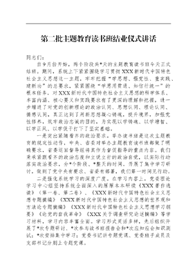 第二批主题教育读书班结业仪式讲话同志们:自9月份开始,两个阶段共*天的主题教育读书班今天正式结班。期间,系统上下紧紧围绕学习贯彻XXX新时代中国特色社会主义思想这一主题,牢牢把握学思想、强党性、重实践、建新功的总要求,紧紧围绕学思用贯通、知信行统一的根本任务,对XXX新时代中国特色社会主义思想的科学体系、丰富内涵、核心要义和实践要求有了更深的理解和把握,进一步增进了对党的创新理论的政治认同、思想认同、理论认同、情感认同,真正达到了用新思想凝心铸魂,提升境界,加强党性修养,筑牢政治忠诚的目的,为实现以学铸魂、以学增智、以学正风、以学促干打下了坚实基础。一是突出紧随看齐的政治要求。举办读书班是这次主题教育的规定性动作,中央、省委对举办主题教育读书班都做了明确要求,省委巡回督导组将其作为督促指导的重点内容。我们秉承紧跟看齐的政治态度和立说立行的政治自觉,以实际行动落实政治要求,分*个阶段、*整天的时间,开展了集中学习研讨,做到了党中央有要求、省委有部署,我们第一时间见行动。二是强化系统学习的深度广度。在学习内容上,党委理论学习中心组坚持系统全面深入的原原本本研读《XXX著作选读》(第一卷、第二卷)、《XXX新时代中国特色社会主义思想专题摘编》《XXX新时代中国特色社会主义思想的世界观和方法论专题摘编》《XXX新时代中国特色社会主义思想学习纲要》《论党的自我革命》《XXX关于调查研究论述摘编》等学习材料,学习内容丰富全面。学习形式灵活多样,先后组织开展了*次专题研讨、*次参与读书班报告会和*次应知应会知识测试;*次安排集中学习;党委书记讲专题党课、党委班子成员及支部书记分别上专题党课。三是体现求真务实的优良作风。同志们都非常重视和珍惜这次读书班,党委理论学习中心组以身作则,率先垂范,在工作非常繁忙的情况下,始终以饱满的政治热情和良好的精神状态,积极克服时间紧、任务重的工学矛盾,认真学习体悟、深入交流研讨,沉下心来认真学习、深入思考,形成了良好的学习氛围,保障了学习时间和学习效果,展现了求真务实的优良学风。四是彰显学用结合的高度自觉。通过举办读书班,达到了学有所获、学以致用的效果。补足了精神之钙,对XXX新时代中国特色社会主义思想有了更加深刻的认识。提高了政治站位,对坚定理想信念、坚持人民立场等进行了深查细照,进一步坚定了对马克思主义的信仰,进一步加深了对两个确立的决定性意义的理解,核心意识更强了。强化了责任担当,直面高质量发展中的短板和弱项,坚持问题导向,深入调查研究,推动建章立制,体现出了责任和担当,展现出了决心和信心。这次主题教育不划阶段、不分环节,读书班只是一个良好的开端,读书班虽告一段落,但是学习教育永运在路上。下一步,系统上下将继续围绕教育和实践,找准结合点,狠抓关键点,全力推动事业高质量发展蹄疾步稳。一是要从XXX新时代中国特色社会主义思想中找遵循,在学思践悟中感悟真理力量。XXX新时代中国特色社会主义思想的世界观、方法论,蕴含着人民至上的政治立场,蕴含着从中国基本国情出发的重大原则,蕴含着自我革命的强烈政治担当,体现了价值取向和发展动力的辩证统一,体现了尊重实际和发扬历史主动的辩证统一,体现了守正固本和创新发展的辩证统一。系统上下务必坚持常学常新、久久为功,全面掌握XXX新时代中国特色社会主义思想的世界观、方法论和贯穿其中的立场观点方法,深刻理解认识六个必须坚持彰显的科学性和真理性、人民性和实践性、开放性和时代性,做到知其然更知其所以然,知其言更知其义、知其道更行其道,力求以学懂促深化、以弄通促内化、以做实促转化,以强化理论学习指导发展实践,以深化调查研究推动解决发展难题,用主题教育的真理之光照亮事业发展的奋进之路。二是要从XXX新时代中国特色社会主义思想中找方向,在知行合一中做到融会贯通。学而不思则罔。思考是学习的灵魂,是理论联系实际的桥梁纽带。必须要把学习成果转化为对奋斗目标的执着追求、对本职工作的不懈进取、对高尚情操的笃定坚持、对艰难险阻的勇于担当,全力以赴推动XXX新时代中国特色社会主义思想和党的XX大精神落地生根、开花结果。要将学习成效体现到以学铸魂上,聚焦解决思想根子问题,坚持不懈用党的创新理论成果凝心铸魂,不断筑牢信仰之基、补足精神之钙、把稳思想之舵,提高政治判断力、政治领悟力、政治执行力,衷心拥护两个确立,忠诚践行两个维护,确保在政治立场、政治方向、政治原则、政治道路上同以XXX同志为核心的党中央保持高度一致。要将学习成效体现到以学增智上,从党的科学理论中悟规律、明方向、学方法、增智慧,把看家本领、兴党本领、强国本领学到手,聚焦队伍建设任重道远、高水平安全筚路蓝缕、高质量发展刻不容缓、基本建设蓄势待发、民生保障持续攀升等当前工作中存在的突出矛盾,推动党员干部提高知重