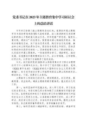 党委书记在2023年主题教育集中学习研讨会上的总结讲话今年9月份第二批主题教育启动以来,党委把开展主题教育作为推动贯彻党的XX大战略部署、深入推进新时代党的建设新的伟大工程的重大政治任务,牢牢把握学思想、强党性、重实践、建新功的总要求,紧紧锚定凝心铸魂筑牢根本、锤炼品格强化忠诚、实干担当促进发展、践行宗旨为民造福、廉洁奉公树立新风的具体目标,紧密结合党委工作实际,坚持目标导向和问题导向相统一,坚持党组带头和上下联动相结合,扎实组织开展主题教育,一体推进理论学习、调查研究、推动发展、检视整改和教育整顿各项工作,在以学铸魂、以学增智、以学正风、以学促干方面取得了较好成效。今天,我们组织党委2023年主题教育集中学习研讨会暨理论学习中心组第9次会议,集中学习了党的XX大报告、党章、《XXX著作选读》《XXX新时代中国特色社会主义思想专题摘编》,班子成员结合分管工作就贯彻落实主题主线相继发言,畅谈体会。下面,我再讲几点意见:主题教育工作时间已经过半,要按照要求,抓住进度、提高质量、突出效果,确保主题教育高质量推进。重点提示几项工作。第一,始终坚持牢牢把握主线,深入学习思考。学习是我们的首要任务,市委近期已经全面加强了主题教育巡回指导督导工作,各级党组织和党员干部要以学习贯彻XXX新时代中国特色社会主义思想为主线,认真收集归档学习资料、深入学习研讨、规范学习笔记记录、亲自拟草发言材料等,围绕主线深学细悟,真正做到学懂弄通做实、真学真懂真信真用。第二,始终坚持深入调查研究,找准问题症结。调查研究是抓好主题教育的前提和基础。要对照学习贯彻XXX新时代中国特色社会主义思想主题教育要求,对照学习贯彻XXX新时代中国特色社会主义思想要求,结合各自调研主题,真正扑下身子,深入基层一线,把问题找准找实,认真解剖麻雀,拿出破解实招硬招,抓好成果交流运用。第三,始终坚持深刻对照检查,剖析存在问题。近期我们将开展读书班、第10次理论学习中心组专题研讨会等规定动作,各级党委(党组)要按照党委主题教育办工作提示要求,深刻对照六个方面,认真查找问题,逐一剖析根源,抓好各项准备落实。第四,始终坚持回应群众期待,办好群众实事。开展好主题教育的重要任务中,关键的一个就是注重解决群众最急最忧最盼的紧迫问题。要坚持以人民为中心的发展思想,集中力量办好群众烦心事操心事揪心事,一件件办实,不能滥竽充数。第五,始终坚持突出质量标准,抓好专项整治。紧盯专项整治任务,严格整治标准,找准找全问题,完善整治台账,逐条逐项推进落实销号。对于能够马上解决的问题,要立行立改、即知即改;对一时解决不了的,要盯住不放,持续整治。最后,按照近期主题教育的重点工作,我再强调一下,各级党员干部要切实扛起主题教育主体责任,坚持将理论学习,调查研究,推动发展,检视整改贯穿主题教育全过程,确保学习贯彻XXX新时代中国特色社会主义思想主题教育取得实效。要加强统筹调度,定期研究部署,重点抓好专项整治工作,本着问题去,盯着问题改,切实做到真改实改彻底改。要加强上下联动,从源头解决问题,很多查摆出来的问题其实是病症在下面、病根在上面,单靠我们部门是难以解决的,要建立完善上下联动机制,把主题教育与整改回头看联动整改。要紧盯夺取乡村振兴,严肃驻村工作纪律,强化作风建设,抓紧抓实人居环境整治等工作,确保抓在日常、抓在经常。要加强督导检查,充分发挥党委巡回指导组督导作用,有针对性进行分类指导,精准指导;要及时下发工作提示单,抓好各项工作统筹推进。总之,我们要以学习贯彻XXX新时代中国特色社会主义思想为主线,严格对标对表中央和省委、市委要求部署,高标准、高质量抓好主题教育各项工作,持续把各级党组织和党员干部在主题教育中激发出来的热情,转化为推动经济高质量发展的强大动力。我的发言完毕,谢谢。
