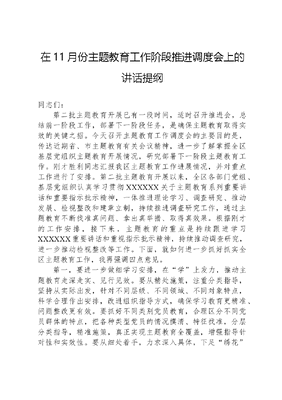 在11月份主题教育工作阶段推进调度会上的讲话提纲同志们:第二批主题教育开展已有一段时间,适时召开推进会,总结前一阶段工作,部署下一阶段任务,是确保主题教育取得实效的关键之招。今天召开主题教育工作调度会的主要目的是,传达近期省、市主题教育有关会议精神,进一步了解掌握全区基层党组织主题教育开展情况,研究部署下一阶段主题教育工作。刚才胜利同志汇报我区主题教育工作进展情况,并对重点工作进行了安排。第二批主题教育开展以来,全区各部门党组、基层党组织认真学习贯彻XXXXXX关于主题教育系列重要讲话和重要指示批示精神,一体推进理论学习、调查研究、推动发展、检视整改和建章立制,持续推进调查研究工作,通过主题教育不断找准真问题、拿出真举措、取得真效果。根据刚才的工作安排,接下来,主题教育的重点是持续跟进学习XXXXXX重要讲话和重视指示批示精神,持续推动调查研究,进一步推动检视整改等工作。下面,就如何进一步抓好抓实全区主题教育工作,我再强调四点意见。第一,要进一步做细学习安排,在学上发力,推动主题教育走深走实、见行见效。要从精处施策,注重分类指导,坚持从实际出发,针对不同层级、不同领域、不同对象特点,科学合理作出安排,改进组织指导方式,确保学习教育更精准、问题整改更有效。要抓好不同类别党员教育,合理区分不同党员群体的特点,把各种类型党员的情况摸清、特征找准,分层分类指导,精准施策,真正实现主题教育全覆盖,增强指导针对性和实效性。要从细处着手,力求深入具体,下足绣花功夫,合理划分理论学习、调查研究、推动发展、检视整改不同重点措施的具体内容,找准着力点和切入点,沉下心去,抓细节抓具体抓深入,切实做到有机融合、一体推进,不知不扣把规定动作和自选动作落实到位。注重过程纠偏,针对主题教育中暴漏出的问题,既要及时纠正偏向,避免政治大方向上南辕北辙,又要尽快纠正偏差,找准问题根源、彻底整改解决。要从实处推进,力求落实有效。坚持思想上不放松、标准上不下降、力度上不减弱,充分运用第一批主题教育的好经验好做法,慎终如始把各项任务落实到位,切实把学习成果转化为推动高质量发展的强大动力。力戒形式主义,坚决防止理论学习浮光掠影、调查研究走马观花、推动发展拖泥带水、检视整改浅尝辄止,确保主题教育取得实实在在成效。坚持开门抓主题教育,善于倾听群众意见、自觉接受群众监督,从群众期盼的事情做起、最不满意的地方改起,着力解决群众的急难愁盼,以群众笑脸来检验主题教育成效。第二,要进一步做深调查研究,在做上发力,推进主题教育走深走实、见行见效。作为我们党的传家宝,调查研究关乎信息和决策、联结党心与民心。调查研究成果几何,同高质量发展成色足不足、动力强不强紧密相连。在全党开展主题教育,深入调查研究,更是回答中国之问、世界之问、人民之问、时代之问的有效途径。做深调查研究,要在切口上再精准。坚持问题导向与目标导向相统一,勤修见微知著的眼力,苦练解剖麻雀的功夫。聚焦主责主业调研,多往项目一线去、多到背街小巷看、多与基层群众聊、多朝田间地头跑,在贴地行走中摸清制约高质量发展的难点堵点焦点,列出问题清单,拿出对策性思考建议。在方法上再优化。方法对头,能在有限时间内掌握更多第一手鲜活的资料,发现更多真民意、真问题,反之方法不当事倍而功半。党员干部理当紧盯调查研究事前、事中、事后三个环节,用好用活事关全局的战略性调研、破解复杂难题的对策性调研、新时代新情况的前瞻性调研、重大工作项目的跟踪性调研、典型案例的解剖式调研、推动落实的督查式调研等调研方法论。在运用上再发力。调查研究的指向是实践,见身影更要见行动,听民情更要有回声。必须把发现问题和解决问题有机结合起来,由表及里、由此及彼,推动解决一批发展所需、改革所急、基层所盼、民心所向的问题。同时,建立调研成果转化运用清单,对经过充分研究、比较成熟的调研意见,要及时转化为推动工作的思路办法和政策举措,进而在实践与认识的逐步深化中助力发展。在调研结果上要体现效的要求,在了解到问题之后,认真谋划解决办法和举措,以维护群众利益和社会经济发展大局需要为导向,制定出科学合理的政策,真正实现出实招、谋实效。第三,要进一步做实整治整改,在检上发力,推进主题教育走深走实、见行见效。敢于直面问题、认真解决问题,是我们党的显著特点和优势,也是抓实抓好学习贯彻XXX新时代中国特色社会主义思想主题教育的题中应有之义。我们必须奔着问题去、对着问题改,边学习、边对照、边检视、边整改,把问题整改贯穿主题教育全过程,让人民群众切实感受到主题教育带来的明显变化、实际成效。这次主题教育把抓好检视整改作为一项重点措施,再次彰显了强烈的问题意识和鲜明的问题导向。要切实提高政治站位,实实在在检视整改突出问题,努