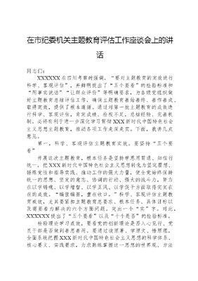 在市纪委机关主题教育评估工作座谈会上的讲话同志们:XXXXXX在四川考察时强调,要对主题教育的实效进行科学、客观评估,并鲜明提出了五个要看的检验标准和用事实说话让群众评价等明确要求,为各级党组织做好主题教育总结评估工作,确保主题教育善始善终、善作善成、取得实效,提供了根本遵循。通过对第一批主题教育的成效进行科学、客观评估,肯定成绩、检视不足,总结经验、完善机制,必将有利于进一步深化学习贯彻XXX新时代中国特色社会主义思想主题教育,推动各项工作走深走实。下面,我讲几点意见。第一,科学、客观评估主题教育实效,要坚持五个要看开展这次主题教育,根本任务是坚持学思用贯通、知信行统一,把XXX新时代中国特色社会主义思想转化为坚定理想、锤炼党性和指导实践、推动工作的强大力量,使全党始终保持统一的思想、坚定的意志、协调的行动、强大的战斗力,努力在以学铸魂、以学增智、以学正风、以学促干方面取得实实在在的成效。编筐编篓,重在收口。科学、客观评估主题教育成效,尤其要紧扣主题教育总要求、根本任务、具体目标以及需要着力解决的六个方面问题,突出一个实字。对此,XXXXXX提出了五个要看以及十个是否的检验标准。检验理论学习成效,要看党的创新理论是否入心见行、党员干部是否做到善思善用。要通过读原著、学原文、悟原理,全面系统把握XXX新时代中国特色社会主义思想的科学体系、核心要义、实践要求,力求熟练掌握这一思想的世界观、方法论,坚持好、运用好贯穿其中的立场观点方法,真正把马克思主义看家本领学到手,不断增进对党的创新理论的政治认同、思想认同、理论认同、情感认同。要检验在理论学习过程中,是否做到了多思多想、学深悟透,把党的创新理论内化于心、外化于行;是否切实解决了学风不纯不正、学习走形式装样子、不走心不深入、一知半解、浅尝辄止,知其然不知其所以然,学用脱节、学归学做归做等问题,做到了真学真懂真信真用;是否坚持了知行合一、学用结合,把理论学习的成果转化成了干事创业的实际本领,用硬招、实招破解了改革发展的堵点难点、打开了工作新局面。检验调查研究成效,要看是否摸清社情民意、是否解决实际问题。调查研究是我们党的传家宝,是做好各项工作的基本功。深入调查研究,把脉问诊、解剖麻雀,进行问题大梳理、难题大排查,进而运用党的创新理论研究新情况、解决新问题,是这次主题教育的一个重要特色。党中央关于在全党大兴调查研究的工作方案,聚焦全面贯彻落实党的XX大精神、推动高质量发展,明确提出了6个大项12个方面调研内容。要检验党员干部有没有真正扑下身子、沉到一线,采取四不两直方式,按照深、实、细、准、效要求深入调研,是否敢于正视问题、善于发现问题,既看高楼大厦又看背阴胡同,真正把社情民意摸清了、把急难愁盼问题找准了、把整治整改对策提实了,实实在在推动解决了一批发展所需、改革所急、基层所盼、民心所向的问题。检验推动发展成效,要看高质量发展是否有新突破、人民生活品质是否有新提升。高质量发展是全面建设社会主义现代化国家的首要任务。要考察评估各级党组织和领导干部是否根据自身职责,着力做好了扩大国内需求、深化供给侧结构性改革,加快建设现代化产业体系,全面推进乡村振兴,实施科教兴国战略、人才强国战略、创新驱动发展战略,在发展中保障和改善民生,推动绿色发展、推进美丽中国建设,推进全面依法治国,建设社会主义文化强国,维护社会稳定等方面工作,推动高质量发展实现了新突破;是否始终牢记党的初心使命,坚持立党为公、执政为民,实现好、维护好、发展好最广大人民根本利益,在更高水平上实现了幼有所育、学有所教、劳有所得、病有所医、老有所养、住有所居、弱有所扶,增进了民生福祉,推动人民生活水平全方位改善、生活品质全方位提升,在实现全体人民共同富裕上取得了新进展。检验检视整改成效,要看问题症结是否找准、整改整治是否到位。这次主题教育始终坚持问题导向,要求各级党组织和领导干部奔着问题去、带着问题学、对着问题改,解决真问题、真解决问题。要考察领导班子和个人是否认真查找了、找准了在贯彻党中央决策部署,在贯彻新发展理念、构建新发展格局、推动高质量发展,在履职尽责等方面存在的突出问题;是否系统梳理了调查研究发现的问题、推动发展遇到的问题、群众反映强烈的问题。对查摆的问题以及巡视巡察、审计监督发现的问题,是否做到了逐个列出问题清单并制定了整改措施,是否做到了能改的马上改,一时解决不了的,能够盯住不放、持续整改;是否针对群众反映强烈、长期没有解决的突出问题,制定了专项整治方案,确保整改到位,挂账销号;是否坚持了当下改与长久立相结合,对主题教育中的好做法好经验能够及时以制度形式固定下来,做好完善机制、建章立制的工作,有效防止问题反弹。检验干部队伍教育整顿成效,要看思想不纯和组织不纯现象