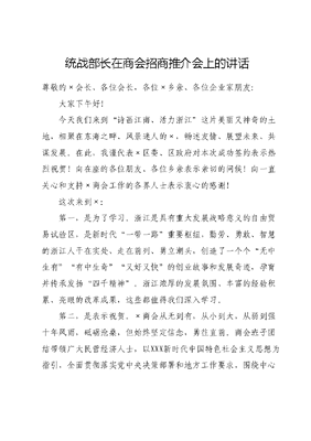 统战部长在商会招商推介会上的讲话尊敬的×会长、各位会长,各位×乡亲、各位企业家朋友:大家下午好!今天我们来到诗画江南、活力浙江这片美丽又神奇的土地,相聚在东海之畔、风景迷人的×,畅述友情、展望未来、共谋发展。在此,我谨代表×区委、区政府对本次成功签约表示热烈祝贺!向在座的各位朋友、各位乡亲表示亲切的问候!向一直关心和支持×商会工作的各界人士表示衷心的感谢!这次来到×:第一,是为了学习。浙江是具有重大发展战略意义的自由贸易试验区,是新时代一带一路重要枢纽,勤劳、勇敢、智慧的浙江人干在实处、走在前列、勇立潮头,创造了一个个无中生有有中生奇又好又快的创业故事和发展奇迹,孕育并传承发扬四千精神。浙江浓厚的发展氛围、丰富的经验积累、亮眼的改革成果,这些都值得我们深入学习。第二,是表示祝贺。×商会从无到有,从小到大,从弱到强十年风雨,砥砺沧桑,但始终坚定信念,勇往直前。商会班子团结带领广大民营经济人士,以XXX新时代中国特色社会主义思想为指引,全面贯彻落实党中央决策部署和地方工作要求,围绕中心服务大局,奋发进取、担当作为,成绩突出、可喜可贺。一是商会工作有声有色、可圈可点。商会全面服务会员,打造宾至如归的会员之家,主动对接政府反映企情民意,有效搭建起政企沟通桥梁,积极思考谋划,促进商会建设、企业发展。获得中国社会组织3A商会、×四好商会等表彰。二是经济效益和社会效益相得益彰、出新出彩。围绕党委、政府中心工作献计出力,服务民营经济有力有效,助力优化营商环境走深走实,主动为外地企业投资×牵线搭桥,为优质项目落户家乡做出积极贡献。三是企业家形象有口皆碑、声名远扬。以×会长为代表的近×名×商人企业家不仅德才兼备、有胆有识,更是宅心仁厚、侠肝义胆,爱心助学、扶贫济困、无私奉献,汇聚人间大爱、彰显家国情怀。第三,是发出邀请。看到各位会长等领军一路、创富一方的企业家,倍感亲切自豪,也再一次感受到我们×人简约而不简单实在又有实力,而且讲感情、重乡情。在此,诚挚邀请×的朋友们、各地的企业家们来×、来×,穿针引线、献计出力。借此机会,我讲四句话。第一句,要有面朝大海,春暖花开的心境。XXXXXX在看望参加全国政协会议的民建、工商联界委员时的讲话中强调,要引导民营企业和民营企业家正确理解党中央方针政策,增强信心、轻装上阵、大胆发展,实现民营经济健康发展、高质量发展。×月先后出台政策,促进民营经济发展壮大。近日,中国人民银行等八部门联合印发《关于强化金融支持举措助力民营经济发展壮大的通知》,加强民营企业金融服务,×也出台《进一步加大力度支持民间投资发展的若干政策措施》,持续激发民营经济活力。民营经济是推进中国式现代化的生力军,是高质量发展的重要基础,是推动我国全面建成社会主义现代化强国,实现第二个百年奋斗目标的重要力量,企业家一定要坚定发展信心,深化×两地的交流交往交融,共谋高质量发展之路。第二句,要有海纳百川,有容乃大的气度。浙商商帮是中国历史上的五大商帮之一,天下闻名、历史悠久。古有明初天下首富沈万三,近有五金行业的先驱叶澄衷,以及庞云曾、顾福昌等中国最早的强大商人群体,如今的浙商享誉海内外,如××等等。咱们×的企业家们要深刻领悟浙商四千精神,以东临碣石,以观沧海的宏大格局立足×、放眼世界,在创业理念上敢为人先,在经营理念上争创一流,在思想解放上领先一步,结合企业实际,确立市场化的思路、国际化的眼光、现代化的理念,充分展示我们民营企业家开放包容、敢闯敢干、勇于争先的创业精神。第三句,要有在商言商、以商养会的共识。当前,经济发展已进入新常态,发展方式不断转变,新旧动能加快转换,在这个关键时期,民营企业家一定要迎难而上、抢抓机遇,主动应对形势变化,发扬抱团发展、同向发力、重情重义、自强不息的×商精神,做精做细产品,做大做强商会。要强化商会政治建设做实党建促会建工作,形成商会品牌,着力打造中国特色的一流商会。第四句,要有干在他乡、心系故乡的情怀。×写进了党的XX大报告,是继京津冀协同发展,长三角区域一体化发展,粤港澳大湾区建设,又一国家重大区域发展战略,由XXXXXX亲自谋划、亲自部署、亲自推动。×,东出西进、交通南北,当前,我们正积极抢抓机遇,持续做靓×三张名片,聚力打造千亿级工业大区。作为创业×的×人,我们既要建功他乡,又要回报故乡,在中华大地做大做强做优企业。最后,衷心希望并祝愿今天各区县的签约能够早日落地开花结果!衷心祝愿×商会在新的征程中取得更加辉煌的成绩!祝愿各位领导、嘉宾和企业家朋友们身体健康、事业兴旺、家庭幸福谢谢大家!本文档编辑密码:gwsx2024