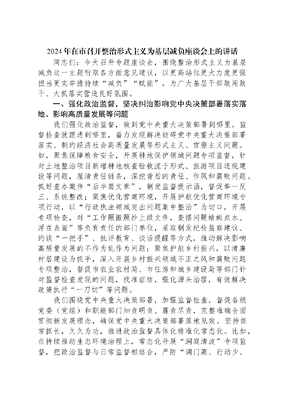 2024年在市召开整治形式主义为基层减负座谈会上的讲话同志们:今天召开专题座谈会,围绕整治形式主义为基层减负这一主题听取各方面意见建议,以更高站位更大力度更强担当更实举措持续减负赋能,为广大基层干部敢闯敢干、大抓落实营造良好氛围。一、强化政治监督,坚决纠治影响党中央决策部署落实落地、影响高质量发展等问题我们强化政治监督,做到党中央重大决策部署到哪里,监督检查就跟进到哪里,着力发现解决妨碍党中央重大决策部署落实、制约经济社会高质量发展等形式主义、官僚主义问题。如,聚焦保障粮食安全,开展耕地保护领域问题专项监督,针对土地整治项目新增耕地核查验收流于形式、旅游项目违规建设等问题,厘清责任链条,深挖背后的责任、作风和腐败问题。抓好查办案件后半篇文章,制发监督提示函,督促举一反三、系统整改;聚焦优化营商环境,开展护航优化营商环境专项行动,以行政执法领域突出问题集中整治为切口,开展专项检查,对工作照搬照抄上级文件,查摆问题蜻蜓点水、浮在表面等负有责任的部门单位,采取制发纪检监察建议、约谈一把手、批评教育、谈话提醒等方式,推动解决影响高质量发展的不作为乱作为问题;聚焦护航乡村振兴,以清廉村居建设为抓手,深入开展乡村振兴领域不正之风和腐败问题专项整治,督促市农业农村局、市住房和城乡建设局等部门针对监督检查发现的问题,找准症结,强化源头治理,有效解决政策执行一刀切等问题。我们围绕党中央重大决策部署,加强监督检查,督促各级党委(党组)和职能部门知责明责、履责尽责,完整准确全面贯彻新发展理念,确保党中央重大决策部署落地见效。坚持抓常抓长,久久为功,推进政治监督具体化精准化常态化。比如,在持续推动生态环境治理上,常态化开展洞庭清波专项监督,把政治监督与日常监督相结合,严防调门高、行动少、落实差等形式主义、官僚主义问题。去年以来,追责问责生态环境领域X人,党纪政务处分X人,组织处理X人。坚持抓深抓实,把监督探头架设在决策部署落实、基层发展一线,推动力量下移、监督下沉。比如,在持续助力优化营商环境上,牵头开展营商清风专项行动,设立X个营商环境监督点,聘请政风行风监督员,推动营商环境优化升级。坚持抓严抓细,一锤接着一锤敲,一个问题一个问题解决。比如,会同市行政审批局开展清风为民专项行动,围绕责任、作风和服务效能等方面,对市县两级X个政务服务中心、X个村(社区)便民服务站进行督导调研,集中通报问题,督促整改,推动X类事项实现一件事一次办,一网通办。我们制定政治监督任务清单,确定监督重点,分步实施、统筹推进。坚持从各级领导干部和班子成员抓起,深化运用每月提示预警卡等监督机制,打好专项监督、问题督办、以案促改、通报曝光组合拳,靶向纠治贯彻落实党中央决策部署做选择、搞变通、打折扣,阳奉阴违、各行其是等问题。比如,配合开展统计造假专项治理,直查直办X违法占用耕地问题。聚焦生态环保督察反馈问题整改,开展全链条监督,对X市X区矿山生态修复严重滞后、X县生活污水治理设施建设推进不力等问题严肃追责问责,用铁的纪律守护绿水青山。坚决查处表态多调门高、行动少落实差,执行政策简单化、一刀切等问题,对X水利枢纽X非法网箱养殖问题整改不力等问题严肃追责问责。二、深入整治加重基层负担问题,确保为基层减负各项措施落地见效我们坚持问题导向,创新监督方式,以四不两直方式开展整治形式主义为基层减负工作调查摸底,对发现的问题进行系统整改。如,开展专项清理,纠正市直部门对县区考核检查评比过多过频、设计不科学等具体问题X余个。用好X数据富矿,加强数据比对分析,多渠道收集问题。针对工单办文可居文库——海量学习资料,手机电脑均可下载www.wenkeju.com理互踢皮球问题,集中筛查交办线索,从严从快查处问题X件;对职责交叉、权责不清的,督促厘清责任、明确办理单位,去年推诿扯皮工单下降88%。运用直通车机制助力基层减负,针对收集到的表现在基层、根子在上面问题,同步抄送市委为基层减负专项工作办公室,对具有普遍性、代表性的问题,会同市委办公室督促开展面上整改,向有关市直部门制发监督建议X份、工作提示X份。比如,紧盯基层反映的台账多、报表多,多头调度、重复调度等问题,督促市直有关部门对调度事项进行全面自查清理,有效减轻基层负担。我们出台深化整治形式主义为基层减负工作方案,以推动落实X省委十二个不得为具体抓手,逐条逐项对标要求,细化措施,深化整治突出问题。推动从市级层面带头抓精文减会,大力整顿文风会风,严格执行文件会议计划管理,去年市本级发文开会数量同比显著下降。加强与市委组织部、市委宣传部、市委督查室等部门的联动,以四不两直方式对落实十二个不得情况进行督导检查,督促各县市区党委政府严格落实为基层减负工作。