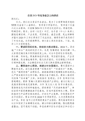 在镇2024年度务虚会上的讲话同志们:今天,我们在这里召开务虚会,是为了全面贯彻落实党的XXX及省委十二届四次、 X市委十四届四次、 X市委十五届六次全会精神,对我镇2024年工作进行交流研讨,理清思路、明确目标。刚才,各村(社区)书记、各办室(中心)负责人围绕党建引领、产业发展、项目建设、基层治理、民生保障等方面对2024年工作打算进行了交流发言,镇领导班子成员进行了补充交流,这些我都赞同,请大家认真抓好落实。下面,我讲三个方面的意见。一、要紧盯目标任务,持续发力推动落实。2024年,是实施十四五规划的攻坚之年,也是 X镇建设 X的关键一年,大家要把精力集中到到搞发展上来,对全年目标任务再梳理、再分解、再细化,聚焦集体经济发展、项目招引落地、产业发展提速、民生福祉增进等,强化执行落实,切实增强工作的责任感和紧迫感,为全镇经济社会又好又快发展做出新的贡献。二、要围绕中心用劲,推进乡村全面振兴。要巩固提升主题教育成果,深化基层党建双强双创双诺双评机制,优化微网实格治理体系,持续推进镇村党群服务阵地建设,从严落实意识形态责任制,建强后备干部队伍。要深入推进两项改革后半篇文章,加快推进 X建设,力争 X项目尽快落地建设。要将 X融入民宿休闲旅游产业谋划,着力打造人文底蕴深厚的特色民宿集群,力争 X文化入选 X市非遗名录。要持续优化中药材种植基地,探索建设天府森林粮库,争创省级中医药健康旅游示范基地,打造中医药特色小镇。要加快推进竹产品研发基地建设,打造竹产业集群,争创国家竹产业示范园区。要全力争取2024年专项债项目,大力发展粮经复合产业,争创 X市三星级粮经复合产业园区。要巩固省级安全社区和国家卫生镇建设成效,健全纠纷化解机制,强化隐患排查整治,坚守底线不动摇,争创成都市百佳示范社区和示范小区、国家安全发展示范乡镇。三、要加强作风建设,营造良好干事氛围。要认真贯彻落实上级党风廉政建设的部署和要求,持续深化三比一提升行动,精准有效运用监督执纪四种形态,及时发现处理苗头性、倾向性问题。要加强行政审批、项目建设等关键领域和重点环节监督检查和问题线索查办力度,保持惩治腐败高压态势。要加强干部教育引导,持续开展作风专项整治,扎紧扎牢制度笼子,加强廉政风险防控,切实做到红线不触、底线不碰。同志们,务虚是为了更好地务实。希望全体干部职工以这次务虚会为契机,高质量谋划2024年工作,以更加饱满的热情更加旺盛的干劲,更加务实的作风,抓落实、解难题、促发展、保民生,为建设践行新发展理念的 X中心贡献智慧与力量。文可居文库——海量学习资料,手机电脑均可下载www.wenkeju.com