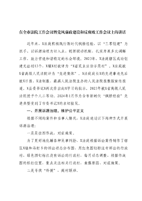 在全市法院工作会议暨党风廉政建设和反腐败工作会议上的讲话近年来,X法庭积极践行新时代枫桥经验,以三零创建为抓手、以诉源治理为切入点,创新联动机制,扎实开展多元调解工作,助力营造和谐稳定的社会环境。2023年,X法庭辖区成功创建无讼村13个,X镇X村被评为X省民主法治示范村。X法庭被X省高级人民法院评为先进集体。X法庭庭长X的先进事迹先后被X日报、X法制报、最高人民法院主办的人民法院报整版宣传报道。X县委书记X两次作出向X学习的批示。2023年被X省高级人民法院授予个人二等功。2024年1月作为全市新时代枫桥经验先进典型受到了市委书记X的亲切接见。一、开展诉源治理,维护公平正义根据不同的案件和当事人情况,X法庭通过以下两种方式开展诉源治理:一是是挂图作战,对症施策。为了更好地化解各种民事纠纷,X法庭根据诉讼案件制作了辖区X镇和马村乡的诉讼动态分布图,用红色图钉标注有诉讼的行政村,绿色图钉标注没有诉讼的行政村,每月动态调整,根据作战图的标红位置,重点关注相关行政村,查摆原因、对症施策。二是寻找外援,庭村联动。张保中庭长,在X人民法庭工作的这20年里,走遍了辖区的136个自然村,对辖区面积、人口、行政村、自然村、村民组及各村易发的案件类型和特点均了然于胸。熟悉并经常联系各行政村的支部书记、村主任,给予化解矛盾提供调解思路和法律帮助;法庭的办公电话和张保中的手机号码以法官调解热线的方式在辖区的136个自然村公布,为百姓解决纠纷免费提供法律咨询和帮助在辖区的63个行政村,邀请了63名村干部作为司法联络员,负责收集群众诉求、沟通反馈、协助送达文书和调解,及时掌握村情民意,信息共享,联动配合,及时化解矛盾纠纷,切实将矛盾隐患消灭在萌芽状态。为了让这些联络员更好地发挥作用,X法庭以联合送法为抓手,举办法治讲座、交流会,讲解法律知识,以案说法,提升他们依法解决问题的能力,最大限度的做到小事不出村,大事不出乡(镇)或者化解在来法院的路上,坚决杜绝民转刑案件的发生。二、创新八步工作法,调案件止纷争八步工作法,就是一待、二听、三稳、四查、五定、六调、七宣、八跟。从热情接待、认真聆听陈述、稳定当事人情绪多渠道判断查清案情症结、矛盾定性及调解方案制订、多策略多渠道调解、结案后普法宣传、跟踪履行等八个方面全力办好每一文可居文库——海量学习资料,手机电脑均可下载www.wenkeju.com个宜调案件。只要双方有一丝调解意愿或调解成功可能,X法庭都反复研讨调解方案,不厌其烦的析法说理、分析利弊,确保通过八步工作法,让案件能调就调,免去后续司法环节,既节省了司法资源又减轻了当事人的诉讼或执行压力,还能在当事人之间酿酝一种和谐友好氛围。2023年,经X法庭调处的离婚和小额诉讼案件的当庭自动履行率达到80%以上。三、践行联动机制,化解纠纷促和谐X法庭主动将诉讼服务窗口和工作重心前移,融入乡村社会治理过程,延伸诉讼服务触角,参与矛盾纠纷排查化解,进一步将矛盾纠纷化解在最前沿。当好法律服务引导员、多元解纷协调员人民调解指导员、法律知识宣传员,努力解决人民群众急难愁盼的烦心事,为乡村振兴提供优质精准的司法保障。积极探索建立两所一庭多元化解矛盾纠纷联动机制。诉前,和辖区的司法所联合设立诉前调解中心,组建了以法庭、司法所、派出所、乡镇综治中心共同参加的基层司法服务朋友圈,采取微信调解+司法确认方式快速化解买卖、借款、劳务用工、邻里、土地承包经营权等纠纷案件。诉中,对进入诉讼程序的案件,则发挥开庭前的法庭+N(N代表司法所、派出所、两代表一委员、乡村贤达、法律明白人等)模式的调解作用,力促圆满化解矛盾纠纷。对经多次调解未达成协议的案件,文可居文库——海量学习资料,手机电脑均可下载www.wenkeju.com及时实行巡回审判模式,使X法庭成为基层群众不出村、院落门前化解矛盾纠纷的第一窗口。成绩虽好已成为过去,未来任重道远依然可期。新起点新征程,同时X法庭也在深入思考目前和今后如何进一步去拓宽调解解纷和诉源治理的宽度和维度,探索更能解决各类纠纷的新方式、新方法。我们坚信,在X市委、X县委及X中院党组的正确领导下,通过两级法院同仁们的踔厉奋发,勇毅前行,团结拼搏和共同努力,一定会让我们的基层治理锦上添花,百尺竿头更进一步。文可居文库——海量学习资料,手机电脑均可下载www.wenkeju.com
