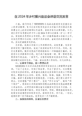 在2024年乡村振兴座谈会讲话交流发言之前,我们传达了XXXXXX在决战决胜脱贫攻坚座谈会上的讲话精神、X书记在对脱贫攻坚及乡村振兴进行再动员再部署会议上的讲话精神以及省委、省政府有关决策部署。今天,我们召开X局理论学习中心组2024年第3次集体(扩大)学习会,紧密联系思想和工作实际,进一步指导推进乡村振兴工作,切实把思想和行动统一到党中央和省委、省政府的决策部署上来,坚决打赢脱贫攻坚战。总体看,我局乡村振兴工作进展顺利,成效显著,包保贫困村实现了整村脱贫,完成了扶贫的各项工作任务。同时,我们也要看到,脱贫攻坚战不是轻轻松松一冲锋就能打赢的,依然存在许多困难和问题,我们决不能有缓一缓、等一等的思想,要坚持尽锐出战、一鼓作气,全面发起脱贫攻坚总攻行动,确保如期完成目标任务。下面,结合我局工作实际,谈几点体会。一、认真学习领会,统一思想认识XXXXXX在这次决战决胜脱贫攻坚座谈会上的重要讲话精神,下达了总攻令、吹响了集结号、作出了宣言书,对加强党对脱贫攻坚的领导,高质量完成脱贫攻坚目标任务提出了明确要求。朝鲁书记从目标、政策、格局、标准、氛围、责任等六方面,画好了我省脱贫攻坚路线图、计划表。我们要认真学习领会,切实增强四个意识、坚定四个自信、做到两个维护。要深刻认识到疫情防控阻击战和脱贫攻坚战都是重大政治任务,必须坚持如期全面完成脱贫攻坚任务不动摇,工作总体安排部署不能变,进度不能停。同时,要根据疫情情况,统筹安排疫情防控和脱贫攻坚,做到两手抓、两不误,一句话,疫情防控一丝不能放松,脱贫攻坚一天不能耽误。二、加强党的领导,压紧压实责任党组要带头落实各项工作责任,严格执行一把手责任制,全年研究部署脱贫攻坚工作不少于4次,及时调度工作进度,把各项工作抓紧、抓实、抓到位。各局领导要按照《关于调整脱贫攻坚工作领导小组及责任分工的通知》明确的工作任务,扎实开展工作。承担行业扶贫和包保扶贫任务的局领导,要把脱贫攻坚放在优先位置,全年研究部署脱贫攻坚工作不少于4次,督导相关处室完成好全年目标任务。纪检监察组、机关纪委要把脱贫攻坚作为重点监督检查内容,加大监督执纪、跟踪监测、明查暗访和责任追究力度,切实履行综合监督监管责任。三、强化精准扶贫,夯实工作基础目前,整个包保贫困村、贫困户全部脱贫,但可能还会存在边缘人口易致贫、返贫的问题。在防止边缘人口致贫、返贫方面,要严格落实四个不摘要求,保持帮扶工作稳定性和连续性,做到帮扶措施不停,驻村工作队不撤。要重点关注老年人、重症病人、慢性病人、残疾人等特殊困难群体,尤其是受疫情影响严重的,及时给予救助,防止边缘人口致贫。这方面工作要充分发挥驻村工作队作用。负责同志要督导驻村工作队积极宣传扶贫政策,落实扶贫措施,帮助群众解决难题。对驻村工作队要坚持严管厚爱相结合、激励约束并重,加强管理、关爱和保障。四、壮大扶贫产业,提升脱贫质量要加大对柳河西村扶贫项目和村级光伏扶贫电站项目的支持力度,发展壮大集体经济,提升带贫能力。要积极支持庭院经济,发展短平快项目,千方百计增加贫困户收入。要大力开展第一书记代言活动和消费扶贫行动,发挥电商平台的作用,切实解决扶贫农畜牧产品难卖问题,帮助群众把产品卖出去、卖出好价钱。要配合做好春耕备耕工作,保证贫困群众种苗、饲料等农资供应,确保农业生产不受影响。文可居文库——海量学习资料,手机电脑均可下载www.wenkeju.com五、落实行业责任,发挥能源作用要针对民生实事、光伏扶贫电站等各项工作,抓紧制定完善推进工作方案,实行台账管理,确保各项工作有人抓、有人管、有人落实。要进一步强化责任担当、创新工作方法、务实工作举措,做好对国家大政方针的研判,加强与相关部门的沟通协调,再多争取一些国家政策支持,为落实好各项任务提供更加坚实的政策保障。打赢脱贫攻坚战,本来任务就很艰巨,遇到疫情就更加艰巨。我们要在以XXX同志为核心的党中央坚强领导下,全面贯彻落实省委、省政府决策部署,上下一心、坚定信心,在这次大战大考中主动担当作为,践行初心使命,交出合格答卷,为全面建成小康社会作出应有贡献。文可居文库——海量学习资料,手机电脑均可下载www.wenkeju.com