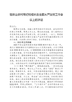 驻农业农村局纪检组长在全面从严治党工作会议上的讲话同志们:按照会议安排,我就认真贯彻落实中央纪委、省纪委和市纪委工作部署,聚焦主责主业,强化政治监督,深入推进农业农村局系统全面从严治党工作,讲几点意见。一会儿,局党组书记、局长X同志还要对全面从严治党和党风廉政建设等工作进行部署,大家要认真学习领会,坚决贯彻落实。一、2023年工作回顾2023年是全面贯彻落实党的XXX精神开局之年,这一年,我们以XXX新时代中国特色社会主义思想为指导,以学习贯彻党的XXX精神为主线,以XXXXXX来陕考察重要讲话重要指示为根本遵循,在市纪委监委的坚强领导下,在局党组的积极支持配合下,围绕保障粮食安全,不发生规模性返贫两条底线,强化政治监督、做实日常监督、严格执纪审查、巩固作风建设成效,推动农业农村系统深入落实全面从严治党责任和反腐败工作,为局系统各项工作高质量发展提供了强有力的纪律保障。(一)聚焦两个维护,强化政治监督。一是在政治监督具体化、精准化、常态化上下功夫。落实室组联动工作机制,聚焦党中央、省委、市委决策部署落实情况,建立《政治监督工作台账》,细化了4个方面11项重点工作进行监督,按照周进展、月汇总、季总结的工作机制,及时进行督促检查,推动上级决策部署落地落实。二是聚焦贯彻落实党中央重大决策部署以及市委一号文件开展监督。围绕学习贯彻党的XXX精神、开展主题教育、三个提升年活动开展检查4次,发工作提醒函13份,约谈人员45人次。针对高标准农田项目建设管理方面存在的问题,发监察建议1份。对《县区须持续抓好全面推进乡村振兴中审计发现问题整改落实》、《我省部分县区耕地保护问题突出应引起相关部门高度重视》文件整改情况进行检查,督促落实整改责任,涉及局系统19条问题,已整改16条,正在整改3条。三是聚焦市委五届一次巡察反馈问题整开展监督。督促整改市委第五巡察组反馈问题共95个,整改完成90个,对需长期坚持整改5个任务,定期督促,务求取得实效。(二)聚焦重点环节,做实日常监督。一是健全全面从严治党体系。按照构体系、建清单、明责任的工作思路,协调党组召开了2023年度全面从严治党工作会议,制定主体责任清单,同时要求认真落实全面从严治党主体责任,领导班子成员切实履行一岗双责职责。局党组书记分别与局党组成员、直属党组织负责人签订党风廉政建设责任书,通过层层传导压力,形成书记抓、抓书记的党建工作体系。二是强化日常监督检查。6月份与局机关纪委开展工作联动,对16个局属单位主体责任履行情况、落实中央八项规定执行情况进行了监督检查,并向党组反馈存在的问题。9月20日与驻在部门召开全面从严治党工作,通报了在监督检查中发现的5个问题,进一步传导压力,压实全面从严治党主体责任。针对移交问题线索反应的公务用车管理制度执行不到位、试验示范项目管理混乱问题进行检查,发监察建议书2份。三是紧盯三重一大事项开展监督检查。督促完善三重一大议事制度,落实会前报备工作机制,规范行使权力。2023年参加驻在部门列席会议30余次,收到三重一大议题报备101次,货物或服务项目采购事前报备28次。四是规范干部廉政审查。结合反应的问题线索,在干部提拔、评优、树模等方面共出具廉政鉴定意见298份,组织任前廉政考试2次20人,集体廉政谈话2次。(三)强化执纪审查,增强惩戒力度。一是加强党员干部的教育。督促开展第六个纪律教育宣传月活动,400余名干部文可居文库——海量学习资料,手机电脑均可下载www.wenkeju.com在陕西纪检监察微信公众号全省纪律教育学习宣传月党规党纪知识测试栏目进行了在线知识测试,合格率达99.7%。二是常态化开展警示教育。组织学习《党的十九大以来陕西省查处作风问题典型案例选编》,观看《借路敛财自毁人生路》等10余部警示教育片,教育党员干部知敬畏、存戒惧、守底线。三是强化执纪审查。建立问题线索处置专项台账,按时报送谈话室使用情况,及时通过案管系统记录案件办理情况,对案件进行规范化管理。今年我组办结上一年度结转案件7件,给予党纪政务处分9人次;收到问题线索12件,函询了结3件;谈话了结6件,诫勉谈话5人,提醒谈话1人;初核转立案2件,司法移送直接立案1件(3件正在办理中)。(四)巩固作风建设成效,持续推进作风转变。一是紧盯关键节点纠四风。在五一端午、中秋国庆等节假日前后对驻在部门进行廉洁提醒谈话、发送廉洁提醒、开展明察暗访,着力营造风清气正的节日氛围。二是深化作风建设。开展干部作风能力提升年活动监督检查,通过座谈、查看资料对局系统进行了监督检查,针对存在的问题,发工作提醒2份,责令限期整改。三是突出专项整治。加强对群众身边腐败和作风问题专项整治工作的监督检查,反馈驻在部门5个方面问题,督促驻在部门强化监