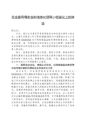 在全县网络安全和信息化领导小组会议上的讲话同志们:今天,我们在这里召开县委网络安全和信息化领导小组会议,主要任务是深入学习贯彻XXX新时代中国特色社会主义思想特别是XXXXXX关于网络强国战略思想的重要论述,全面落实全国、省、市网络安全和信息化工作会议精神,安排部署全县网络安全和信息化工作,推动我县网络安全和信息化工作再上新台阶。刚才,县委宣传部、县公安局、县科工信局、县商务局和县委机要局代表县委网络安全和信息化领导小组各专项小组总结和安排了相关工作,我都原则上同意。下面,我就全县网络安全和信息化工作再强调三点意见。一、提高政治站位,增强认识自觉,以网络强国战略思想为统领做好新时代网络安全和信息化工作去年4月,在全国网络安全和信息化工作会议上,XXXXXX从党长期执政和国家长治久安的高度,深刻阐明了网信事业发展的一系列方向性、全局性、根本性问题,明确了网信工作在党和国家事业全局中的重要地位、网络强国建设的战略目标和原则要求、互联网发展的国际主张以及做好网信工作的基本方法,是指导新时代网络安全和信息化发展的纲领性意见,是建设网络强国、数字中国、智慧社会的行动指南。6月11日,省委召开全省网络安全和信息化工作会议,会上省委书记从全面把握XXX网络强国战略思想、牢牢掌握网络意识形态工作领导权、坚决筑牢网络安全屏障、大力发展数字经济、充分发挥信息化驱动引领作用、全面加强党对网信工作的领导六个方面,对推进网络强省、数字X、智慧社会建设作出了安排部署,为我们做好当前和今后一个时期网信工作提供了前进方向。10月29日,市委召开全市网络安全和信息化工作大会,书记强调要深入贯彻落实全国、全省网络安全和信息化工作会议决策部署,全面加强党对网信工作的领导,加强互联网内容建设,健全网络综合治理体系,着力提升网络安全保障能力,充分发挥信息化驱动引领作用,加快建设网络强市、数字绵阳、智慧社会,为中国X和西部现代化强市建设提供强大网上舆论支持、可靠网络安全保障、有力信息化支撑。近年来,县委坚定以XXX新时代中国特色社会主义思想为指导,始终坚持正确政治方向,把网信工作放在全局中谋划,切实加强党对网信工作的集中统一领导,全县网信事业呈现了欣欣向荣的可喜局面。特别是进一步健全了网信工作体制,将网信工作纳入年度目标考核,出台《网络意识形态工作责任制实施细则》,有序推进网络治理,扎实开展网络理政,近年来共办理网络理政信件15400余件,网络舆情2800余件,用心用力办出了党和政府的温暖;两微、两网、一端、一报等官方网络新闻媒体和官方政务媒体平台持续活跃,确保了主旋律和正能量突出;网络基础建设及电子商务起步较快,完成63个乡镇(街道)全光网建设,城区光纤100M到户覆盖率达99%,实现县城和乡镇4G全覆盖,电子商务全覆盖的现代商贸体系正加快构建,商贸流通企业信息化改造率已达90%以上。但与此同时,我们也要清醒地认识到,我县的网信工作还存在诸多不足和较大差距。一是总体亮点不够,创新力不强;二是网信人才匮乏,产业发展速度较慢;三是基础设施薄弱,还需加大投入;四是缺乏防控能力,工作主动权掌握不牢等。为此,我们要切实把思想和行动统一到中央、省委、市委关于网信工作的战略部署上来,以高度的责任感、使命感、紧迫感,以时不我待、只争朝夕的精神改革创新,加快推进全县网信工作,为人民群众筑牢网络安全屏障,让人民群众有更多获得感、幸福感、安全感。文可居文库——海量学习资料,手机电脑均可下载www.wenkeju.com二、科学谋划布局,全面统筹推进,奋力推进网络安全和信息化工作更好服务X高质量超常规发展做好X网络安全和信息化工作的总体要求是:坚定以XXX新时代中国特色社会主义思想特别是XXXXXX网络强国战略思想为指导,深入贯彻落实全国、全省、全市网络安全和信息化工作会议决策部署,全面加强党对网信工作的领导,紧紧围绕统筹推进五位一体总体布局和协调推进四个全面战略布局,通过加强网络意识形态工作、网络综合治理体系、信息产业化建设、电子政务工作和电子商务工作,不断提升网上舆论引导力、网络安全保障力、人民群众获得力、党政机关决策力、经济发展增长力,最终实现网络强县、数字X、智慧社会。具体目标是:(一)坚定做好网络意识形态工作,着力提升网上舆论引导水平。一是切实加强党对网信工作的领导,牢牢掌握网络意识形态工作领导权、管理权、话语权,严格实施网络意识形态责任制。坚持正确政治方向、舆论导向、价值取向,持续深入推进XXX新时代中国特色社会主义思想、XXXXXX对网络安全工作系列重要指示精神和党的XXX、省委十一届三次全会、市委七届五次全会、县委十三届六次全会精神的网上学习宣传,让XXX新时代中国特色社会主义思想和党的主张、党的声音成为网络空间最强音。二是着力构建网上网下同心圆,增强