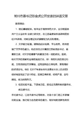 常州市委书记陈金虎公开发表的讲话文章推荐理由:1.理论基础较深。他毕业于南京师范大学,全日制国际共产主义运动专 业硕士研究生,在江苏省委宣传部讲师团担任3年讲师,对政治理论知识掌握较为扎实和精准。2.文字能力较强。锻炼的起点较高,平台优秀,有效增强了文字综合能力。他还担任过共青团江苏省委副书记、省青联主席,对文字的青春气和鲜活力有一定的研究。因此,他对文字的理解和运用有独到之处,即:既有扎实的理论功底,又有良好的文字基础,还有创新的立意构思,更有精彩的好词金句。他在《2017年度全市先进表彰大会上的讲话》很好地显现出了这个特征,因其立意新颖、结构严谨、金句频现,成为网络热文。3.经历比较丰富。下派地方后,担任过无锡市政府副市长、政法委书记、市纪委书记,江阴市委书记等职务,对各个部门的工作掌握比较全面,加之较为出色的综合能力,较好地把创新性和实用性融入到施政理念中,他讲话文章的系统性、逻辑性、准确性和概括性都比较强。4.文稿价值较高。这套讲话文章汇编时间跨越不长,但内容的涵盖面比较广,还原了一位县级市委书记2年完整的施政过程。无论是对学习文章构思、文字锤炼、写作技巧,还是了解全国百强县的县处级领导干部的日常工作、执政生涯、官场规则都是大有益处的。目录2003年1.推进苏北大发展若干问题研究..1 2010年2.在全国粮食信息化应用技术讨论会上的致辞9 3.纪念第十九个全国土地日: 着眼长远 主动作为 实现保障发展和保护资源双赢…11 4.严格水资源管理保障可持续发展13 文可居文库——海量学习资料,手机电脑均可下载www.wenkeju.com5.探索特色林业改革发展之路…..14 6.着力打造六大水利全面推进四城建设…..16 2011年7.严格管理水资源 推进水利新跨越..19 8.把握战略机遇坚持科学治水…..20 2012年9.坚持兴水利农 保障粮食安全….24 2015年10.在2015年兴澄特钢总结表彰暨二届三次职工代表大会上的讲话..25 2016年11.在元旦公益徒步大会开幕式上的讲话.28 12.在人大代表候选人见面会上的讲话29 13.市委十二届八次全体(扩大)会议主持词31 文可居文库——海量学习资料,手机电脑均可下载www.wenkeju.com14.立足新起点建设新江阴 为实现十三五良好开局而努力奋斗 在市委十二届八次全体(扩大)会议上的讲话34 15.在江阴市十六届人大五次会议代表团组召集人会议上的讲话.51 16.勠力同心 携手同行 为高水平全面建成小康社会而团结奋斗 在市政协十四届五次会议开幕式上的讲话…..55 17.在参加人代会城东小组审议时的讲话.60 18.在市政协专题座谈会上的讲话…..63 19.在参加人代会临港组审议讨论人大常委会和两院报告时的讲话……67 20.凝心聚力 真抓实干 共创高水平全面建成小康社会的新局面 在江阴市十六届人大五次会议闭幕式上的讲话..72 文可居文库——海量学习资料,手机电脑均可下载www.wenkeju.com21.在江阴市女企业家协会年会上的讲话.76 22.在市青年企业家协会稳中求进、锐意创新论坛暨2016年年会上的讲话…80 23.在抓基层党建和履行党风廉政建设主体责任述职评议会主持讲话84 24.在社会各界人士迎春茶话会上的致辞.95 25.江阴市2016年春节军政座谈会主持词…..98 26.在全市老