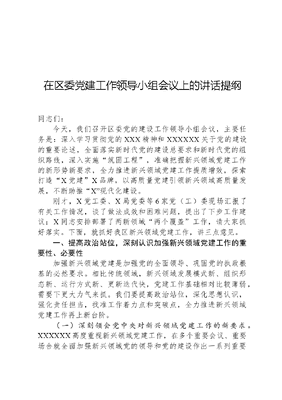 在区委党建工作领导小组会议上的讲话提纲同志们:今天,我们召开区委党的建设工作领导小组会议,主要任务是:深入学习贯彻党的XXX精神和XXXXXX关于党的建设的重要论述,全面落实新时代党的建设总要求和新时代党的组织路线,深入实施筑固工程,准确把握新兴领域党建工作的新形势新要求,全力推进新兴领域党建工作提质增效,探索打造X党建X品牌,以高质量党建引领新兴领域高质量发展,不断助推X现代化建设。刚才,X党工委、X局党委等6家党(工)委现场汇报了有关工作情况,谈了做法成效和困难问题,提出了下步工作建议;X同志安排部署了两新领域两个覆盖工作,请大家抓好落实。下面,就抓好我区新兴领域党建工作,讲三点意见。一、提高政治站位,深刻认识加强新兴领域党建工作的重要性、必要性加强新兴领域党建是加强党的全面领导、巩固党的执政根基的必然要求。相比传统领域,新兴领域发展模式新、组织形态新、运行方式新、更新迭代快,党建工作基础相对比较薄弱,需要下更大力气来抓。我们要提高政治站位,深化思想认识,强化责任担当,找准工作着力点和突破点,全力推进新兴领域党建工作再上新台阶。(一)深刻领会党中央对新兴领域党建工作的新要求。XXXXXX高度重视新兴领域党建工作,在多个重要会议、重要场合就全面加强新兴领域党的领导和党的建设作出一系列重要指示批示。XXX指出:非公有制企业是发展社会主义市场经济的重要力量。非公有制企业的数量和作用决定了非公有制企业党建工作在整个党建工作中越来越重要,必须以更大的工作力度扎扎实实抓好。并在今年全国两会上强调:党中央始终坚持两个毫不动摇、三个没有变,始终把民营企业和民营企业家当作自己人。加强新兴领域党建工作是推进新兴领域高质量发展的内源动力。要深刻领会XXXXXX关于新兴领域党建工作重要论述,把促进新兴领域持续健康发展作为根本出发点,督促基层党组织切实担负起直接教育、管理、监督党员和组织、宣传、凝聚、服务群众的职责,推动党建工作与业务发展、管理生产深度融合,激发非公和社会组织抓党建的内源动力。(二)深刻领会省委对新兴领域党建工作的新要求。徐麟书记强调:要加大新兴领域党建工作攻坚力度,要下更大力气来抓,持续提升党的组织和党的工作两个覆盖水平,完善非公和社会组织工委设置和运行机制。为加强新兴领域党建工作,近年来,省级层面先后出台了龙头民营企业党建示范引领行动计划、互联网企业双提升行动计划等一系列文件,并在全省开展货车司机党建工作试点。今年5月,省委印发《关于推动基层党建高质量发展的指导意见》及新兴领域等7个领域基层党建的行动方案。X作为省会主城区,我们一直致力于培育壮大市场主体,在抓新兴领域党建方面,更应该走前列、作示范,推动新兴领域党建工作出色、出彩、出经验,切实展现省会主城区担当。(三)深刻领会市委对新兴领域党建工作的新要求。市委高度重视新兴领域党建工作,市第十一次党代会提出深入实施筑固工程,以五个一行动总揽基层党建的工作路径。忠雄书记在去年七一X新业态新就业群体党建工作座谈会上强调:要带着党性、带着责任、带着感情,以引导好、服务好、管理好两司机两员为重点,扎实做好新业态新就业文可居文库——海量学习资料,手机电脑均可下载www.wenkeju.com群体党建工作。今年4月,X主持召开市委党建工作领导小组会议,强调要聚焦为什么抓抓什么谁来抓怎么抓抓得怎么样,坚持以配强一个支书、建好一支队伍、打造一个中心、健全一个机制、找准一条路子五个一行动总揽基层党建,持续擦亮筑固工程品牌。X月X日,X主持召开市委党建工作领导小组会议,再次强调要强化为什么抓的认识、抓什么的要求、谁来抓的责任、怎么抓的重点、抓得怎么样的成效,努力开创X党建工作新局面。我区正在制定1+7实施方案,核心内容就是五个一行动。文件印发后,大家要坚决抓好贯彻落实,以五个一行动总揽新兴领域党建工作。二、强化基层基础,切实把新兴领域党建各项任务履行好落实好XXXXXX在全国非公有制企业党建工作会议上强调,加强和改进非公有制企业党建工作,抓好两个覆盖、发挥好党组织两个作用、加强两支队伍建设很重要。省委办公厅印发的《贵州省新兴领域党建创新发展行动方案》,明确了6项工作任务(即:加强政治引领;实施两个覆盖攻坚行动;加强骨干队伍建设;加大新业态、新就业群体党建工作攻坚力度;持续推动党建示范引领、完善工作运行机制)。市委提出五个一行动总揽各领域党建,为我们抓实新兴领域党建工作指明了方向、提供了遵循。可以说,我们抓新兴领域党建,不是无所适从,而是有章可依,不是无足轻重,而是举足轻重。(一)配强一个书记。针对配强一个书记