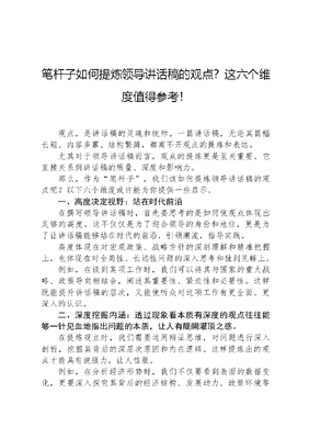 笔杆子如何提炼领导讲话稿的观点?这六个维度值得参考!观点,是讲话稿的灵魂和统帅。一篇讲话稿,无论其篇幅长短、内容多寡、结构繁简,都离不开观点的提炼和表达。尤其对于领导讲话稿而言,观点的提炼更是至关重要,它直接关系到讲话稿的质量、深度和影响力。那么,作为笔杆子,我们该如何提炼领导讲话稿的观点呢?以下六个维度或许能为你提供一些启示。一、高度决定视野:站在时代前沿在撰写领导讲话稿时,首先要思考的是如何使观点体现出足够的高度。这不仅仅是为了迎合领导的身份和地位,更是为了让讲话稿能够站在时代的前沿,引领潮流,指导实践。高度体现在对宏观政策、战略方针的深刻理解和精准把握上,也体现在对全局性、长远性问题的深入思考和独到见解上。例如,在谈到某项工作时,我们可以将其与国家的重大战略、政策导向相结合,阐述其重要性、紧迫性和必要性。这样既能提升讲话稿的层次,又能使听众对这项工作有更全面、更深入的认识。二、深度挖掘内涵:透过现象看本质有深度的观点往往能够一针见血地指出问题的本质,让人有醍醐灌顶之感。在提炼观点时,我们需要运用辩证思维,对问题进行深入剖析,挖掘其背后的深层次原因和内在逻辑。这样提炼出的观点才能具有说服力,让人信服。例如,在分析经济形势时,我们不仅要看到表面的数据变化,更要深入探究其背后的经济结构、发展动力、政策环境等因素。只有这样,我们才能对经济形势有更准确的判断,提出更有针对性的对策建议。三、广度拓展视野:全面审视问题广度体现在对问题的全面审视和多元思考上。在提炼观点时,我们需要具备开阔的视野和丰富的知识储备,能够从多个角度、多个层面去分析和思考问题。这样提炼出的观点才能具有全面性和客观性,避免片面性和主观性。例如,在谈论教育改革时,我们需要从教育公平、教育质量、教育创新等多个角度去思考和阐述问题。只有这样,我们才能对教育改革有更全面的认识和理解,提出更具操作性的建议和措施。四、力度彰显决心:强化措施落实责任力度体现在对措施的强化和对责任的落实上。在提炼观点时,我们需要明确目标导向和问题导向,针对存在的问题提出切实可行的解决措施,并明确责任主体和完成时限。这样提炼出的观点才能具有可操作性和实效性,让人感受到领导的决心和力度。例如,在部署环保工作时,我们可以明确提出加强监管、加大投入、推广新技术等具体措施,并明确各部门的职责和任务。这样既能增强讲话稿的针对性和实效性,又能推动环保工作的有效落实。五、精度瞄准靶心:精准批评整改问题精度体现在对问题的精准把握和批评的恰如其分上。在提炼观点时,我们需要深入调查研究,准确掌握第一手资料,对存在的问题进行精准分析,提出精准的批评和整改意见。这样提炼出的观点才能具有针对性和说服力,让人心悦诚服地接受批评并积极整改。文可居文库——海量学习资料,手机电脑均可下载www.wenkeju.com例如,在谈到作风建设时,我们可以针对存在的四风问题提出精准的批评和整改意见,如加强学习教育、完善制度机制、强化监督检查等。这样既能增强讲话稿的针对性和实效性,又能推动作风建设的深入开展。六、角度选择巧妙:灵活切换视角角度的选择对于观点的提炼也至关重要。同样的问题,从不同的角度去看待和分析,往往会得出不同的结论和观点。在提炼观点时,我们需要根据讲话稿的主题和目的,灵活选择切入角度,使观点更加新颖、独特和引人入胜。例如,在谈论创新发展时,我们可以从科技创新、制度创新、文化创新等多个角度切入,阐述创新的重要性和紧迫性。这样既能增强讲话稿的层次感和丰富性,又能激发听众的思考和共鸣。总之,笔杆子在提炼领导讲话稿的观点时,需要站在领导的角度去思考问题,具备高度的政治敏感性和大局意识。同时还需要深入调查研究,准确掌握实际情况,运用辩证思维和多维视角去分析和思考问题。只有这样,我们才能提炼出高质量、有深度、有广度的观点,为领导讲话稿增色添彩。文可居文库——海量学习资料,手机电脑均可下载www.wenkeju.com