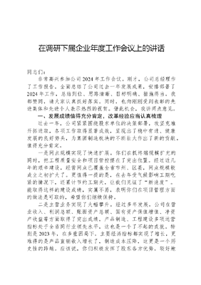 在调研下属企业年度工作会议上的讲话同志们:非常高兴参加公司2024年工作会议。刚才,公司总经理作了工作报告,全面总结了公司过去一年发展成果,安排部署了2024年工作,总结到位、思路清晰、目标明确、措施得当,我都赞同,请大家认真抓好落实。同时,也向刚刚受到表彰的先进集体和先进个人表示热烈的祝贺。借此机会,我讲两点意见。一、发展成绩值得充分肯定,改革经验应当认真梳理过去一年,公司紧紧围绕股东单位的决策部署,攻坚克难开拓进取,各项工作取得显著成效,呈现出了稳中有进、健康发展的良好势头,为集团制造板块的不断壮大作出了新的贡献,值得充分肯定。一是网点规模实现了快速扩展。你们在抓终端规模扩充的同时,把工程质量安全和项目管控摆在了突出位置。经过近几年的艰辛建设,经营网点已覆盖全省市州、区县,网点规模较成立之初扩大了。更值得一提的是,在去年受气候影响工期吃紧的情况下,还累计节约工期天,让我们见证了新速度。能取得这样的建设成绩,实属不易,表明你们在项目管理方面的做法是可取的,希望你们继续保持。二是主营业务实现了大幅攀升。经过多年发展,公司在营业收入、利润总额、账面资产总额、国有资产保值增值、净资产收益等方面取得了突出成绩,产品制造、工程建设多项运营指标处于全省同行业领先水平,这也是一个了不起的成就。特别是2023年,在多重困局下,主要经济指标都实现了增长,更难得的是产品直销收入增长了,制造成本压降,这更是一个历史性的跨越。应该说,你们积极发挥了股东各方优势,较好地整合了股东各方资源,尤其是去年在推进产品定价机制方面取得了重大进展,进一步提升了公司利润空间,希望今年在这方面还能有的更大突破。三是队伍建设得到了持续增强。股东双方派驻的班子成员在公司经营班子的带领下,团结一心、紧密配合,成为一个坚强有力的领导班子;公司广大干部员工凝心聚力,奋力拼搏,在节假日期间,发挥舍小家为大家的精神,坚守工作一线,圆满完成制造、销售等任务,为公司发展倾注了大量的心血和汗水。这些是公司的宝贵财富,更是公司未来高质量快速发展的基石。四是管理能力得到了显著提升。去来,你们在项目建设、经营模式、安全管控等方面探索实施了一批颇具特色的制度体系。比如,优化了施工设计方案,最大限度压缩建设工期、双重预防机制建设稳步推进,获得了省级部门的肯定,并有望作为试点项目应用推广。同时,构建了三位一体信息管理体系,成功实施承包管理,项目经营管理机制有效激活。这些好的做法和经验要好好总结、广泛推广,确保在企业经营管理中发挥更大成效。总的来说,这些成绩的取得,是公司领导班子团结带领广大干部员工顽强拼搏、奋发进取的结果。在此,我代表集团,对大家的艰辛付出表示衷心的感谢,对大家取得的成绩表示热烈的祝贺!二、强化责任加压奋进,持续突破再创辉煌上周,集团召开了年度工作会上,确立了2024年工作目标,提出确保完成投资,确保完成营业收入,确保实现利润总额。要实现这个目标,必须要有艰辛的努力和付出,必须要有超常的责任和担当。作为集团改革发展的主力军,下属公司一直都率先垂范、走在前列,这也意味着要承担更多的责任和压力。(一)继续树立志存高远的理想,勇担主力旗舰使命。今年,你们的营收、利润、建设等各项任务也很重,希望大家持文可居文库——海量学习资料,手机电脑均可下载www.wenkeju.com续强化责任担当,主动将增加利润、创造效益、加快建设作为经营管理工作的出发点,没有利润就没有发展,没有网络就没有市场份额。步入2024年,希望你们进一步强化责任担当,充分发挥和放大既有的基础优势,不辱使命挑大梁,乘势快进当先锋,认真贯彻落实股东方的战略规划,确保完成新一年度的目标任务,持续推进改革创新,推动公司发展取得更大突破。(二)继续发扬开拓进取的作风,努力扩大改革成果。创新是一个企业持续发展的不竭动力和鲜活源泉,是增强核心竞争的关键一招。今年,集团将加快推进国企改革各项举措落地落实,强化资本运作和开放合作,加快制造板块改制上市工作。公司要主动利用改革授权的政策包工具箱,主动与上市公司、行业先进水平对标,强化各项工作程序的规范性,加快现代国企治理体系建设,进一步厘清三会一层一核心的权责边界,进一步明确三重一大事项范围,加强党委会、董事会自身建设,切实构建起权责对等、运转协调、灵活高效、有效制衡的现代国企治理体系。(三)继续弘扬勇争一流的精神,努力提升发展质量。要科学处理好量与效、市与价的关系,全力推动产品收入稳步增长,积极拓展外部市场份额,提升经营效益。要增强战略协同能力,积极加强与兄弟公司在产品直销、原材料集采、联合促销等方面的联动,在经营网点开发、物资配送、数据共享等方面创新合作路径,共同做大做优相关业务。要积极研判应对好改造内容多样、政策约束趋严、市场期望提高的新形势和新要求,