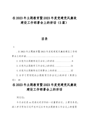 在2023年主题教育暨2023年度党建党风廉政建设工作部署会上的讲话(5篇)目录1.在2023年主题教育暨2023年度党建党风廉政建设工作部署会上的讲话..22.在党内主题教育动员会议上的讲话..83.在党内主题教育工作会议上的讲话.214.在党内主题教育动员部署会上的讲话..375.在学习贯彻党内主题教育工作会议上的讲话(集团公司)48在2023年主题教育暨2023年度党建党风廉政建设工作部署会上的讲话同志们:今天会议是xx党委决定召开的一次重要会议。主要任务是,深入学习贯彻习近平总书记在中央主题教育工作会议上的重要讲话精神,贯彻落实党中央、自治区党委、xx部和xx厅党委关于开展主题教育的系列部署要求,贯彻落实全区xx机关党风廉政建设电视电话会议、全区xx政治工作视频会议以及xx厅机关队伍建设视频会议精神,回顾总结2022年xx党建和党风廉政建设工作情况,对xx扎实开展主题教育和认真做好2023年度党建、党风廉政建设工作进行安排部署。下面,我讲x点意见。一、提高政治站位,深刻认识开展主题教育的重大意义。一是提高政治站位。习近平总书记在主题教育工作会议上的重要讲话,从全局和战略的高度深刻阐述开展主题教育的重大意义,明确提出主题教育的总要求和目标任务,对主题教育各项工作作出全面系统部署,为全党开展主题教育提供了根本遵循。xx各级党组织要切实提高政治站位,充分认识开展主题教育的重大意义,不断增强抓好推进落实的使命感、责任感,通过开展主题教育、进一步统一全x思想意志行动,铸牢坚定拥护两个确立、坚决做到两个维护的忠诚警魂。二是统一思想认识。x月xx日x中央政治局召开会议,决定从x月开始,在全党自下而上分两批开展学习贯彻新时代中国特色社会主义思想主题教育。x月x日,中央召开了主题教育工作会议,习近平总书记出席会议并发表重要讲话。x月下x日,自治区党委召开了学习贯彻习近平新时代中国特色社会主义思想主题教育动员部署会,x出席会议并讲话,x月xx日下午,xx厅召开动员部署会,xx就厅机关扎实开展主题教育活动作了全面的动员部署。今天我们召开会议,就是要统一思想、坚定信心,严格贯彻落实上级党委的系列决策部署,切实把xx的主题教育谋划好、组织好、落实好。三是突出教育主题。大家都知道,党的十八大以来,党中央先后在全党组织开展了群众路线教育实践活动、三严三实专题教育、两学一做学习教育、不忘初心、牢记使命主题实践教育、党史学习教育,前后连贯,相辅相成。但与以往不同的是,这次主题教育就一个主题,那就是学习贯彻习近平新时代中国特色社会主义思想,深刻领悟两个确立的决定性意义,增强四个意识、坚定四个自信,做到两个维护。各级党组织要在思想上高度重视,把此次主题教育作为一项重大政治任务来对待,以思想自觉引领行动自觉,高标准高质量抓好主题教育。二、把握目标任务,扎实推进主题教育深入开展。一是明确任务要求。党中央对这次主题教育的总体要求、目标任务和方法步骤做出了明确规定。总要求是学思想、强党性、重实践、建新功;根本任务是坚持学思用贯通、知信行统一,把新时代中国特色社会主义思想转化为坚定理想、锤炼党性和指导实践、推动工作的强大力量,使全党始终保持统一的思想、坚定的意志、协调的行动、强大的战斗力,努力在以学铸魂、以学增智、以学正风、以学促干方面取得实实在在的成效;方法步骤是这次主题教育不划阶段、不分环节,要把理论学习、调查研究、推动发展、检视整改贯通起来,有机融合、一体推进。xx各级党组织要严格按照党中央的统一部署,全面落实自治区、xx部和xx厅党委的工作安排,结合各部门的实际,抓实抓细主题教育各项任务落实。二是落实各项措施。扎实开展学习教育,从xx、xx、xx三级班子抓起,全面系统深入学习习近平新时代中国特色社会主义思想。xx党委每月至少开展x次理论中心组学习;x月底前,以支部为单位,采取集体自学、交流研讨、个人自学相结合的方式,举办不少于一周的读书班;党员领导干部要到党组织关系所在的支部,至少讲一次主题教育党课;党支部每次集中学习都要安排党员交流发言,主题教育结束前做到发言下全覆盖。深入基层调查研究,xx副处级以上干部都要结合自身主作实际,突出问题导向,扑下身子、沉到一线,深入开展调查研究,真正解决一批工作中存在的突出问题。以上这些要求,都是自治区主题教育工作方案中的具体要求,希望各级党组织主动认领工作任务,认真贯彻落实。抓好两个专项工作。自治区主题教育领导小组下发了学习贯彻习近平新时代中国特色社会主义思想主题教育专项整治工作方案和办实事解民忧x个工作方案,xx已经按照xx厅的统一部署,