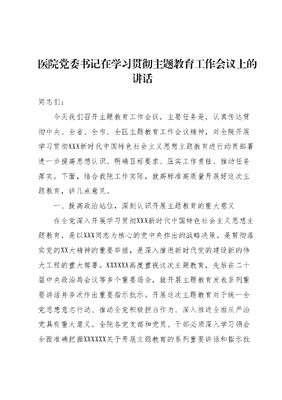 医院党委书记在学习贯彻主题教育工作会议上的讲话同志们:今天我们召开主题教育工作会议,主要任务是,认真传达贯彻中央、全省、全市、全区主题教育工作会议精神,对全院开展学习贯彻XXX新时代中国特色社会主义思想主题教育进行动员部署进一步提高思想认识、明确目标要求、压实工作责任、推动任务落实。下面,结合我院工作实际,就高标准高质量开展好这次主题教育,讲几点意见。一、提高政治站位,深刻认识开展主题教育的重大意义在全党深入开展学习贯彻XXX新时代中国特色社会主义思想主题教育,是以XXX同志为核心的党中央作出的战略决策,是贯彻落实党的XX大精神的重要举措,是深入推进新时代党的建设新的伟大工程的重大部署。XXXXXX高度重视这次主题教育,先后在二十届中央政治局会议等多个重要场合,就开展主题教育发表系列重要讲话并多次作出重要指示批示。开展这次主题教育对于统一全党思想意志行动、推动全党积极担当作为、深入推进全面从严治党具有重大意义。全院各党支部和党员、干部必须深入学习领会全面准确把握XXXXXX关于开展主题教育的系列重要讲话和指示批示精神,迅速把思想和行动统一到中央决策部署和省委、市委、区委工作要求上来,自觉把主题教育作为当前一项重大政治任务精心筹划、严密组织,扎实开展好这次主题教育。二、对标对表,准确把握主题教育的目标任务要求XXXXXX的重要讲话和中央《意见》,对开展好这次主题教育作出了明确具体要求。我们要结合医院实际,紧紧围绕主题教育的根本任务、具体目标,对标对表,确保主题教育不虚不偏。一是总要求。这次主题教育的总要求是学思想、强党性、重实践、建新功,要将其作为一个紧密联系、相互贯通、内在统一的整体,贯穿主题教育的全过程。学思想,就是要全面学习领会新时代中国特色社会主义思想,自觉用新时代中国特色社会主义思想指导各项工作。强党性,就是要自觉用新时代中国特色社会主义思想改造主观世界,始终保持共产党人的政治本色。重实践,就是要自觉践行新时代中国特色社会主义思想,积极解决医院改革发展中的难题、群众看病就医中遇到的急难愁盼问题,以及党的建设中存在的问题。建新功,就是要从新时代中国特色社会主义思想中汲取奋发进取的智慧和力量,不断提高履职尽责、干事创业的能力和水平,努力创造经得起历史和人民检验的实绩。二是根本任务。这次主题教育的根本任务是坚持学思用贯通、知信行统一,把XXX新时代中国特色社会主义思想转化为坚定理想、锤炼党性和指导实践、推动工作的强大力量,使全党始终保持统一的思想、坚定的意志、协调的行动、强大的战斗力,努力在以学铸魂、以学增智、以学正风、以学促干方面取得实实在在的成效。准确把握这一根本任务,是确保主题教育扎实开展取得实效的基本前提。围绕这一根本任务,我们要更加自觉在真学真信真用、学懂弄通做实XXX新时代中国特色社会主义思想上下功夫,着力解决理论学习、政治素质、能力本领、担当作为、工作作风、廉洁自律等方面的问题。三是具体目标。这次主题教育的具体目标是凝心铸魂筑牢根本、锤炼品格强化忠诚、实干担当促进发展、践行宗旨为民造福、廉洁奉公树立新风,体现了我们党对新时代党员干部思想政治、能力、作风、廉政等方面的基本要求。对于我们医疗机构就是教育引导全体党员、干部坚定对马克思主义的信仰、对中国特色社会主义的信念,切实增强四个意识、坚定四个自信、做到两个维护,不断增强纪律意识、规矩意识,持续纠治四风,以人民为中心的发展思想、时时放心不下的责任感、积极担当作为的精气神,为党和人民履好职、尽好责。三、聚焦重点,有效推进主题教育扎实开展要结合工作实际,落实重点措施,有力有序有效推进主题教育深入扎实开展。一是学习提升。扎实抓好主题教育,要坚持读原著学原文悟原理,坚持多思多想、学深悟透,原原本本一篇一篇的学习党的XX大报告、党章、《XXX著作选读》和《XXX新时代中国特色社会主义思想专题摘编》等指定书目,全面学习领会XXXXXX关于卫生健康工作的重要讲话,深入学习XXXXXX对山东工作的重要指示要求以及关于做新时代泰山挑山工的重要论述,认真学习中国式现代化理论,全面学习领会XXX新时代中国特色社会主义思想的科学体系、精髓要义、实践要求,真正做到学懂弄通。要对提出的新理念、新思想、新战略,对各方面工作提出的具体要求,都要放在整个科学体系中来认识和把握,紧密结合医院工作实际,做到整体把握、融会贯通。二是调查研究。要按照党中央和省委、市委、区委的部署要求,积极教育引导全院党员干部沉下身子了解民情、掌握实情、解剖麻雀,搞清楚问题是什么、症结在哪里,拿出破解难题的实招、硬招。领导班子成员和各科室负责人要带头开展调研,深入服务各环节、各流程、各领域,聚焦看病不放心、就医体验差等群众反映最强烈、最突出的问题,聚焦事业改革发展中的重点难点,建立问