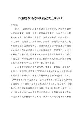 在主题教育读书班结业式上的讲话同志们:刚才,XX同志对此次读书班进行了总结讲评,总结的很到位讲评的有深度,希望大家要认真吸收并落实好,为办好此次主题教育读书班,我们结合工作实际,克服工学矛盾,以领读领学、个人自学、视频学习、交流研讨、主题党日活动等多种形式,统筹兼顾安排好主题教育学习。通过坚持规定动作和自选动作相结合,推动主题教育学习与中心工作深度融合、互促互进,切实有效解决了工学矛盾,既确保将党中央和市委对主题教育工作要求落到实处,为推动主题教育各项工作的开展筑牢坚实的思想基础又将主题教育与中心工作融为一体、良性互动。此次读书班牢牢把握学思想、强党性、重实践、建新功总要求,围绕深入学习贯彻XXX新时代中国特色社会主义思想主线参训学员们原原本本、逐字逐句地研读了党的XX大报告、党章、《XXX著作选读》等必读书目,引导全体党员干部全面深入学习领会XXX新时代中国特色社会主义思想的科学体系、核心要义、实践要求。学员们紧扣每期的学习内容,开展10次集中研讨交流,人人上讲台谈体会,有效促进理论武装头脑。主题教育读书班既是一次全面的政治教育和理论熏陶,更是一次深刻的思想淬炼和精神洗礼,学习效果明显,取得预期成效。我们要以此次主题教育读书班为契机,引导培塑党员干部形成良好的常态化、长效化学习习惯,通过真学、真信、真用推动工作实践,以XXX新时代中国特色社会主义思想的世界观和方法论深入检视问题,结合实际开展调查研究,把问题找准,把措施定实,切实把存在的问题解决掉,真正使主题教育内化于心、外化于行、转化为果,促进全市实现高质量发展。在今后的工作中,我们要做好以下三个方面下功夫:一要在理论武装上下功夫。各单位党委理论学习中心组要召开专题会议,研究XXX新时代中国特色社会主义思想主题教育常态化学习计划,坚持党组示范带动学、党支部集中深入学、教育基地实践学、读书班研讨交流学、搭建平台自主学,分层级开展专题学习培训研讨,要让每个干部上台开展交流研讨发言,通过学习夯实理论根基,深刻认识开展主题教育的重大意义,切实把思想和行动统一到党中央决策部署上来,更加自觉地以XXX新时代中国特色社会主义思想引领实践。二要在真抓实干上下功夫。一是将开展主题教育与业务工作紧密结合,推动各项工作走深走实。要深入组织开展齐心协力学思想真抓实干强素质专题学习实践活动,着力提升综合能力素养,为完成专项任务做好充分准备。二是统筹民生事项清单,多措并举,坚持问题导向,立足群众需求,真心实意为群众办好事、办实事、解难题,不断增强人民群众的获得感、幸福感、安全感。三是以主题教育为契机,开展读书分享会,通过阅读不断增进知识、锤炼本领、提升技能,在阅读中成长。以阅读凝聚奋进力量,以知识提升履职能力,砥砺品质、涵养品德。四是认真落实调查研究深、实、细、准、效五字要求,按照2023年度调研计划和深入开展调查研究实施方案,统筹抓好调研工作,提升调研质量。三要在言传身教上下功夫。具体落实好以下工作:一是要举办好拍出精彩,展示风采主题摄影展等活动,展示党建和清廉机关建设成效;二是要召开好青年干部座谈会,通过畅谈工作中发现的问题,提出转型发展的建议;三是要发动宣传引擎,大力营造学习贯彻XXX新时代中国特色社会主义思想主题教育的浓厚氛围,分别在办公区醒目位置悬挂标语条幅,并利用微信群等载体进行广泛宣传,将主题教育春风细雨、润物无声地滋润到每位职工心中;四是要认真系统梳理调查研究发现的问题、推动事业高质量发展遇到的问题、干部职工群众反映强烈的问题、巡视巡察和审计监督发现的问题,编制问题清单,实行动态管理。同志们,主题教育是我们必须完成好的重要政治任务,我们要坚持围绕中心、服务大局,把开展主题教育同推进高质量发展结合起来,做到两手抓、两促进,努力展现新的作为。