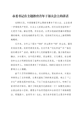 市委书记在主题教育青年干部大会上的讲话在XXX之际,市委隆重召开主题教育青年干部大会,主旨是进一步唱响共产党好、社会主义好的主旋律,动员各级党组织和广大党员干部,解放思想,开拓奋进,以更加饱满的热情和顽强拼搏的精神,创造性地做好各项工作,在新的历史起点上推进XX跨越崛起。近年来,全市上下紧扣XXX的主题和XX的主线,围绕发展抓党建,抓好党建促发展,扎实开展创先争优和基层组织建设年活动,凝聚全市人民的智慧和力量,强力推进城乡融合、乡村振兴,全市经济建设、政治建设、文化建设、社会建设和生态文明建设取得了前所未有的长足进展,一批重大项目相继落地开工,为XX发展奠定了牢固基石,XX的区域竞争力和对外影响力大大增强。前不久召开的XXXX全会,站在新起点,面向新未来,对我全市XX作出了总体部署,全景式描绘了XX的美好蓝图,确立了三步走的路线图和时间表,下达了攻坚决战的动员令,吹响了全面进军的冲锋号,揭开了XX发展历史崭新的一页!如期完成XX全会提出的奋斗目标,需要全市各级党组织和全体党员干部励精图治、顽强战斗、奋发作为!在此,我代表市委提几点要求和希望与大家共勉。第一,要有抓铁有痕的实干精神。天下大事必作于细,古今事业皆成于实。推进XXX现代化大业,来不得半点虚假,需要全体党员干部以抓铁有痕、踏石留印的劲头,在细微处下功夫,在落实上求突破,一步一个脚印推进各项工作。要求真务实。空谈误国,实干兴邦。求真务实是共产党人的基本政治品格。每一名党员干部尤其是领导干部,要少坐在台上发号施令,多联系实际抓具体工作;要少在文山会海中圈圈点点,多深入一线解决问题;要少在电话里遥控指挥,多深入现场督导检查;要坚持讲真话、动真格,力戒汇假报、玩假打;要少讲些成绩和功劳,多找些差距与不足,真真切切把情况吃透,扎扎实实把工作干好。要雷厉风行。坐而论道、纸上谈兵,只会错失发展良机,贻误党和人民的事业。干是天职,会干是能力,快干是水平,只有快干才能争上游,只有快干才有大发展。要大力弘扬立说立行、紧抓快办的作风,养成高效率、快节奏的干事习惯;要放开胆子、迈开步子,知难而上不言难,迎难而上不避难,克难而上不畏难,扑下身子抓,顶着压力冲,甩开膀子干,在快干中体现价值,在快干中追赶跨越。要一抓到底。当前,XX正处于为跨越崛起蓄势集力的紧要关头,正处于XX现代化的关键阶段,我们的工作不能有半点闪火。要俯下身、沉住气、向前看,对集体议定的事情不当品头论足的说客、冷眼旁观的站客,始终保持政令畅通、一杆到底;对正在做的事情,决不能瞻前顾后、裹足不前决不能虎头蛇尾、半途而废,必须善始善终、一抓到底,不达目的不罢休,确保真正见到实效。第二,要有过关斩将的拼搏精神在XXX新征程中,我们必定会面临更多的矛盾和困难、承受更大的压力和挑战、付出更多的艰辛和汗水。全体党员干部必须保持昂扬的斗志,背水一战,砥砺前行,才能不断开创新局面、跃上新台阶。要有永不服输的拼劲。雄关漫道真如铁。推进XXX,我们还有很多的关口未攻破,还有很多的困难未征服,要视落后为耻辱,勇担奋起直追的责任,始终保持蓬勃向上、开拓进取的豪情锐气;要视困难为考验,增强敢于亮剑的勇气,敢出新招善用奇兵;要视挑战为机遇,点燃创业激情,迸发创新灵感,在应对挑战中实现跨越提升。要有不惧艰险的闯劲。无限风光在险峰。凡事因循守旧、中规中矩、畏首畏尾,不敢想、不敢试、不敢闯,工作没有新进展,创业没有新路子,发展没有新局面,我们就会沦为守摊混饭的平庸之辈,永远看不到山巅的风光。要实现弯道超车、跨越崛起,树好XX的全新形象,必须坚持闯字当头,不怕冒险,不怕吃苦,不怕担责,用新理念深化认知,用新视野捕捉机遇,用新思维推进发展,奋力闯出一片新天地。要有锲而不舍的韧劲。事业永无止境,发展鲜有坦途。做学问打破沙锅问到底方能获取真知,干事业咬定青山不放松方能赢得成功,新XX的发展已经有了良好的开端,我们必须本着对人民负责、对事业负责、对历史负责,冲破重重阻力,承受超常压力,始终坚持不动摇、不懈怠、不折腾,不断积蓄和扩大发展优势,加快实现从原地起立迈向发展起跳。第三要有与时俱进的创新精神。世界眼光、战略思维和创新精神,是共产党员和领导干部必备的现代素质。创新精神是时代意识的反映,是人类最具活力的行为,也是优秀领导者的显著标志。观念要有现代性。有时髦的穿着打扮不代表有先进的思想观念;思想观念的落后是我们最大的落后。各级党员干部必须把解放思想作为一场硬仗来打,自觉把思想认识从那些不合时宜的观念、做法和体制中解放出来,从对科学发展理论的教条式理解中解放出来从主观主义和形而上学的桎梏中解放出来,使我们的头脑富有现代思维、手艺富有现代特质、作品富有现代气派。方法要有科学性。思路决定出路,方法决定绩效。面