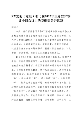 XX党委(党组)书记在2023年主题教育领导小组会议上的安排部署讲话篇同志们:今天,我们召开学习贯彻XXX新时代中国特色社会主义思想主题教育领导小组第六次会议召开。主要目的是,深入学习贯彻XXXXXX关于主题教育系列重要讲话和重要指示批示精神,认真落实党中央、省委部署,市委工作安排,认真总结当前存在的短板弱项、提炼工作经验做法,以点带面、示范带动,确保全区主题教育走深走实。自今年9月中旬,第二批主题教育开展以来,在党中央省委、市委的坚强领导下,在省委巡回督导组和市委主题教育办的有力指导下,全区紧紧围绕开展主题教育的总要求、目标任务和重点措施,坚持高站位谋划、高标准要求高质量推进,各参学单位研究落实快、组织实施细、理论学习真、谋划举措实、纪律作风严,初步实现了良好开局。取得的成绩可喜可贺,在后续的谋划推进过程中,全区各级各部门要站在衷心拥护两个确立、忠诚践行两个维护的政治高度,进一步提高政治站位、深化思想认识,谋划好、组织好、推进好主题教育,确保在以学铸魂、以学增智、以学正风、以学促干上取得实实在在的成效。同志们,第二批主题教育参加单位和人员范围广、类型多、数量大,对我们的工作提出了新的要求。我们要坚决扛起责任,加强督导,确保各项任务圆满顺利完成。下面,按照区委常委会议的研究,我再讲几点意见。第一,要坚持把责任压力传导链条压的更紧,高标准推进主题教育走深走实。全区各级党委(党组)要扛起主体责任,对标对表把主题教育谋划好、组织好、落实好。要紧盯重点求真求实抓融合有效。狠抓理论学习,强化规律性总结、系统性集成、穿透性研究、实践性思考。主题教育领导小组成员单位要充分发挥职能作用,协调联动、形成合力。各级党委(党组)和主题教育领导小组办公室要严格执行督导组各项指令要求,加强向督导组请示汇报,积极配合做好听取汇报、调阅资料、参会服务等各项工作,推动理论学习往深里走、往实里走;狠抓调查研究,深入开展专项调研、重大改革项目调研、典型案例解剖式调研、基层调研、包案接访和带案下访,把调查研究做实做细,高标准完成督导组交办的工作任务。第二,要坚持把协同机制畅通得更有序,高成效推动主题教育走深走实。要坚持严格抓细抓实开门搞教育,切实让主题教育成效造福于民,始终遵循中央、省委部署安排,科学合理安排好各项活动,严格对标五个xxx的要求,推动主题教育扎实有序开展;严格对标xxxx的实践要求,开展面对面宣传、实地走访、领导下访、上门服务,切实搞好同第一批主题教育相关工作的承接落实,确保有序推进、有效衔接。要坚持把开展主题教育同贯彻落实党的XX大部署结合起来、同推动高质量发展和现代化建设结合起来,特别是要狠抓推动发展,抓实做好xxx三篇文章,确保学在深处、干在实处.坚持狠抓检视整改,实事求是深挖根源动真碰硬整改问题;狠抓建章立制,将制度不折不扣地落实到具体行动上、体现在实际工作中,真正将制度优势转化为治理效能,做到两促进两不误。第三,要坚持把督导检查体系建设得更加完备,高效能推进主题教育走深走实。全区各级党组织要把抓好主题教育作为履行党建工作主体责任的重要任务,坚决扛起抓好主题教育的政治责任推动主题教育走深走实。要充分加强对主题教育开展情况的督促检查,重点看问题查摆是否动真碰硬、措施安排是否可行有效。要聚焦要点、重点、难点、弱点抓落实,结合工作实际,找出短板弱项,制定措施,确保问题整改到位。在这里我重点强调:要注重实效和质量,对主题教育开展不认真不负责、群众不满意的要督促及时返工补课,不搞花样翻新,坚决防止各种形式主义官僚主义。第四,要坚持把分级分类指导落实得更加有力,高质量推进主题教育走深走实。要紧盯要点往深往实,抓衔接有序,紧盯难点抓细抓实,抓推进有序,严格对标主题教育的总要求,将学思想、强党性、重实践、建新功贯穿主题教育全过程,突出分类指导、精准施策。坚持从实际出发,针对不同层级不同对象实际,强化分类施策,抓细抓实流动党员主题教育;抓细抓实新经济组织、新社会组织和新就业群体党员主题教育;抓细抓实年老体弱党员主题教育;抓细抓实党支部主题教育,防止上下一般粗,确保取得实效。全区各级党委党组织要认真学习领会市委、区委主题教育领导小组会议精神,制定措施抓好落实,努力学出坚定信仰、学出绝对忠诚、学出使命担当。我就讲这么多,谢谢!