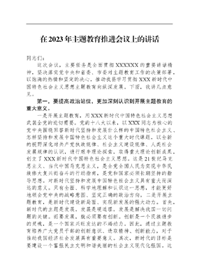在2023年主题教育推进会议上的讲话同志们:这次会议,主要任务是全面贯彻XXXXXX的重要讲话精神,坚决落实党中央和省委、市委对主题教育工作的决策部署,以饱满的热情和坚定的决心,推动我县学习贯彻XXX新时代中国特色社会主义思想主题教育向纵深发展。下面,我讲几点意见。第一,要提高政治站位,更加深刻认识到开展主题教育的重大意义。一是开展主题教育,用XXX新时代中国特色社会主义思想武装全党的迫切需要。党的十八大以来,以XXX同志为核心的党中央围绕回答新时代坚持和发展什么样的中国特色社会主义、怎样坚持和发展中国特色社会主义这个重大时代课题,以全新的视野深化对共产党执政规律、社会主义建设规律、人类社会发展规律的认识,进行艰辛理论探索,取得重大理论创新成果,创立了XXX新时代中国特色社会主义思想。这是21世纪马克思主义、当代中国马克思主义,是全党全国人民为实现中华民族伟大复兴而奋斗的行动指南,是党和国家必须长期坚持的指导思想。对新时代坚持和发展中国特色社会主义具有重大而深远的意义。只有全面、科学地理解和认识这一思想,才能更好地领会党中央的战略意图、坚定正确的政治方向。二是开展主题教育,是新时代建设新局面、实现新发展的强大动力。首先,新时代的主题是发展。发展是硬道理,发展是解决我国一切问题的关键。而要发展,就必须要有创新。创新是一个民族进步的灵魂,是一个国家兴旺发达的不竭动力。因此,通过主题教育培养广大党员干部的创新意识、进取精神、创新能力,对于推动我国经济社会发展具有重要意义。其次,新时代的目标是要建设一个富强民主文明和谐美丽的社会主义现代化强国。这需要我们党领导全国各族人民共同奋斗,需要我们不断提高自身素质和能力水平。通过主题教育,我们可以更好地提高党员干部的思想政治素质和道德水平,增强他们的执行力和领导力,为实现这一目标奠定坚实基础。三是开展主题教育,是全面从严治党、加强党的建设的重要实践。首先,全面从严治党是我们党的根本要求。我们党面临着执政考验、改革开放考验、市场经济考验、外部环境考验和精神懈怠危险、能力不足危险、脱离群众危险、消极腐败危险。只有全面从严治党,才能不断提高党的自我净化、自我完善、自我革新、自我提高的能力。其次,加强党的建设是我们党的根本任务。党的建设包括思想政治建设、组织建设、作风建设、纪律建设和制度建设等方面。通过主题教育,我们可以全面加强党的建设,推动党的建设高质量发展,为实现中华民族伟大复兴的中国梦提供坚强保障。第二,要聚焦工作重点,准确把握主题教育的目标要求和任务举措。一是扎实开展理论学习。我们要深入学习领会XXX新时代中国特色社会主义思想的核心要义、精神实质、丰富内涵和实践要求,通过集中学习、专题研讨和个人自学等多种形式,不断提高我们的理论素养和思维能力。同时,我们还要注重学习效果的考核和检验,确保学有所获、学有所用。二是积极开展调查研究。要结合我县的实际和具体工作,深入基层、深入群众进行调查研究,了解新情况、研究新问题、掌握新规律,为制定更加科学合理的政策和措施提供重要依据。同时,还要注重调查研究的针对性和实效性,及时发现问题并解决问题。三是努力推动高质量发展。要以供给侧结构性改革为主线,全力推进产业升级、创新驱动、绿色发展、改革开放等方面的工作,促进我县经济社会的高质量发展。同时,还要注重创新驱动发展战略的实施,加强科技创新和人才培养等方面的工作。四是认真抓实检视整改。要定期进行自我检视,查找存在的问题和不足,分析原因并制定改进措施。要建立问题清单和整改台账,明确整改时限和责任人,实行销号管理,确保问题得到有效解决。要注重检视整改的针对性和实效性,不断推进工作的改进和完善。第三,要强化保障措施,切实加强主题教育的组织领导。一是加强组织领导。成立主题教育领导小组及其工作小组,明确各层级责任分工和具体任务。制定实施方案和计划,确保各项工作有序推进。同时,我们还要注重协调配合和信息沟通,确保工作顺畅、效果显著。二是强化检查指导。建立定期检查、随机抽查、专项督查等工作机制,及时发现和解决问题。对工作推进不力的单位和个人进行约谈和问责。要注重检查指导的科学性和公正性,确保工作得到客观评价和有效指导。三是坚决杜绝形式主义。形式主义是我们工作中的一大危害,必须坚决反对。我们要始终坚持工作实效为本的原则,注重解决实际问题,摒弃一切形式主义的做法,真正把主题教育落到实处。同时,要注重宣传引导工作的加强,提高广大党员干部的思想认识和理解水平。要加强宣传引导工作,摒弃简单化或者片面化的做法,确保宣传引导工作全方位、多角度、立体呈现。此外,可以通过定期举办交流研讨会的方式,鼓励广大党员干部互相学习借鉴经验教训,及时纠正偏差,提高工作效果!最后,我希望能够充分认识到主题教育的重大意义,刚才我们所讨论的每一个环节的内容都是相互联