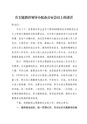 在主题教育领导小组办公室会议上的讲话同志们:今天下午,县委将召开全县学习贯彻XXX新时代中国特色社会主义思想主题教育动员部署会议,对开展主题教育进行全面安排部署。在这个关键时刻,我们召开领导小组办公室全体工作人员会议,主要是进一步统一思想、提高认识、明确任务、靠实责任动员大家以高度的政治自觉、强烈的使命担当、饱满的精神状态务实的工作作风,全身心投入到办公室各项工作中来,为全县主题教育高起点开局、高标准推进、高质量落实提供有力保障。刚才,XX同志宣读了县委主题教育办公室组成人员名单及工作职责,这次抽调的同志,都是各单位经过认真研究推荐,政治可靠、作风过硬、素质优良的干部,也是报县委主要领导同意审定。X月X日以来,大家全力以赴投入前期筹备,加班加点做了大量工作,使全县主题教育迅速启动、开局有力。在此,向大家表示衷心的感谢。同时,也要充分认识到,参与全县主题教育的组织实施,是一份荣誉、一段经历,更是一种历练、一次考验,大家要珍惜难得机会,努力锻炼提高,争创优异成绩,确保全县主题教育全程高质量好效果。下面,我就做好主题教育办公室工作,讲四点意见:一、提高政治站位,统一思想认识,充分认识主题教育的重大意义开展这次主题教育意义重大而深远。县委对这次主题教育高度重视,县委X书记多次提出明确要求,县委常委会专题审议《实施方案》,成立了由县委主要领导任组长的领导小组,研究谋划部署推动各项工作。作为办公室工作人员,一定要提高政治站位切实增强思想自觉、政治自觉和行动自觉,学深悟透、对标落实好各项部署要求,圆满完成县委交给我们的重大政治责任。一要在思想认识上要再提高、再深化。开展主题教育是党的XX大作出的重要战略部署,县委主题教育领导小组办公室承担着组织推动全县主题教育工作的重任,要深刻领会开展主题教育的重大意义和主要考量,珍惜机会、全心投入,以责无旁贷的使命担当、走在前列的目标追求、心无旁骛的奋斗姿态、抓铁有痕的工作作风,切实扛起县委赋予的重责重任,确保全县主题教育工作高起点开局、高标准开展、高质量推进。二要在谋划落实上要再精准、再有效。办公室作为这次主题教育的作战指挥部,要全面掌握战情、准确把握战势、有效统揽战局、精准设计战术,善于从全局出发加强对中央和省市县委部署要求,以及我县实际情况的研究,找准参谋服务的结合点、切入点和突破口,积极主动向领导小组提出意见建议,注重掌握新情况、新问题,为领导小组决策提供参考依据。三要在节奏把握上要再紧凑、再有序。要紧盯中央、省市县委关于主题教育的安排部署和总体要求,把握好工作节奏,努力做到满负荷运转、高效率运行,确保各项工作紧凑有序展开。同时要充分发扬不怕苦、不怕累,连续作战的精神,攻坚克难、甘于奉献,把工作做扎实、做具体、做到位,树立一流标准,坚持精品意识、质量意识,高效推动主题教育活动取得实效。二、认真履职尽责,相互协作配合,切实扛起主题教育的政治责任办公室作为县委主题教育领导小组的日常办事机构,是主题教育领导小组的参谋部、调度室和指挥所,对于保证全县主题教育顺利推进具有十分重要的作用。希望大家以极端负责的精神、严谨细致的态度、务实高效的作风,高标准、严要求做好办公室各项工作。一要明确工作职责。严格落实组长负责制,建立每周工作总结和例会制度,按照各组既定职责和任务,各司其职、各负其责以高度的政治责任感合力抓好各项工作。各组组长要统筹全局,细化人员分工,进一步明确组内人员工作职责,强化工作措施,努力推动各项工作落实。副组长要积极配合组长开展工作,以时不我待的紧迫感和时时放心不下的责任感抓好各项具体工作,确保各项工作任务落实落细、见行见效。各组工作人员要严格服从组长、副组长的安排部署,全力以赴完成各自承担的工作任务。二要细化工作任务。全县主题教育从今天开始全面启动,办公室各工作组要紧盯中央和省市县委要求,对近期工作任务认真梳理细化,确保各项工作有序推进。综合组要处理好领导小组及办公室日常事务,做好各组之间的衔接协调,承办好各类会议服务工作。材料组要认真起草读书班开班式和总结会上的讲话、主要领导的宣讲稿件、研讨材料等。宣传组要高起点研究制定宣传工作方案,重大部署、重点工作、重要节点都要提前策划,周密计划,精心实施,重大会议要在会议结束两小时之内进行宣传报道。要注意特殊情况、特别要求,严防形式主义和低级红高级黑。整改整治组要加强同省市整改整治组之间的联络,抓紧梳理确定专项整治重点任务清单,研究制定整改整治工作计划,指导各牵头单位高标准制定各项专项整治方案,高质量督促抓好突出问题整改整治。联络服务组要做好省委巡回督导组在泾开展工作的服务保障和沟通协调工作,并做好读书班期间的衔接协调、服务工作。三要强化协作配合。办公室处于承上启下的枢纽位置,协调服务的任务很重,也非常重要。大家考虑问题一定要